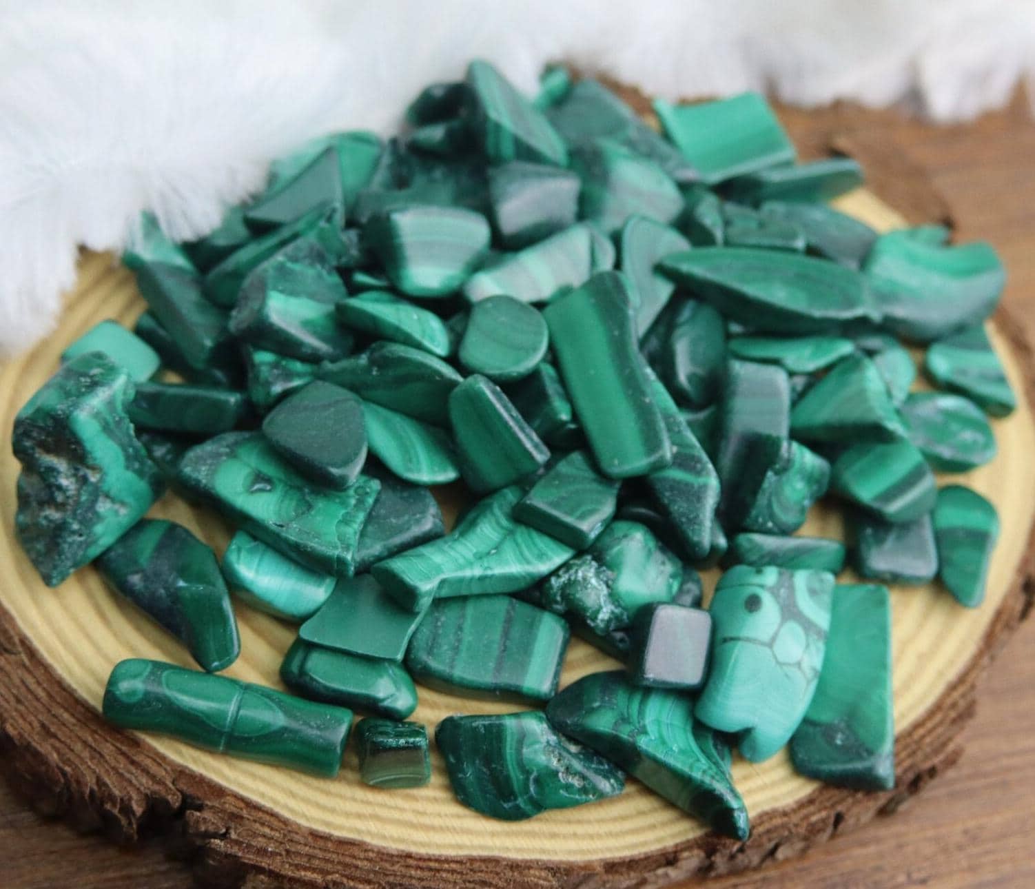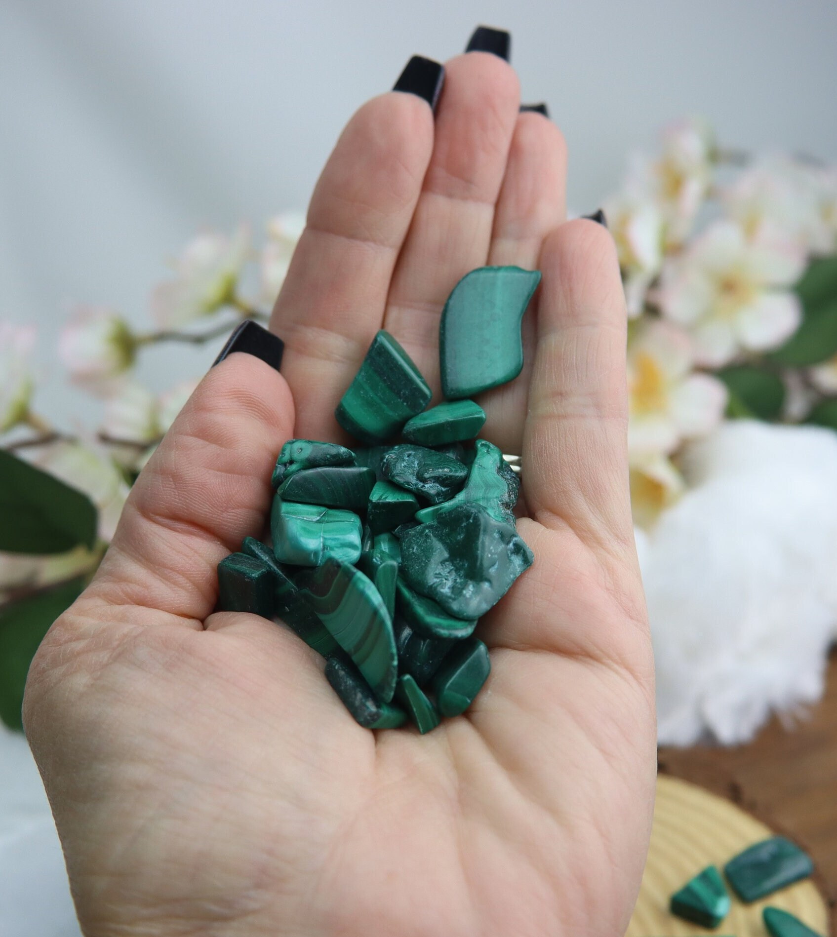 This listing is for 1 (ONE) Bag of Malachite Semi-Tumbled Chips Please choose the weight you would like from the drop down menu