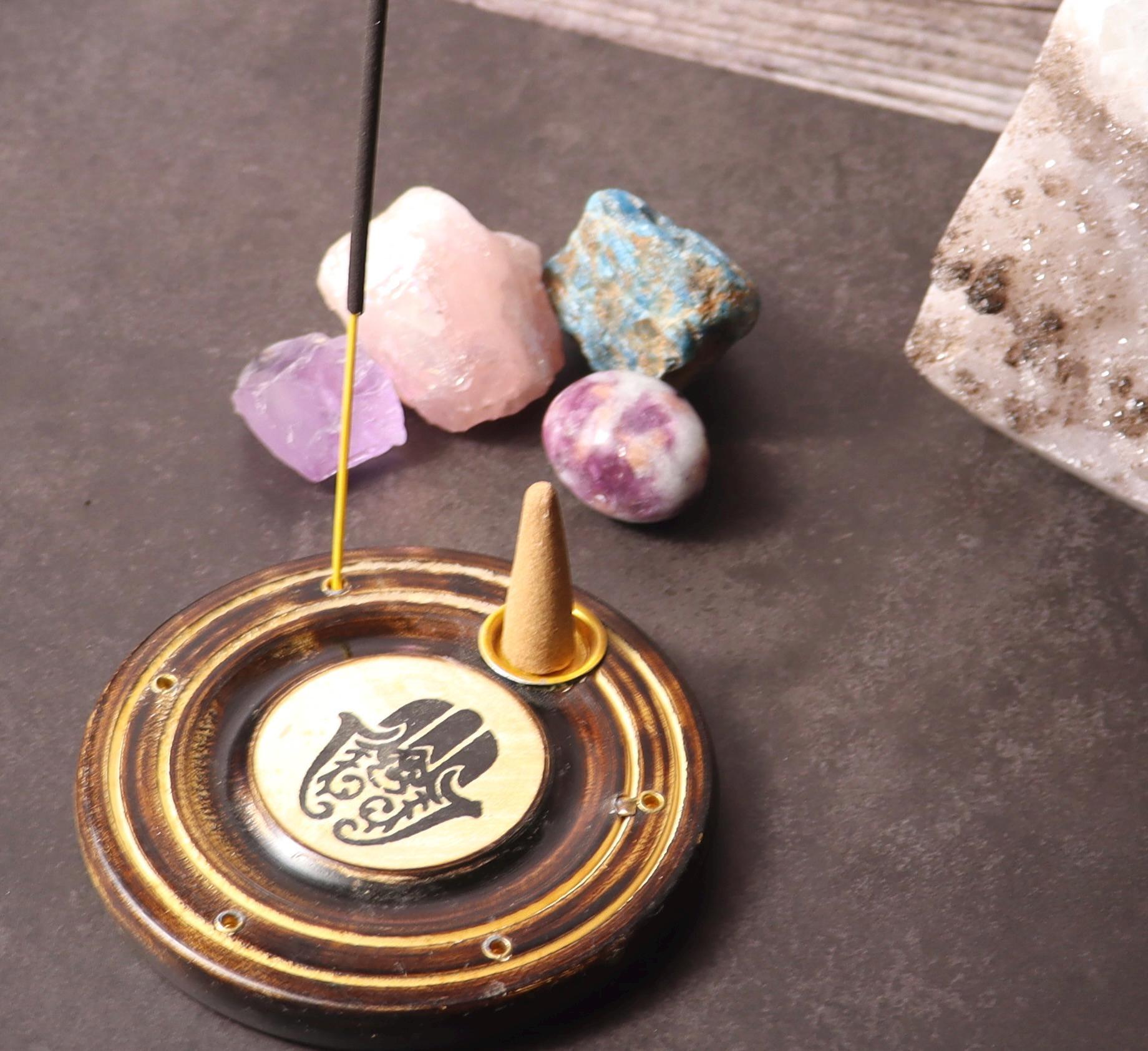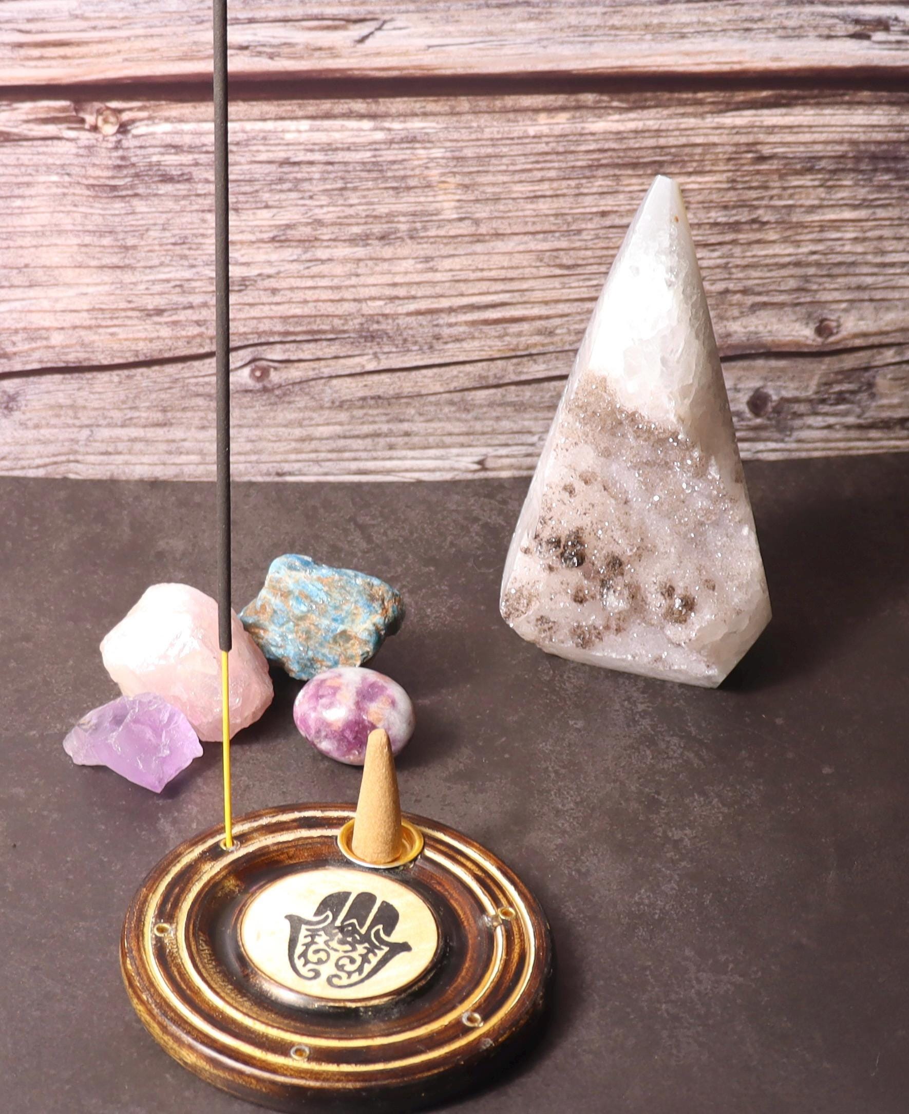 This listing is for ONE (1) Round, Laser Carved Wood Hamsa Incense Burner. Size is about 4" in diameter. This ash catcher will hold both stick incense and cone incense. Will hold 5 incense sticks and 1 cone.
