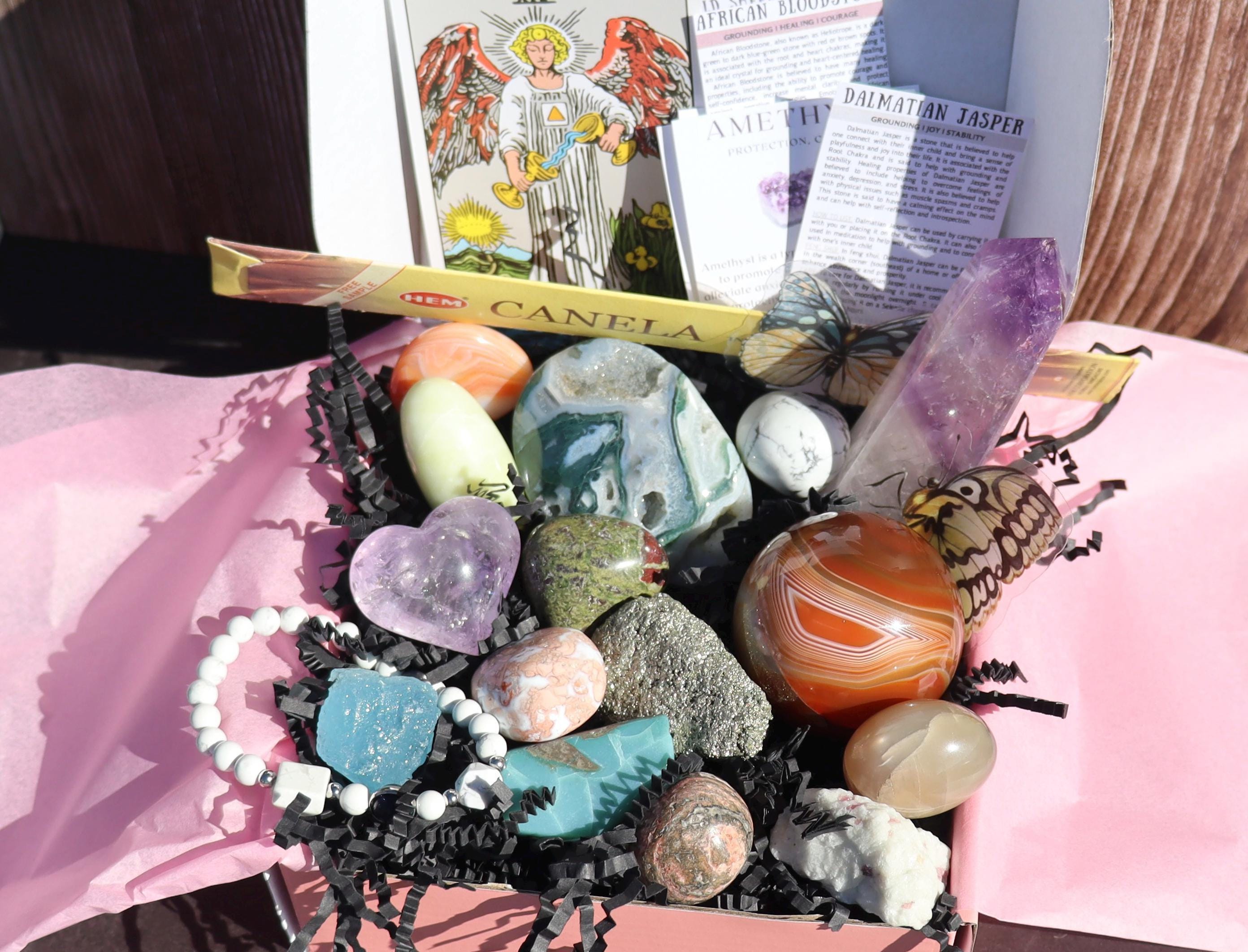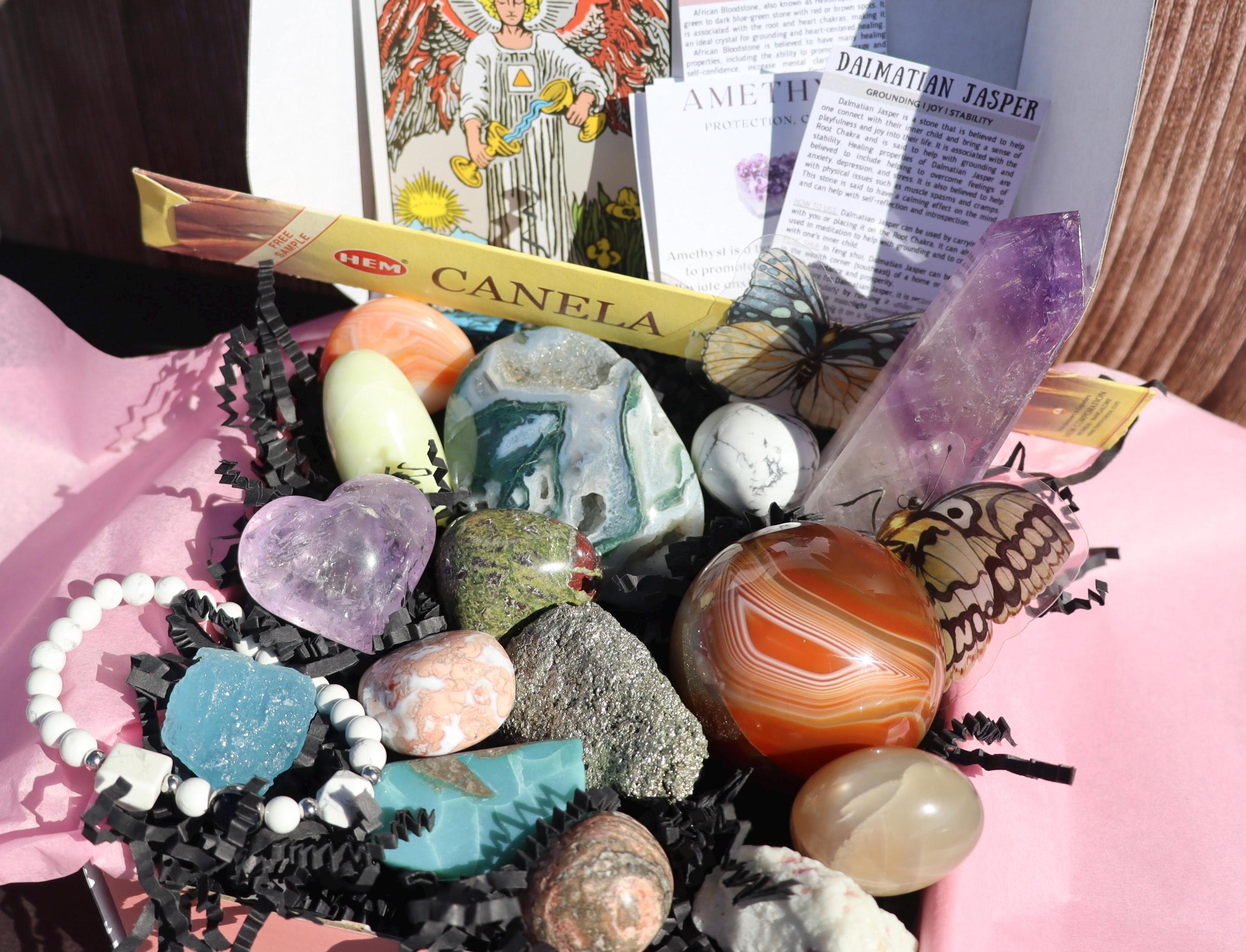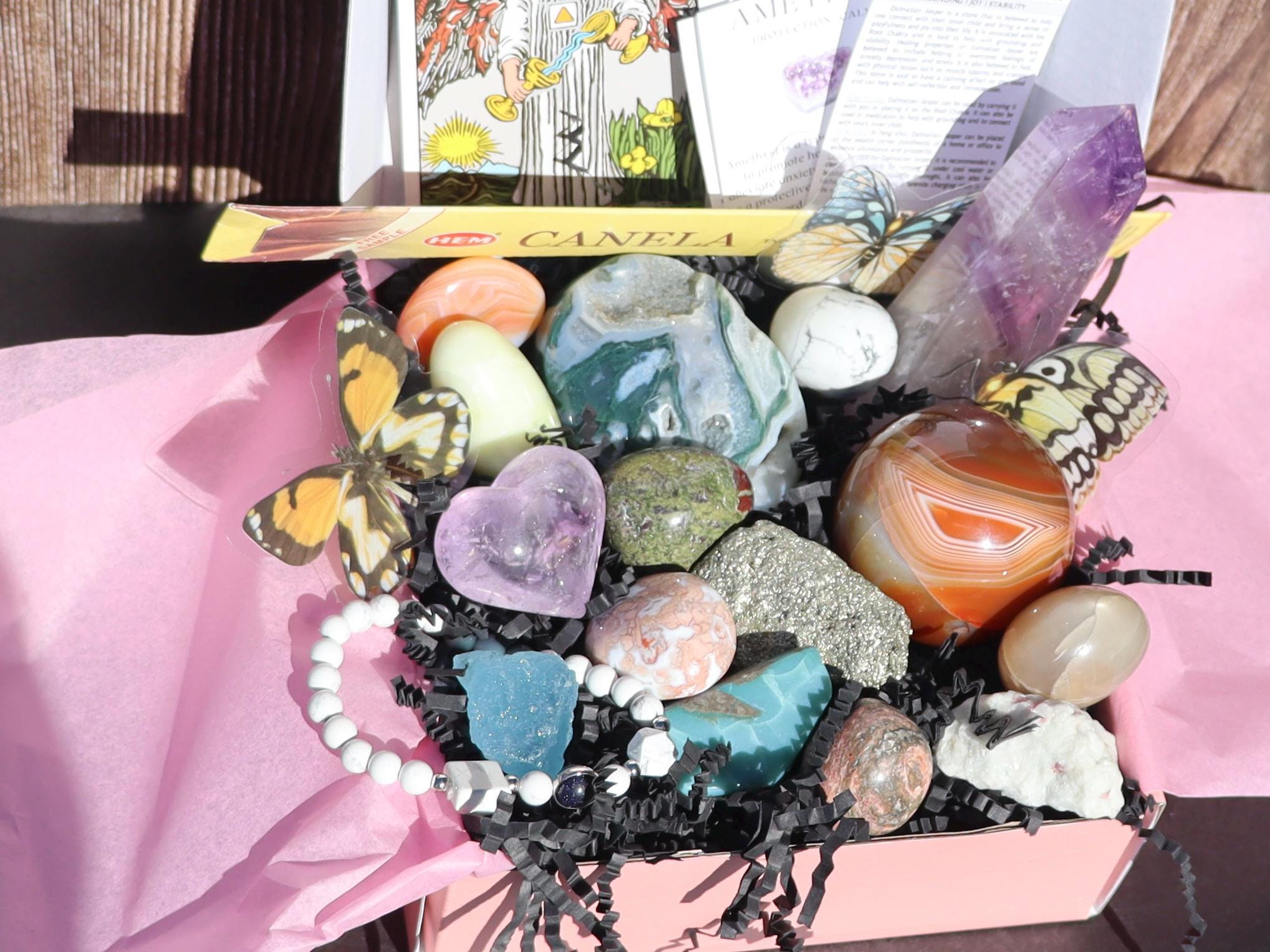 This is a MYSTERY box. Feel free to leave notes of stones, chakra, etc, on what you would like. We will do our best to accommodate certain requests, but nothing is promised. It is a complete mystery!