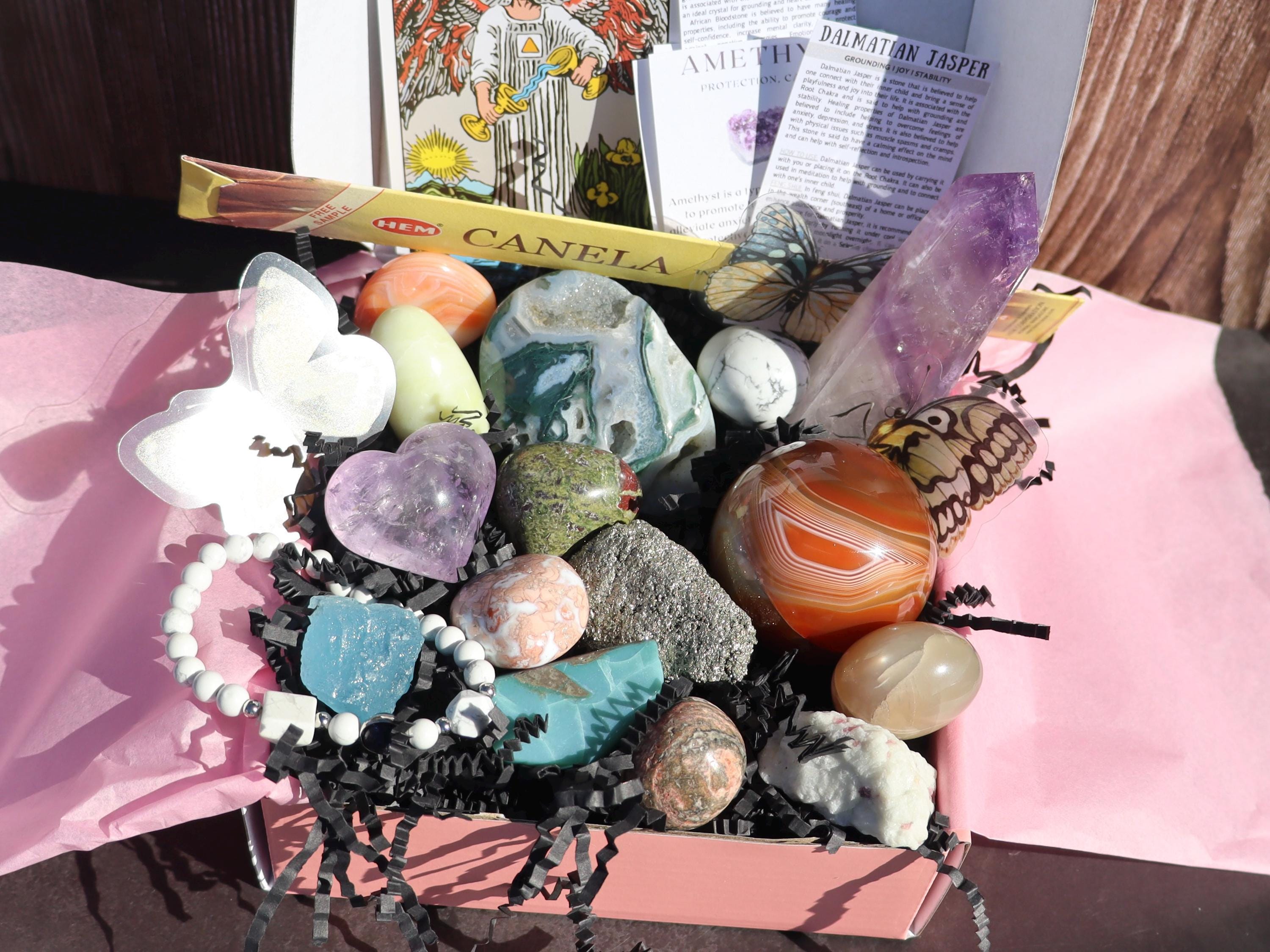 Every box is different! Some of the crystal materials you could find in your Crystal Mystery Box are: