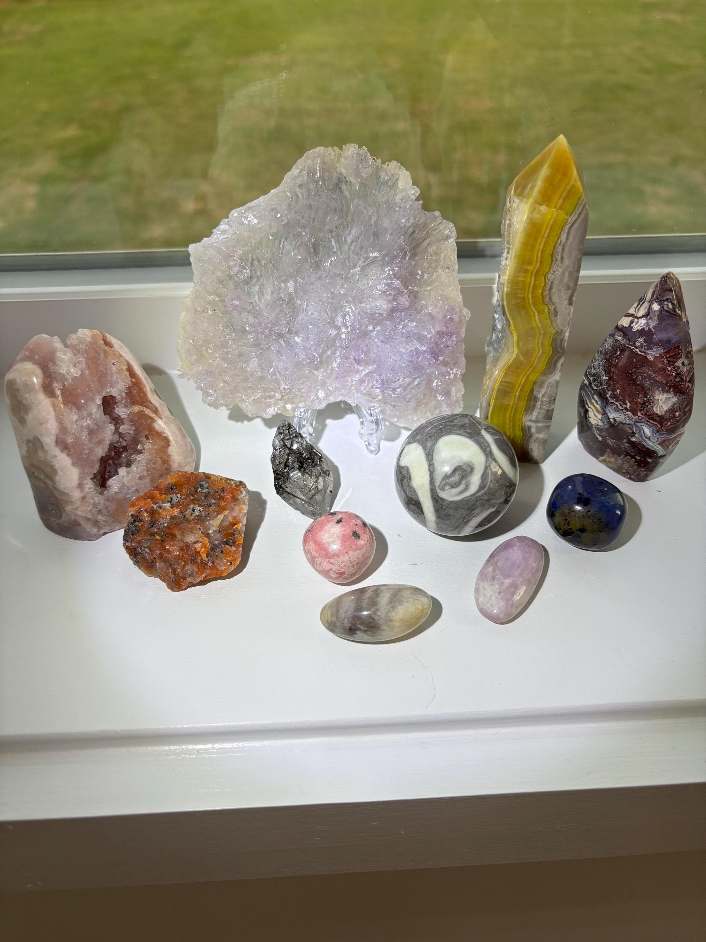 Amethyst, Rose Quartz, Snowflake Obsidian, Green Aventurine, African Bloodstone, Lemon Calcite, Mangano Calcite, Orange Calcite, Citrine, Dragons Blood, Fluorite, Malachite, Labradorite, Lepidolite, Malachite, Obsidian, Ocean Jasper, Opalite, Serpentine, Clear Quartz, Howlite, Strawberry Quartz, Red Tigers Eye, Blue Tigers Eye, Yellow Tigers Eye, Rhodochrosite, Lapis Lazuli, Sodalite, Rhodonite, Moonstone, Kunzite, Crazy Lace Agate, Celestite, Carnelian, Black Onyx, And Many Others! We carry a wide variety of crystals!