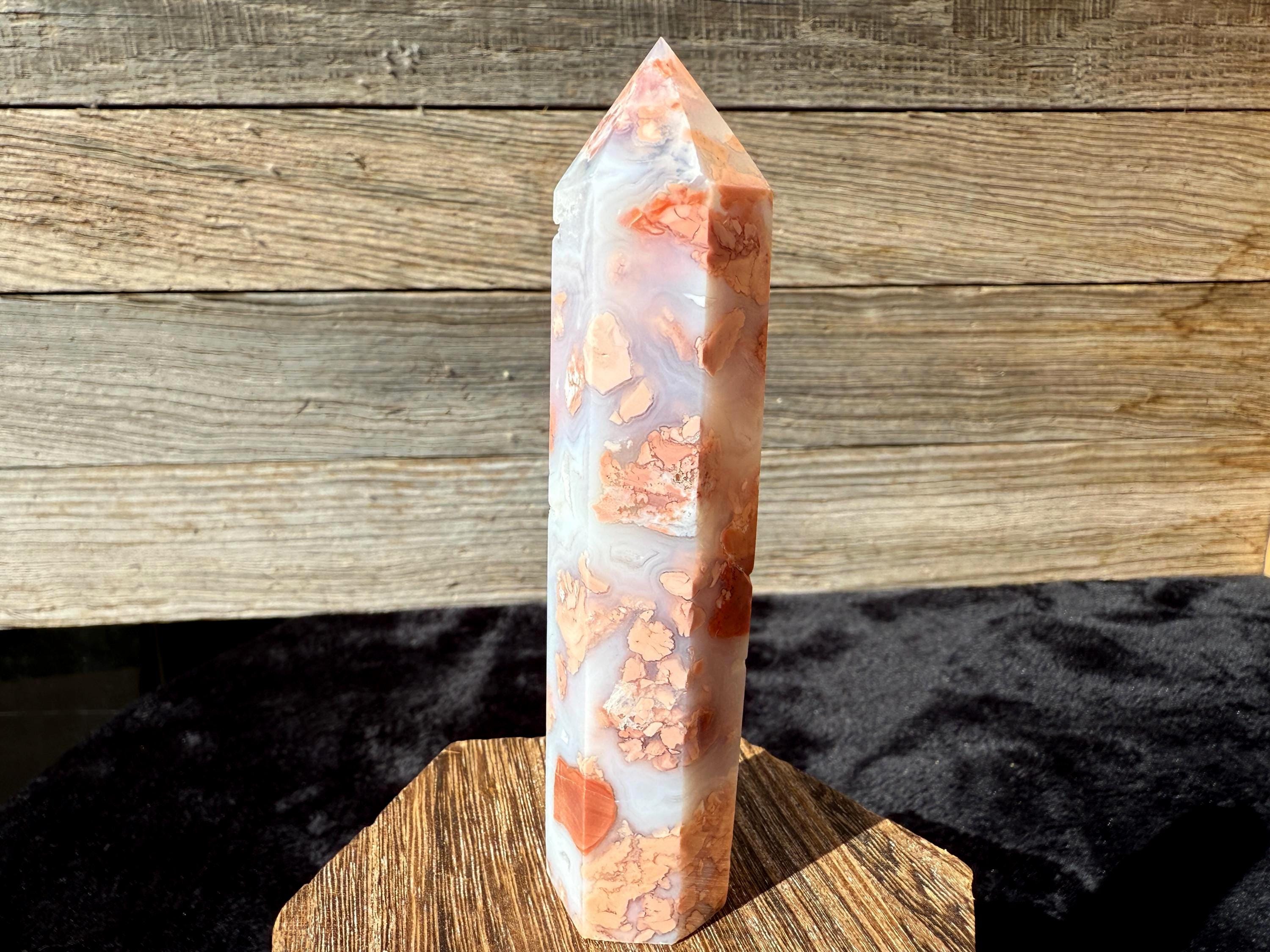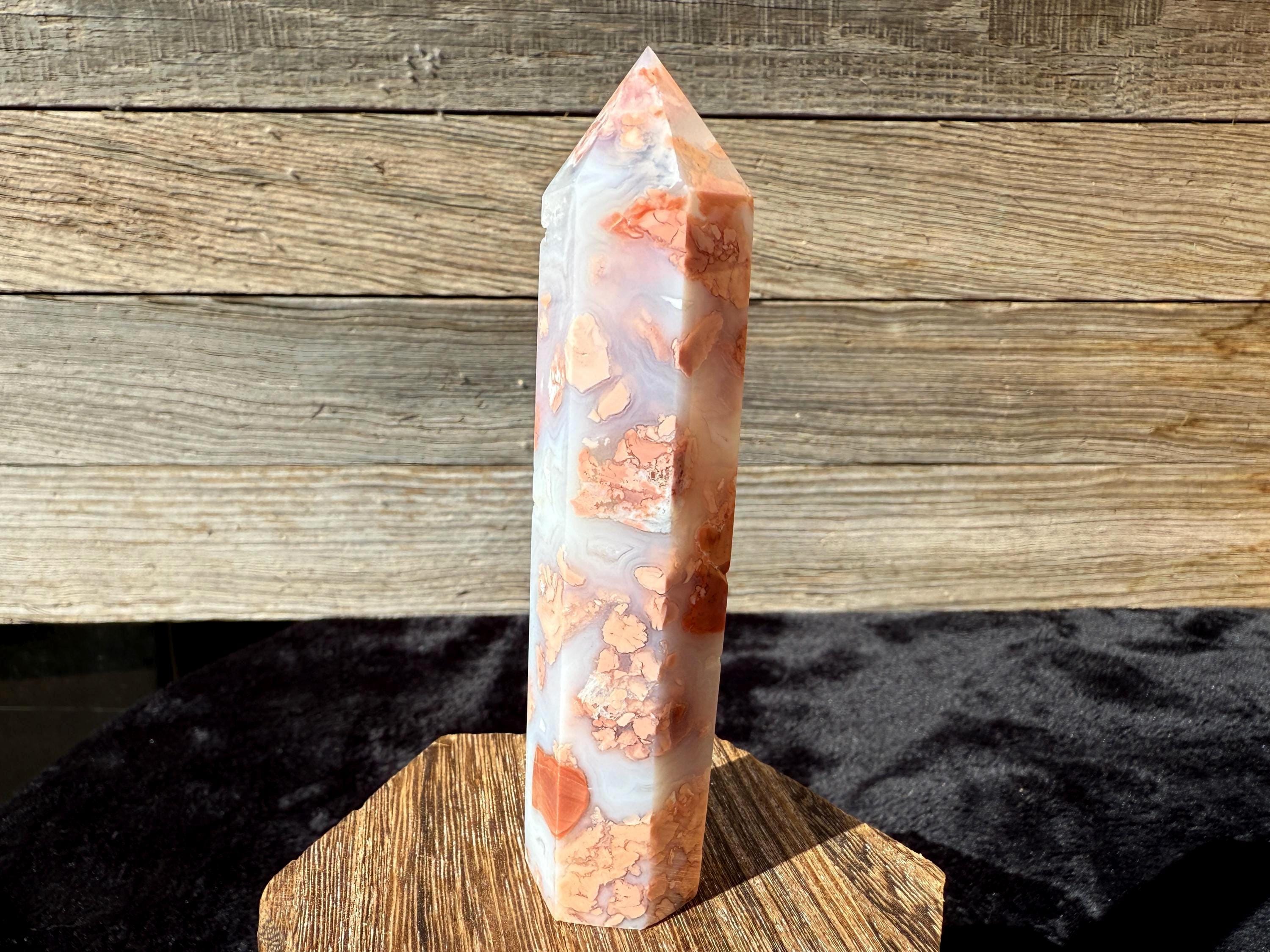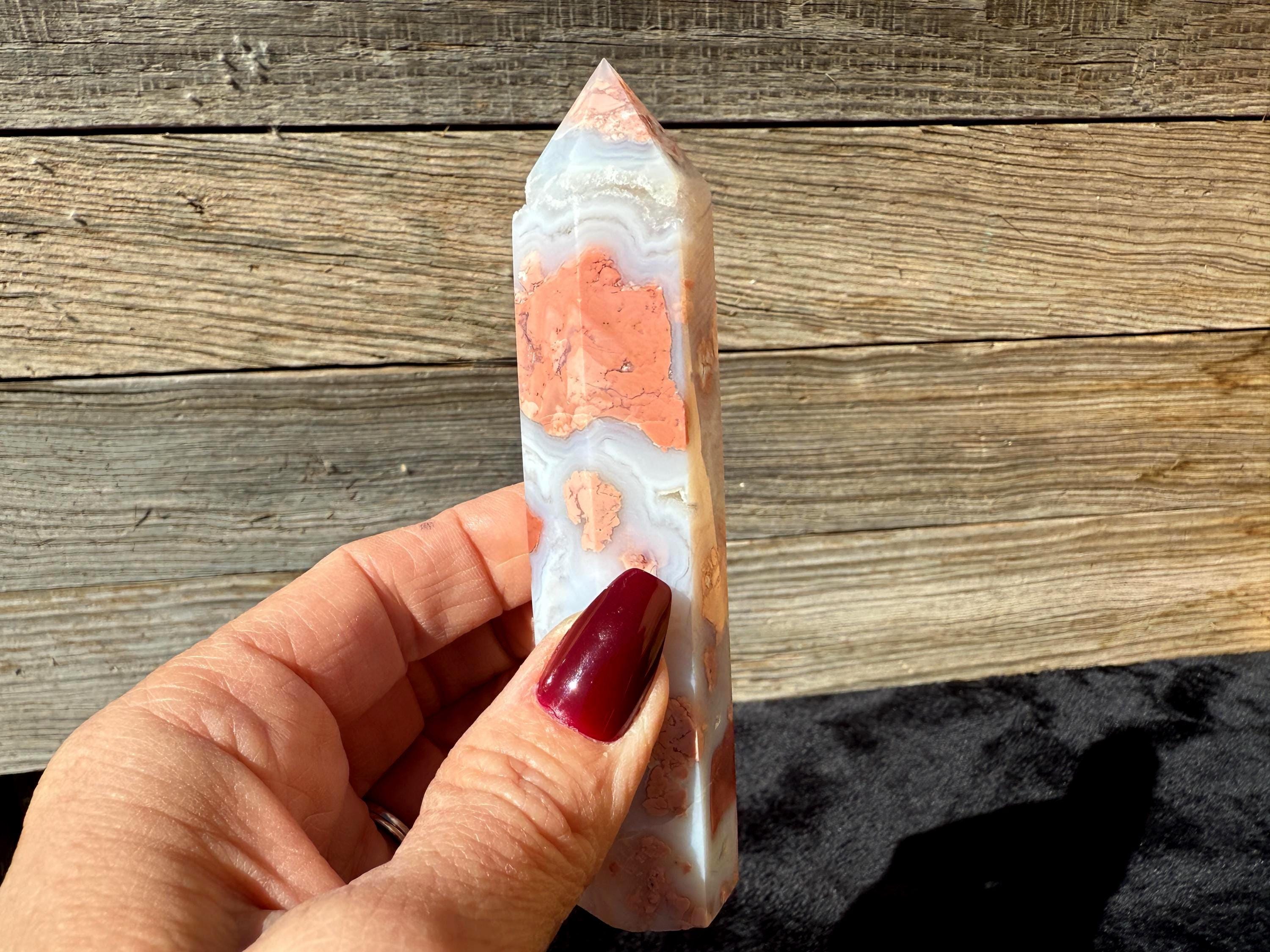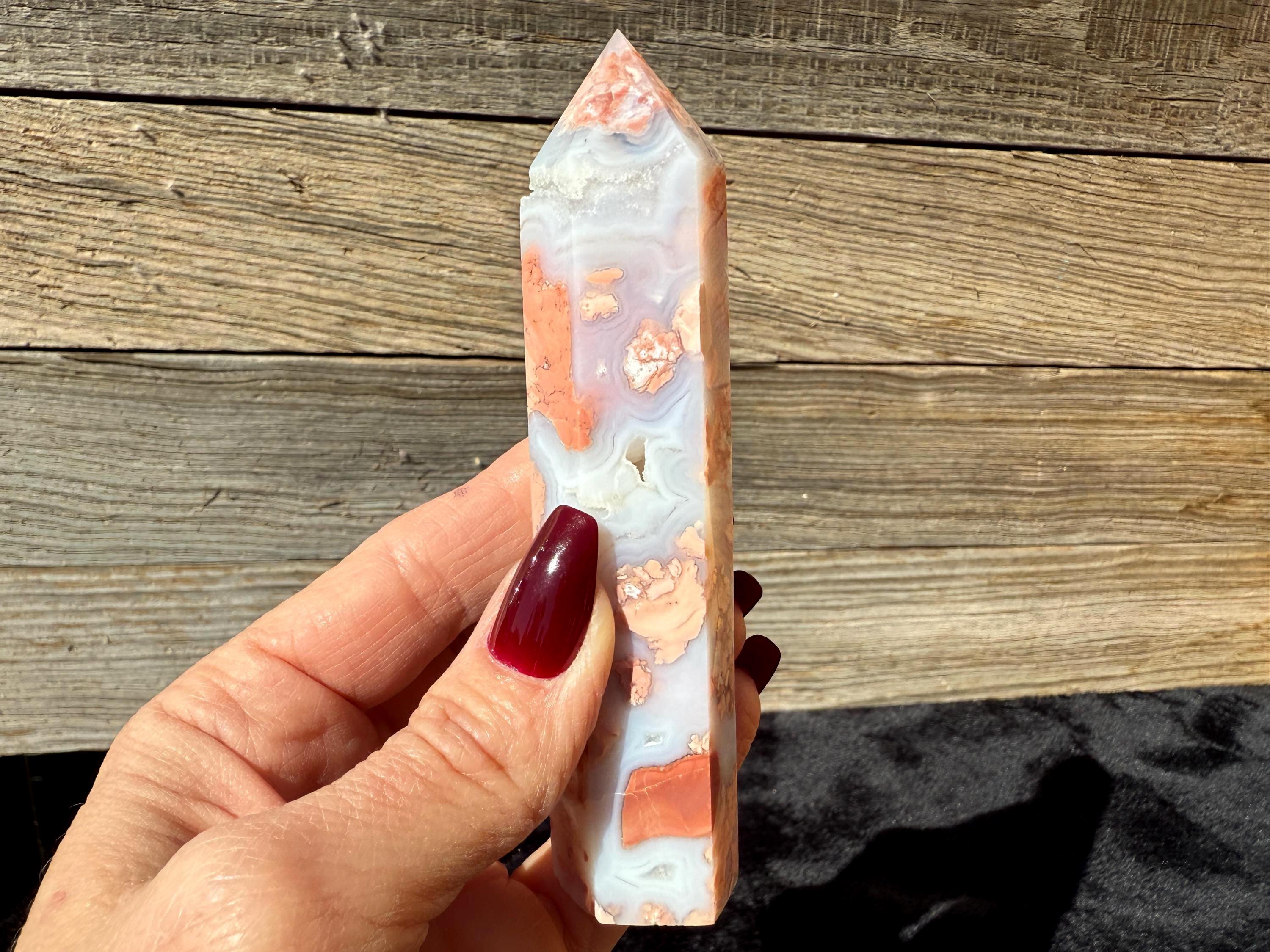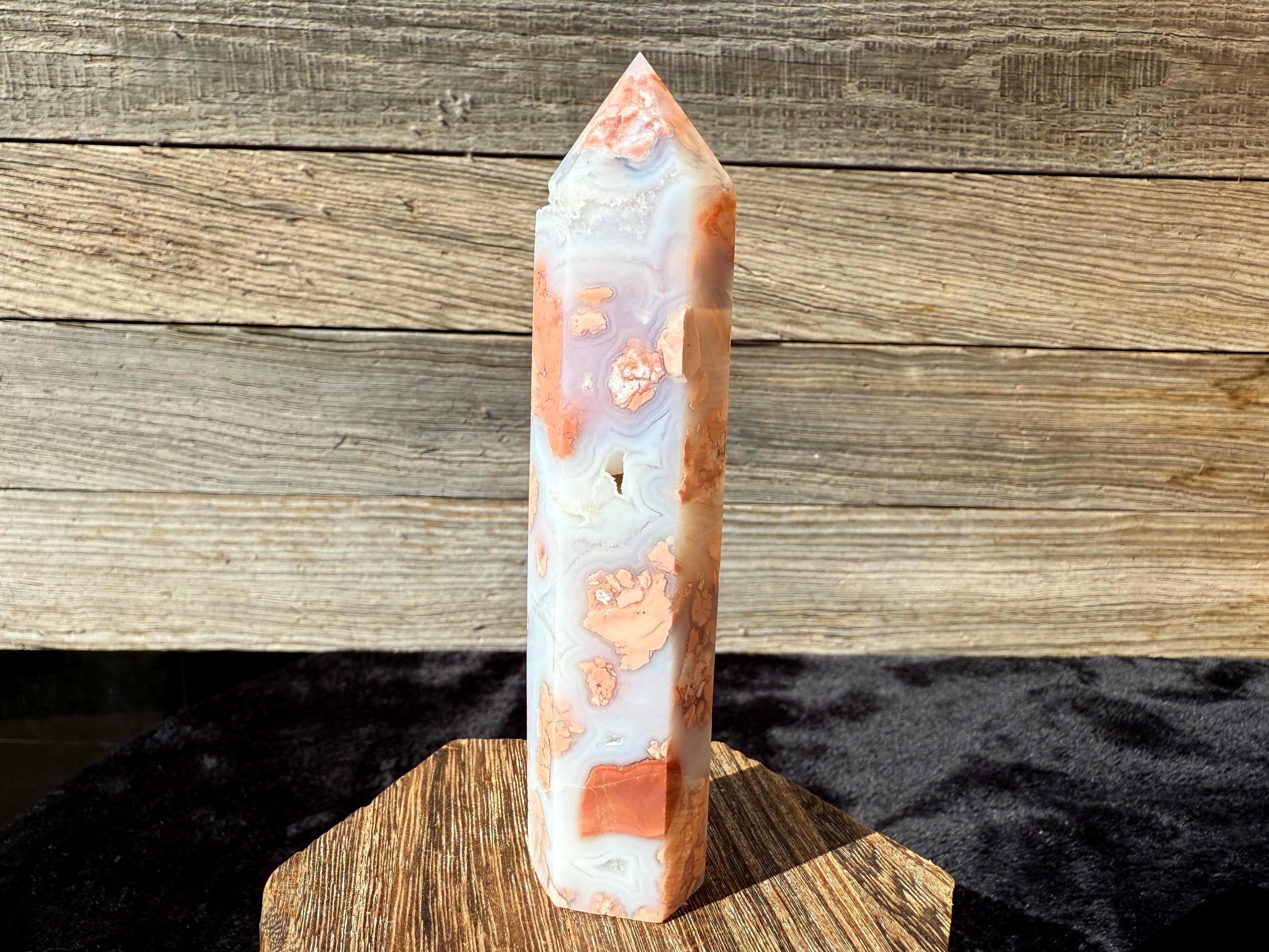Showcasing soft pink and creamy white hues, this Druzy Cotton Candy Agate Tower is a one-of-a-kind piece full of natural charm. Polished to a smooth glossy finish, it features gentle banding and a sparkling druzy pocket that catches the light beautifully. Perfect as a display piece, décor accent, or thoughtful gift for any crystal lover.
