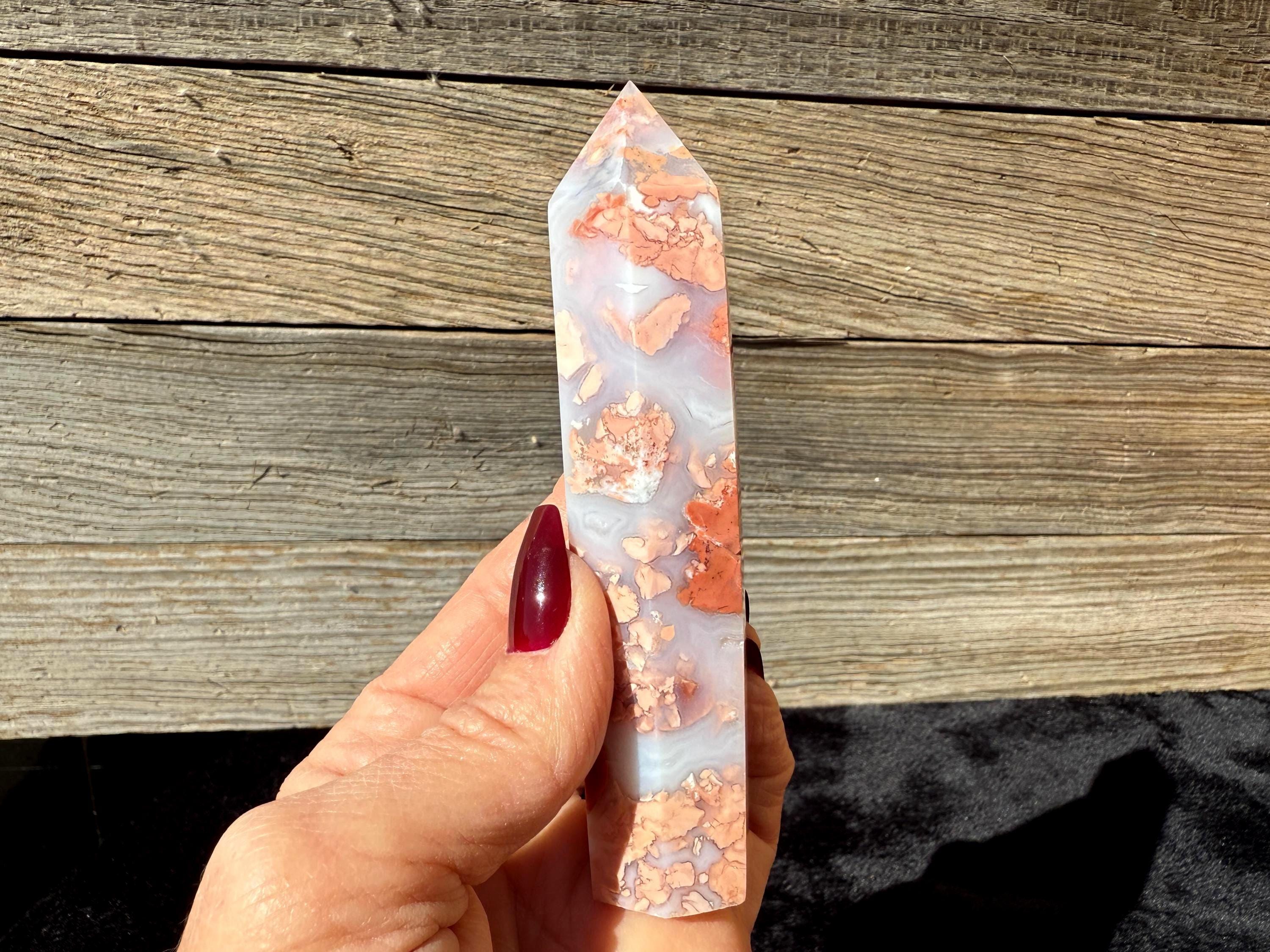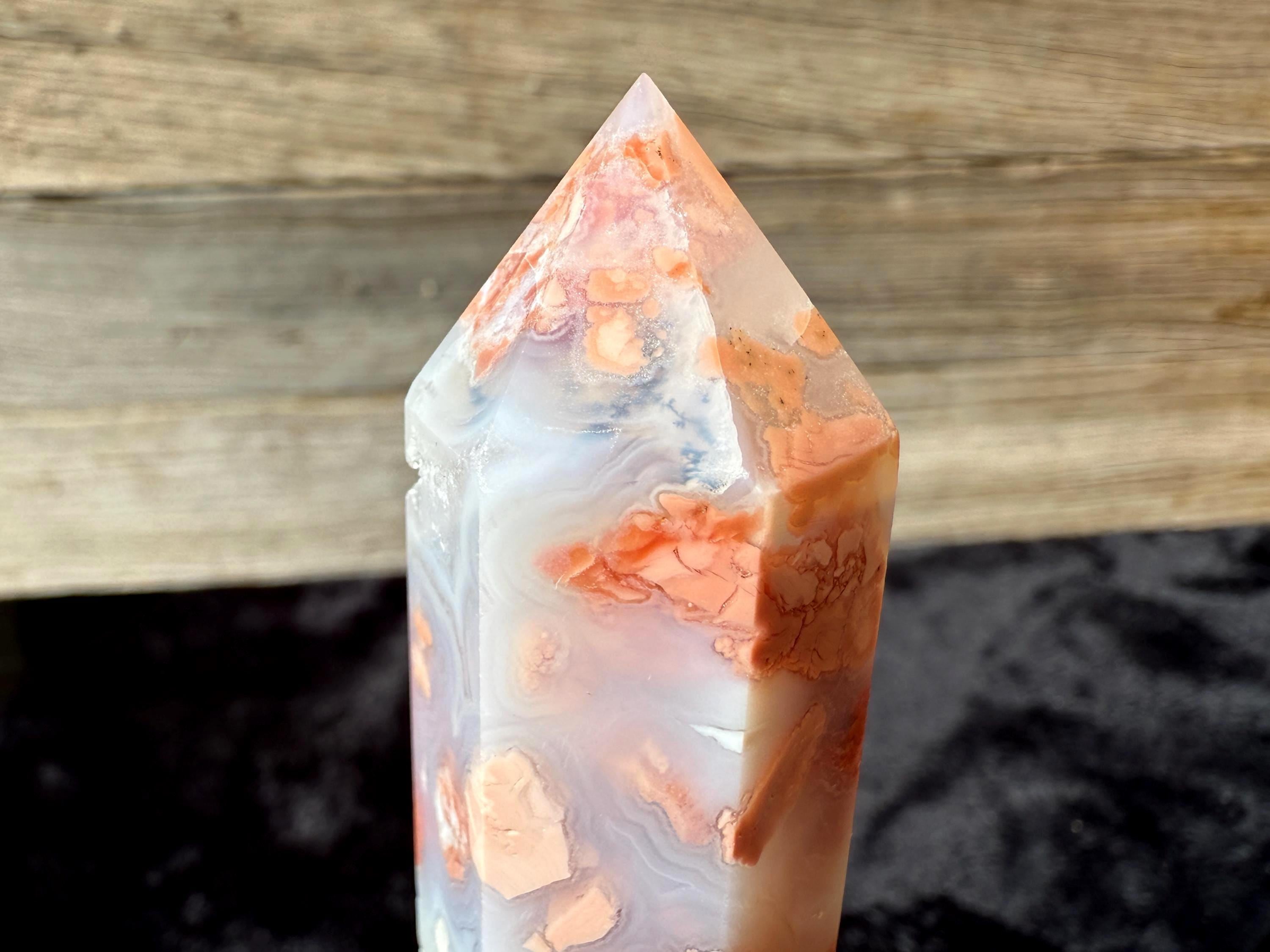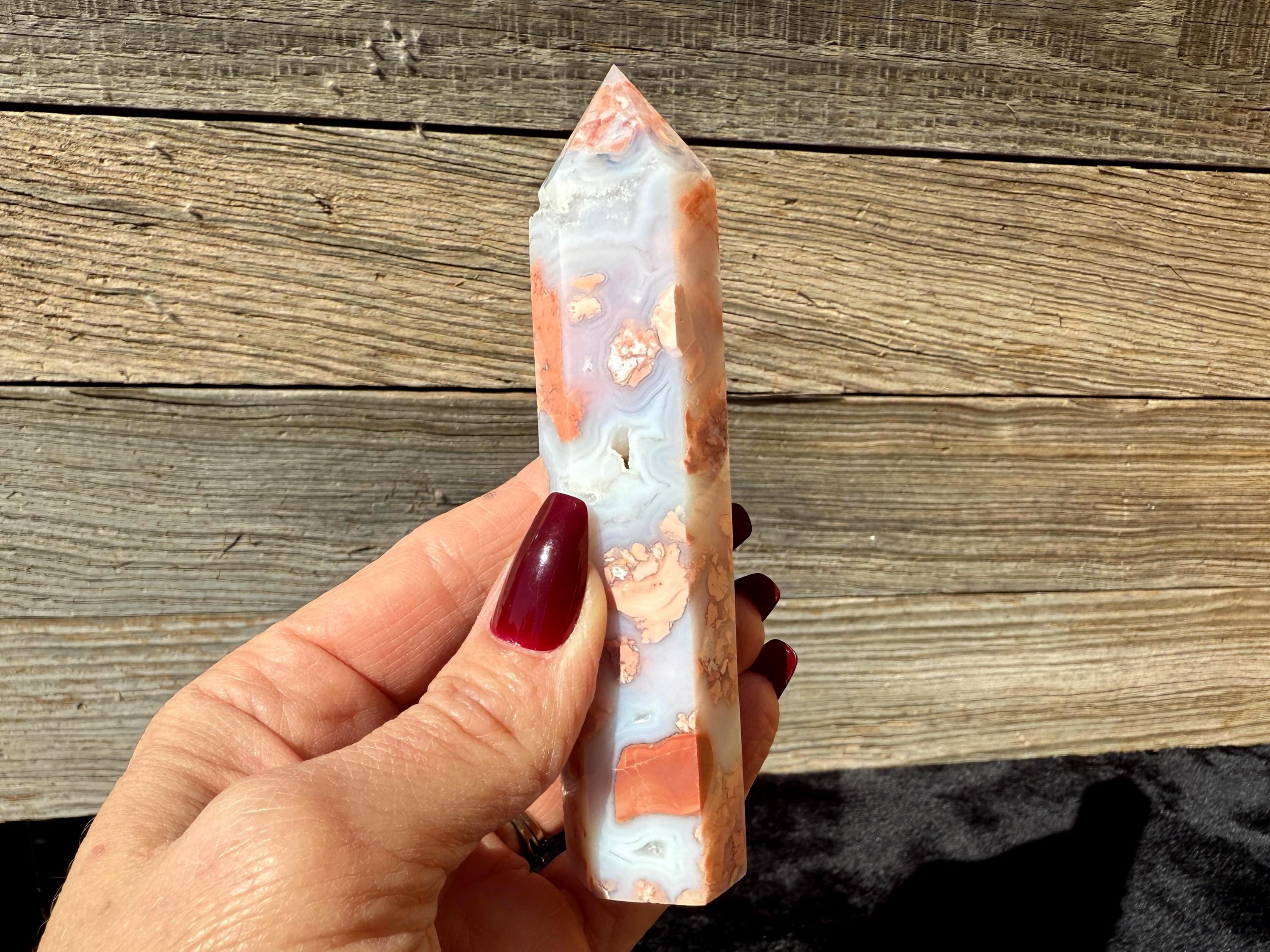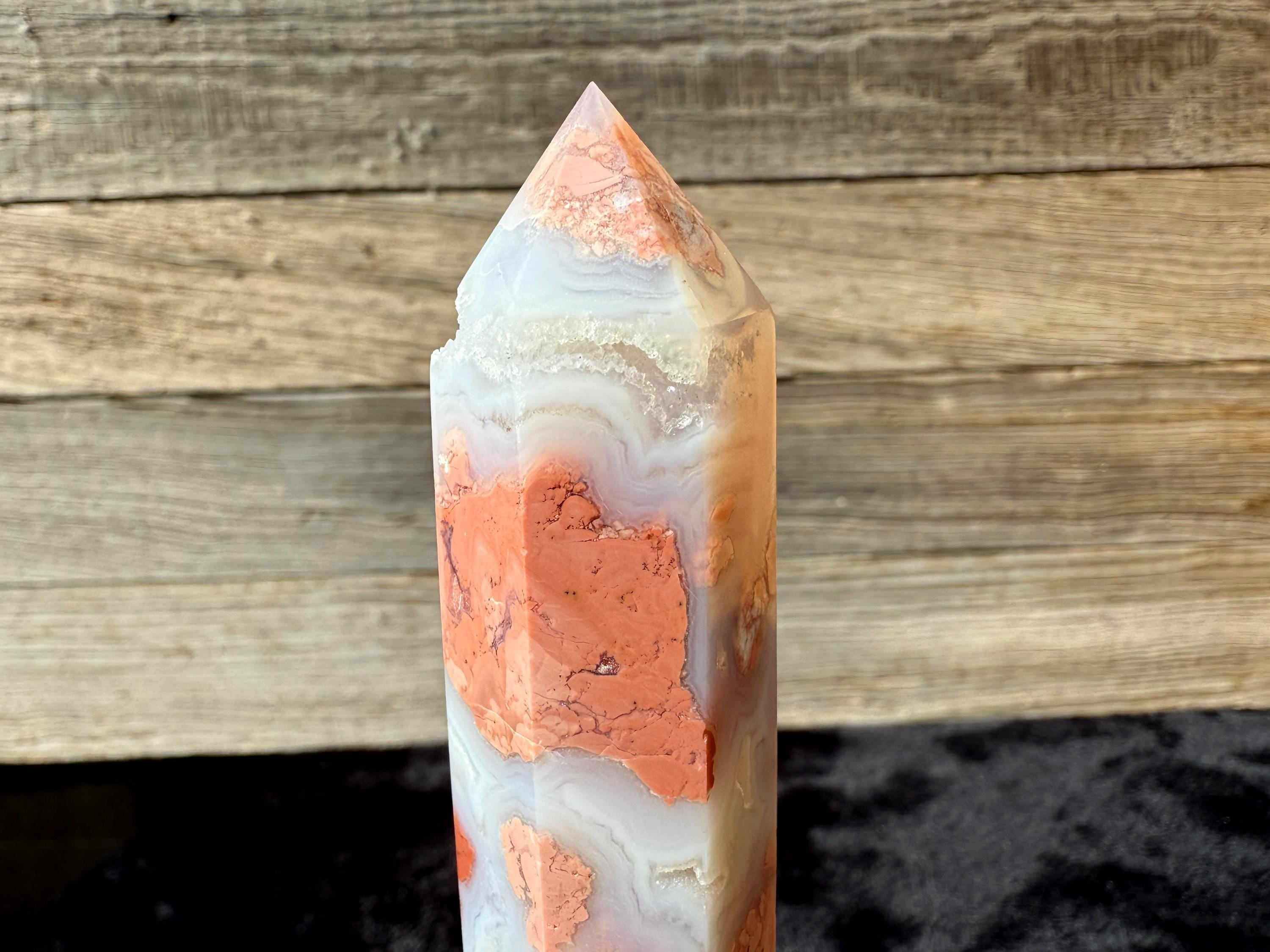 Showcasing soft pink and creamy white hues, this Druzy Cotton Candy Agate Tower is a one-of-a-kind piece full of natural charm. Polished to a smooth glossy finish, it features gentle banding and a sparkling druzy pocket that catches the light beautifully. Perfect as a display piece, décor accent, or thoughtful gift for any crystal lover.
