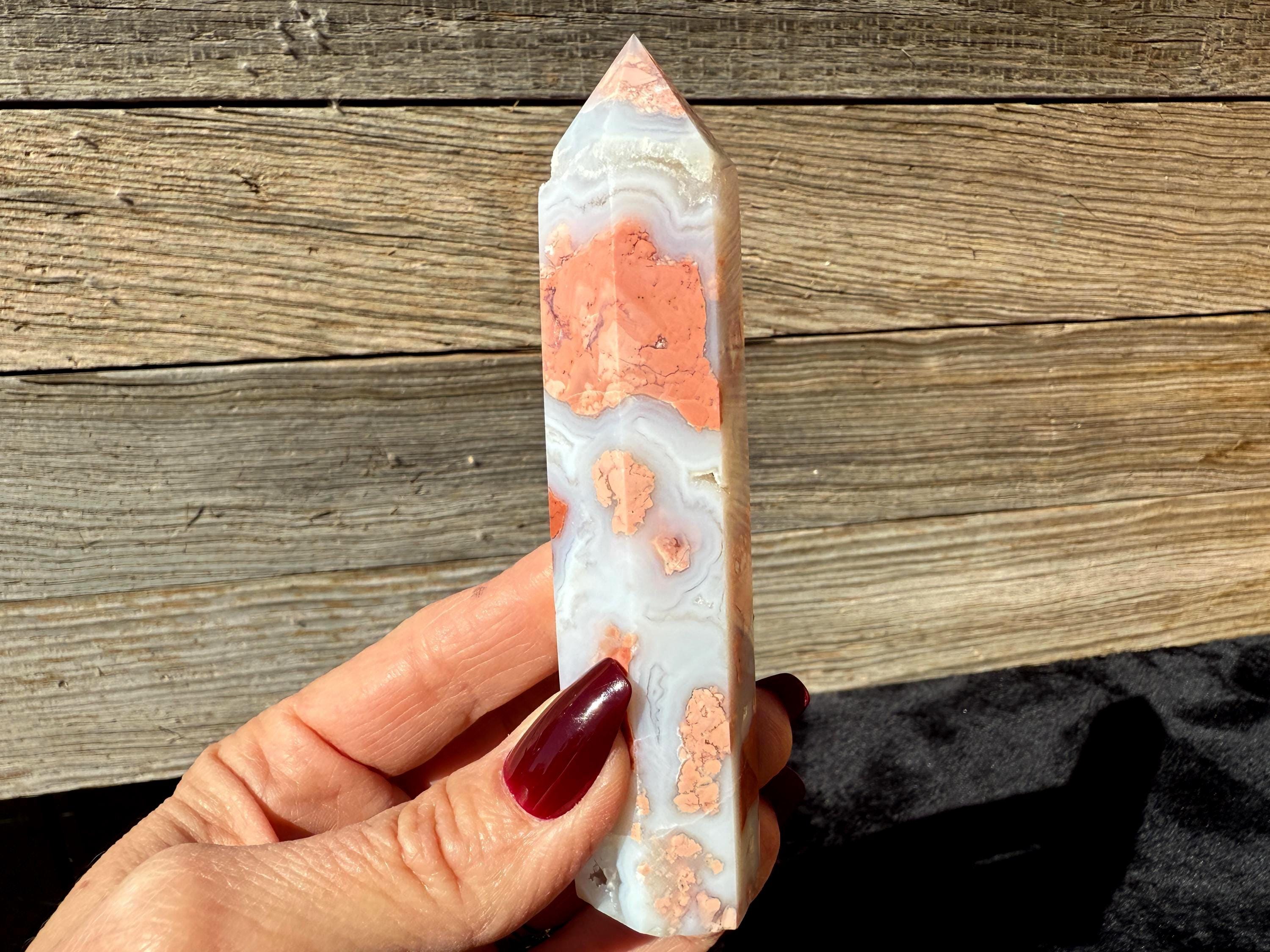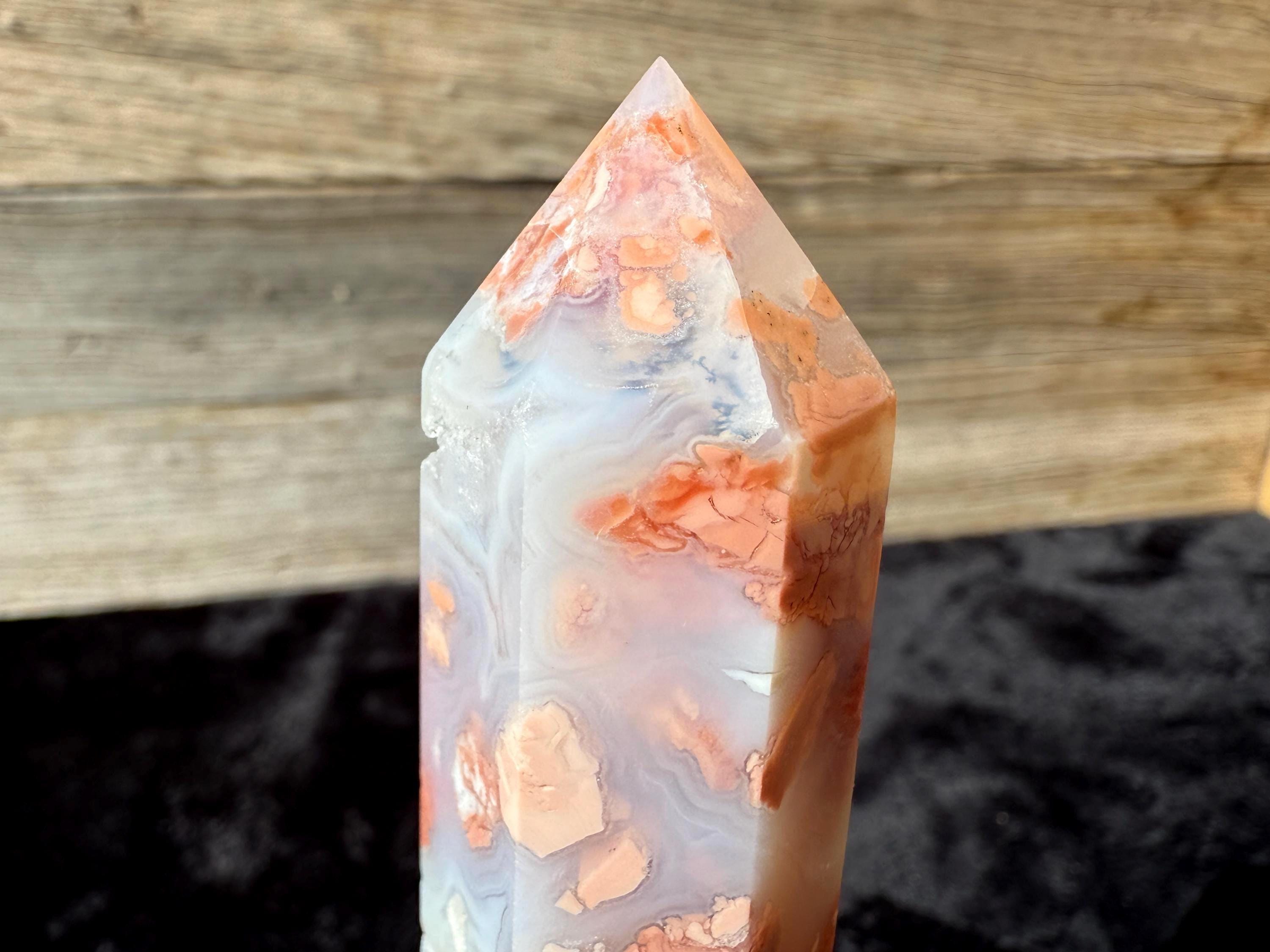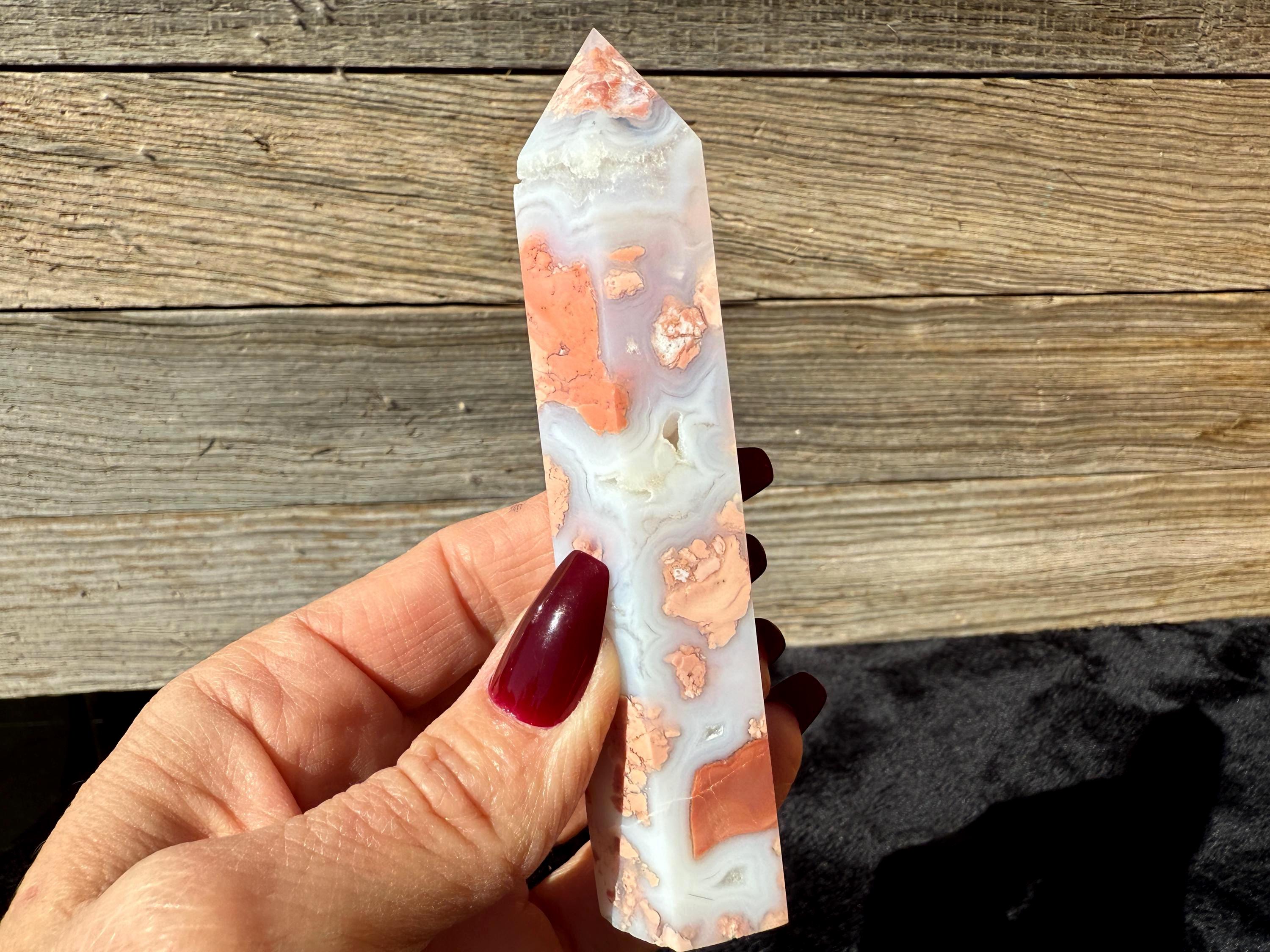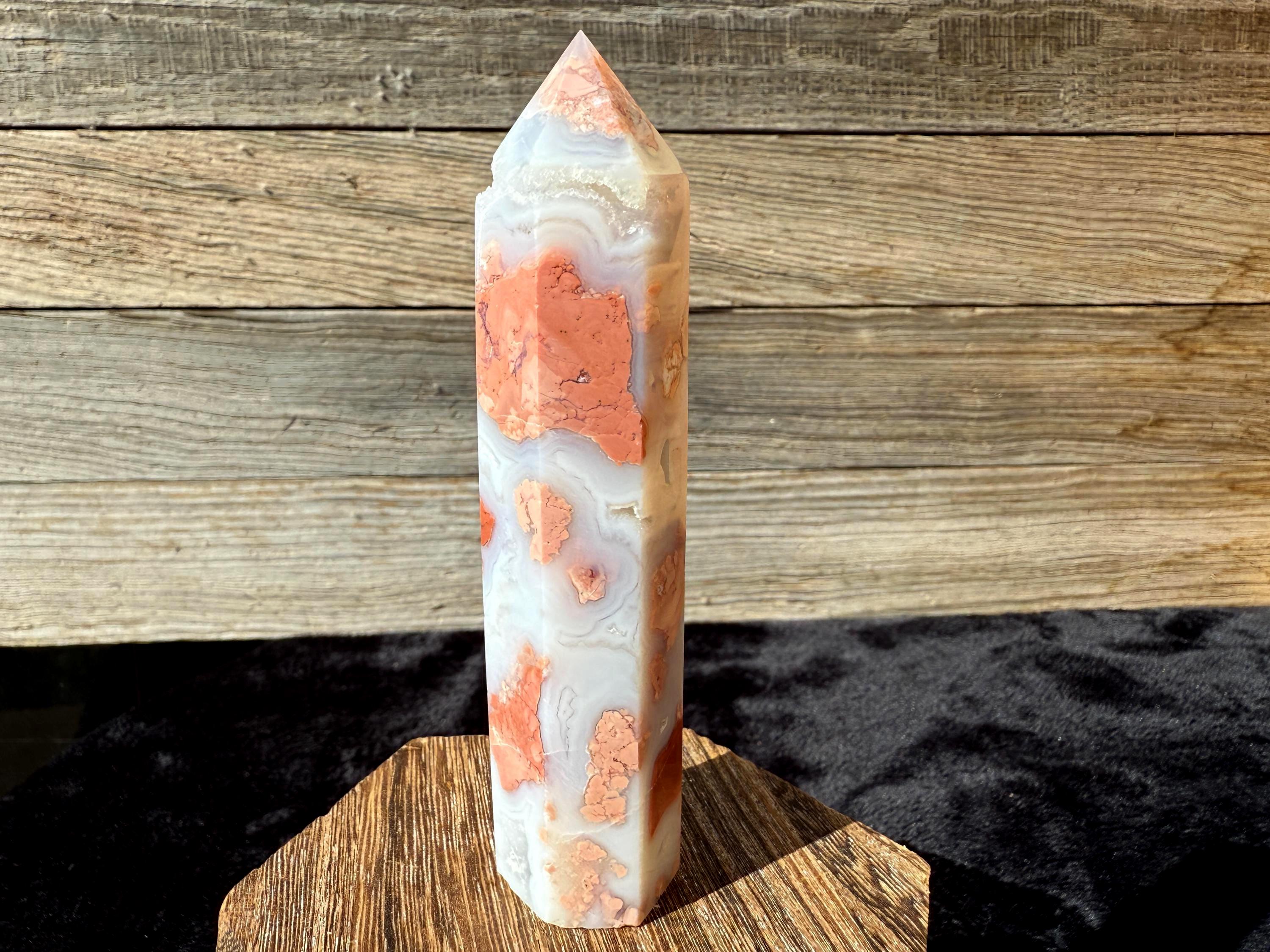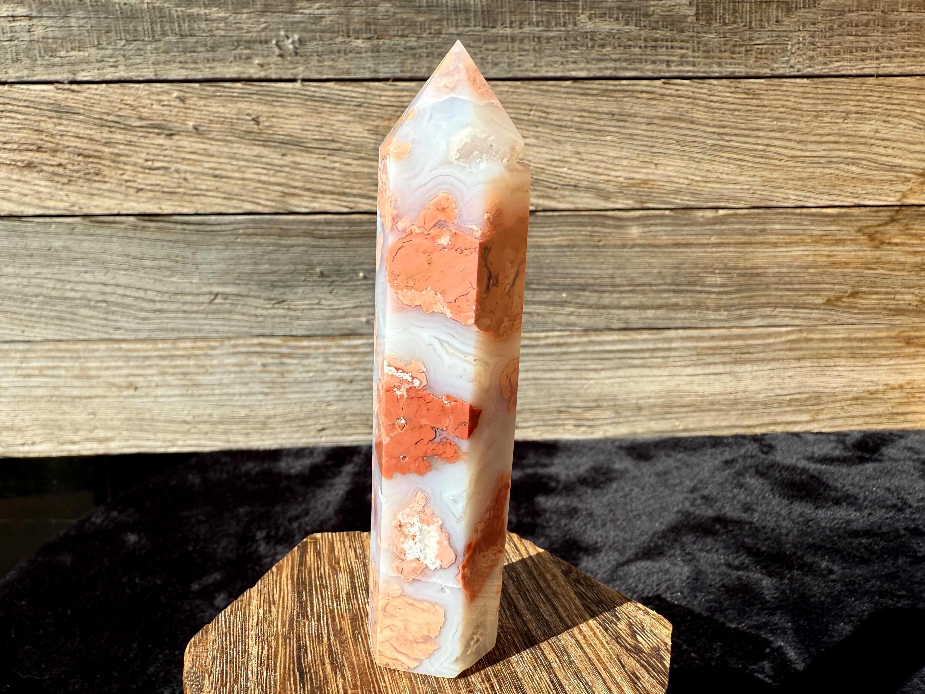 Showcasing soft pink and creamy white hues, this Druzy Cotton Candy Agate Tower is a one-of-a-kind piece full of natural charm. Polished to a smooth glossy finish, it features gentle banding and a sparkling druzy pocket that catches the light beautifully. Perfect as a display piece, décor accent, or thoughtful gift for any crystal lover.