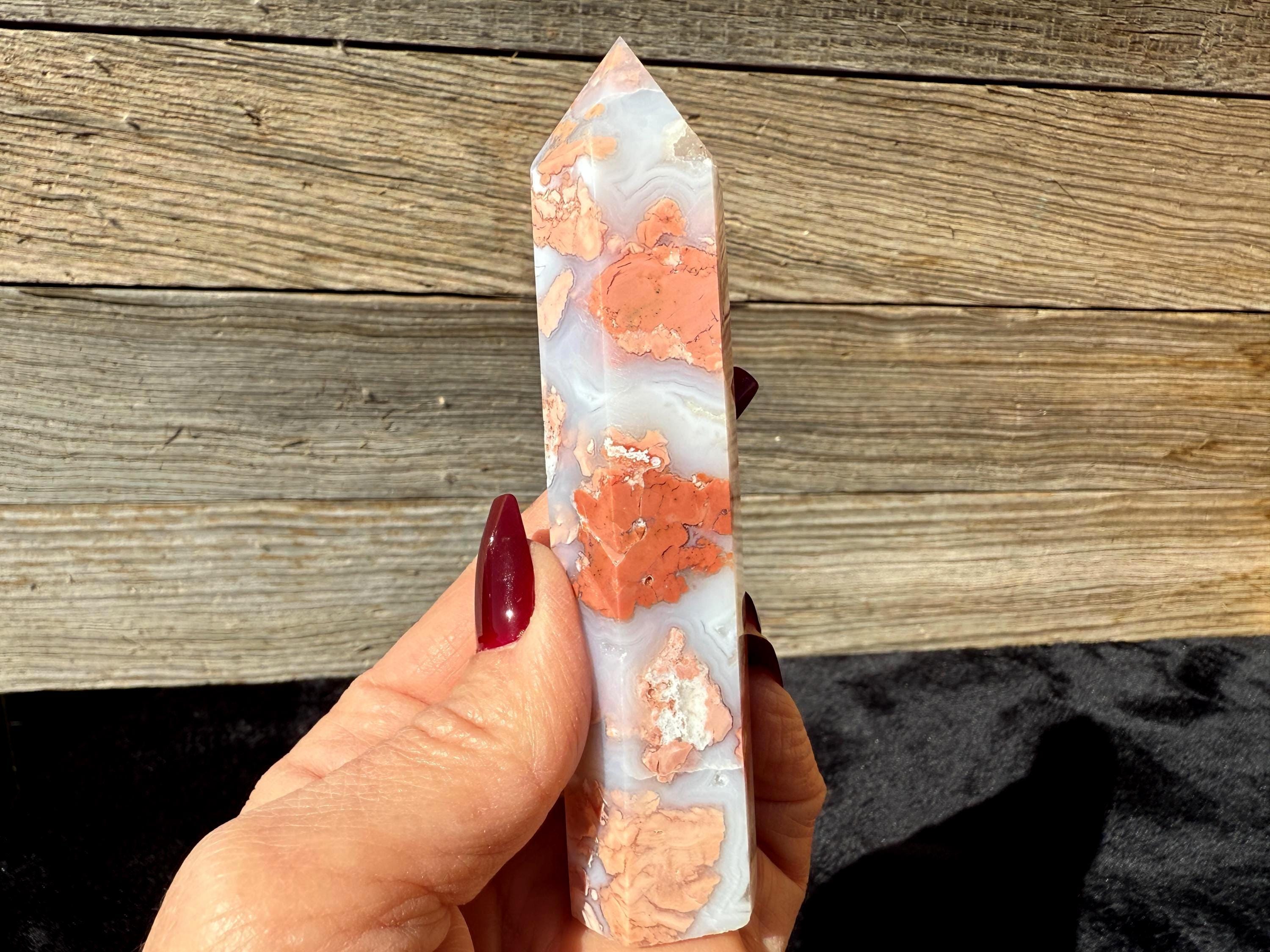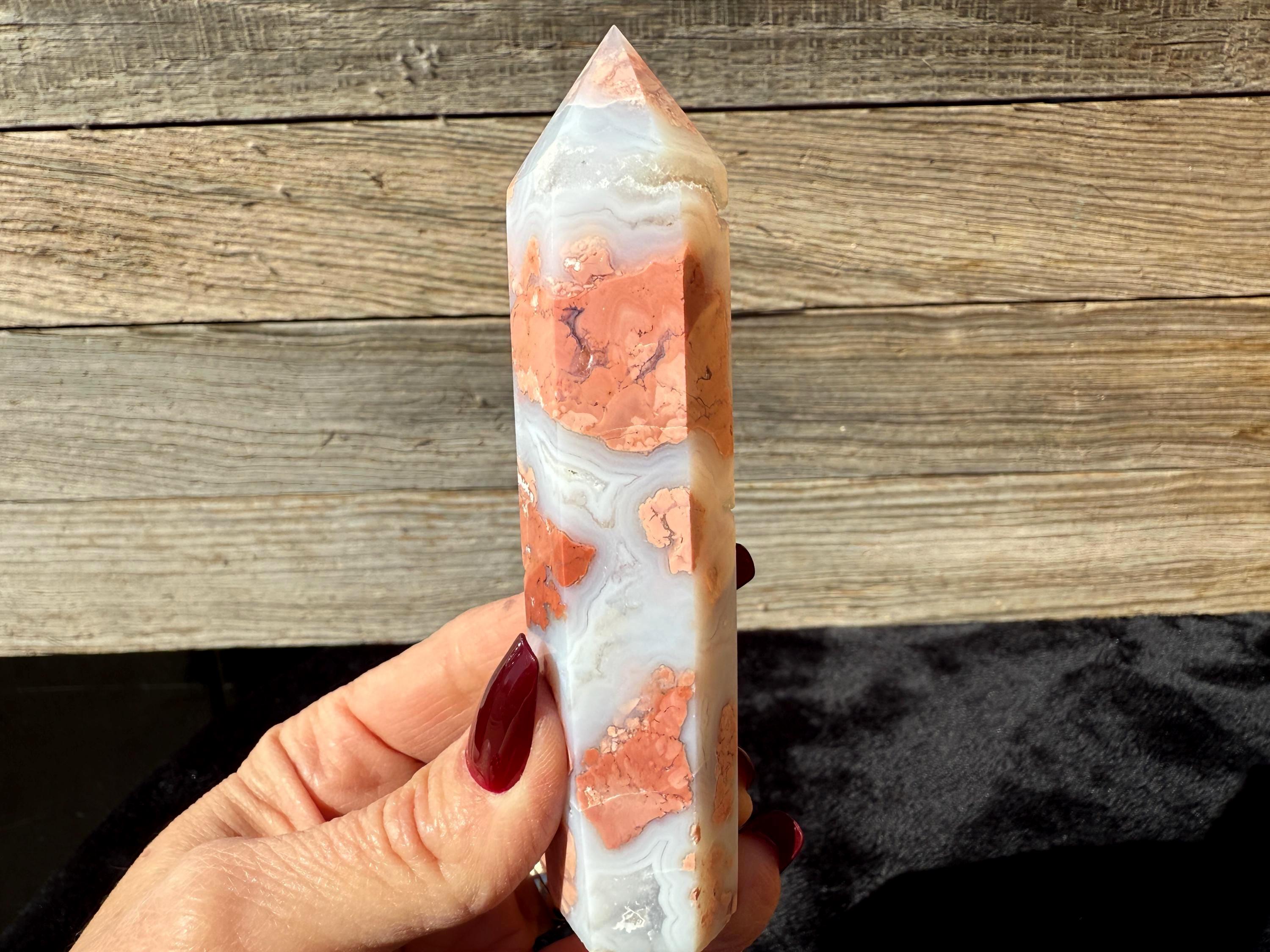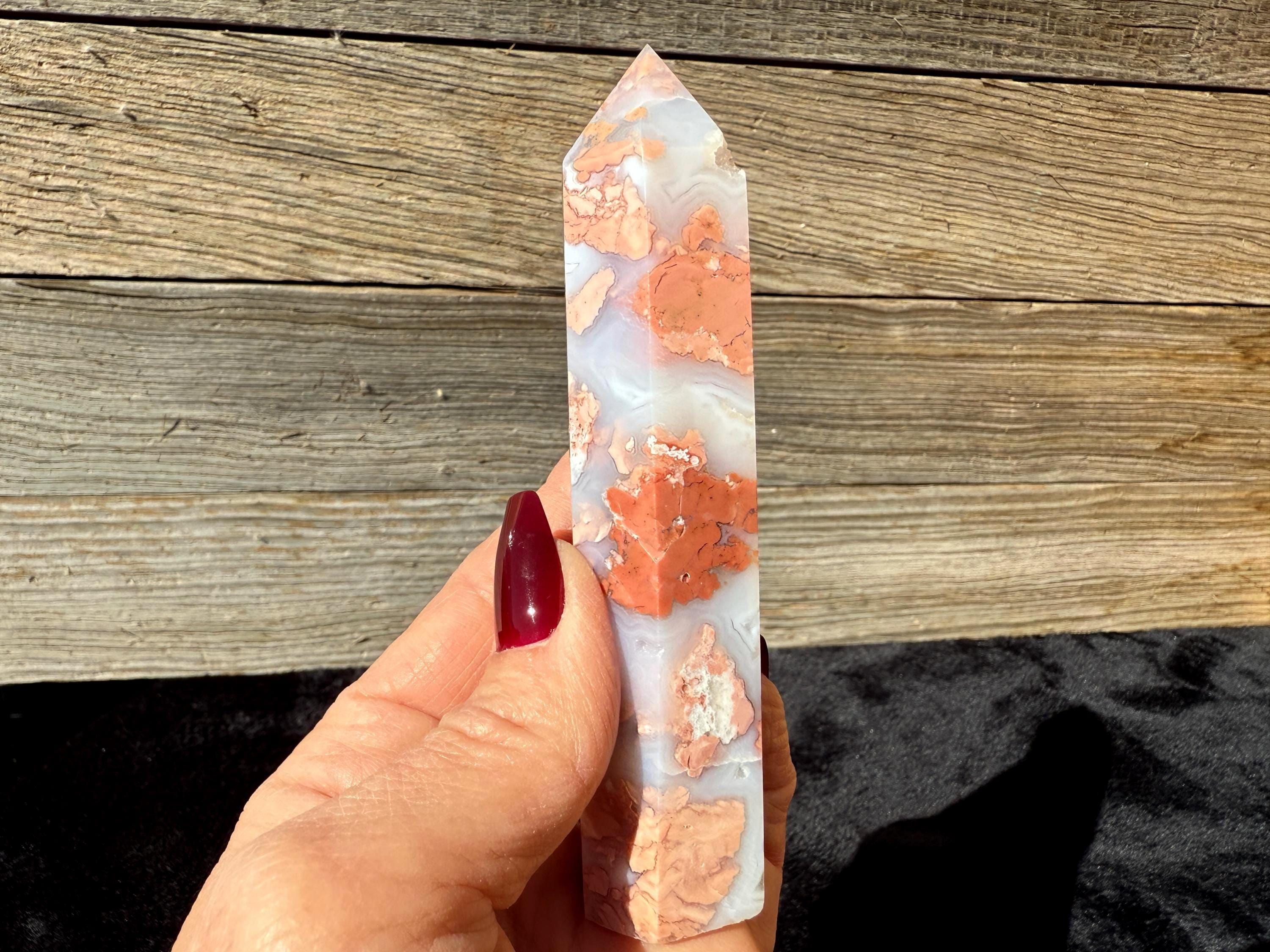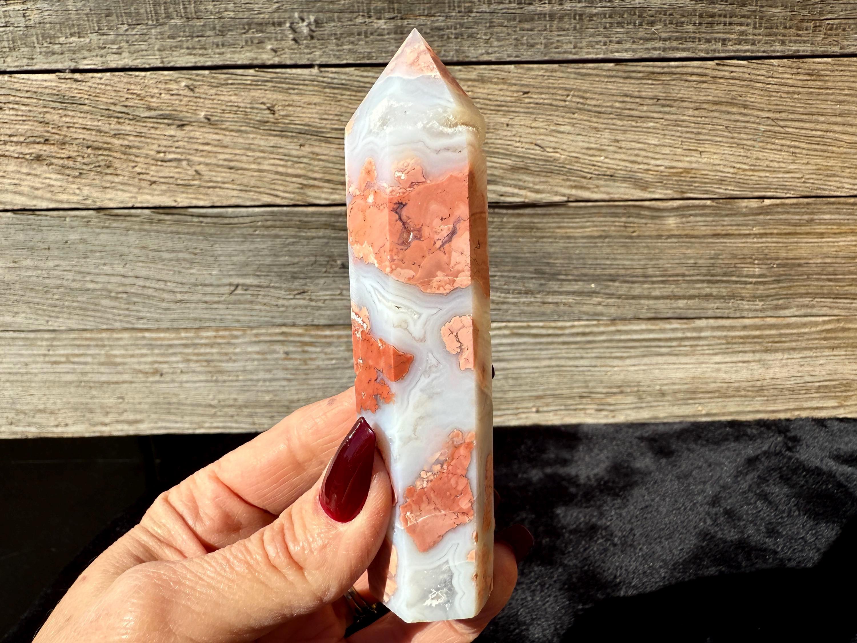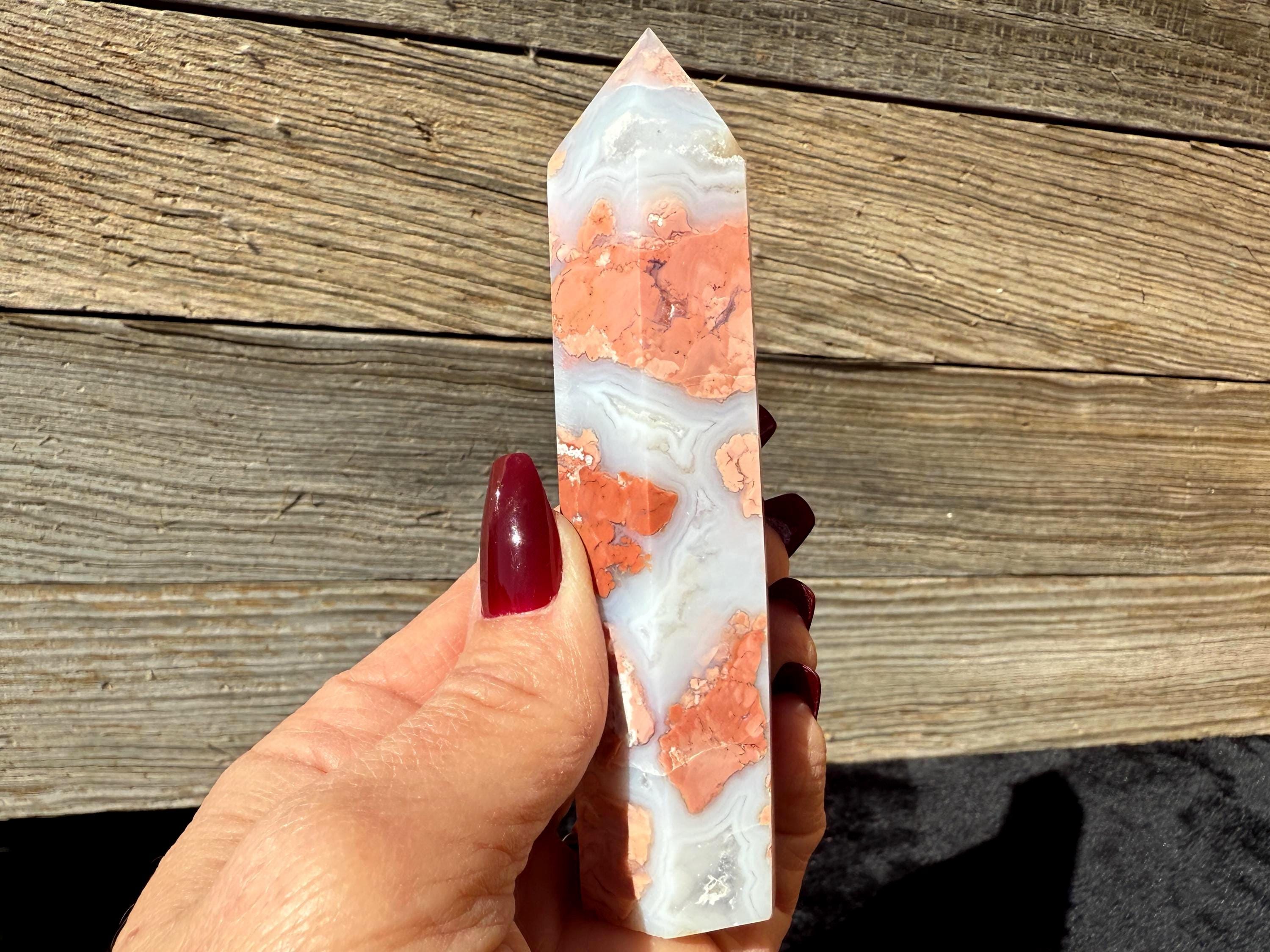 Showcasing soft pink and creamy white hues, this Druzy Cotton Candy Agate Tower is a one-of-a-kind piece full of natural charm. Polished to a smooth glossy finish, it features gentle banding and a sparkling druzy pocket that catches the light beautifully. Perfect as a display piece, décor accent, or thoughtful gift for any crystal lover.