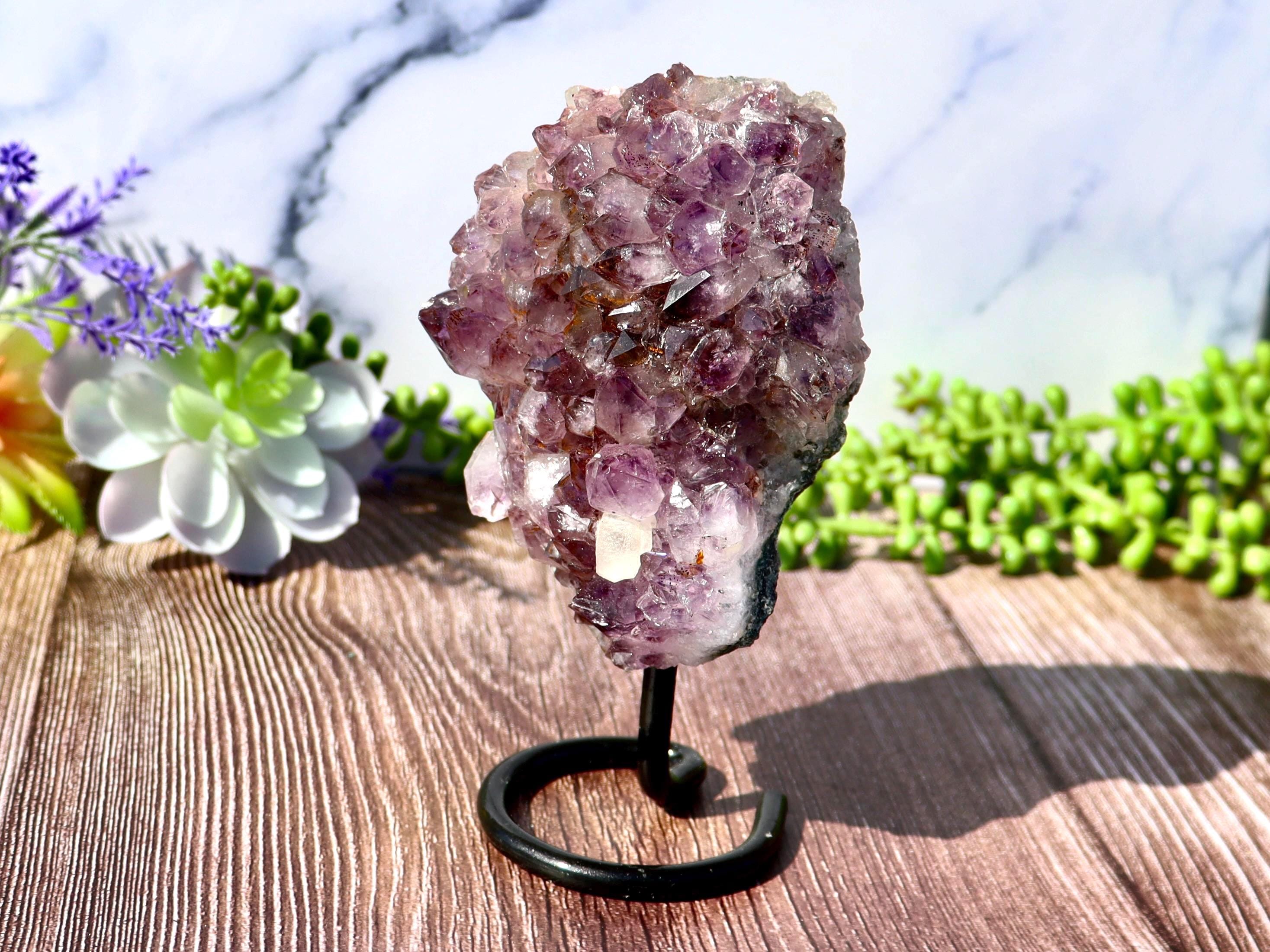 Beautiful Amethyst Crystal Cluster with Calcite on Metal Display Stand Origin: Brazil
