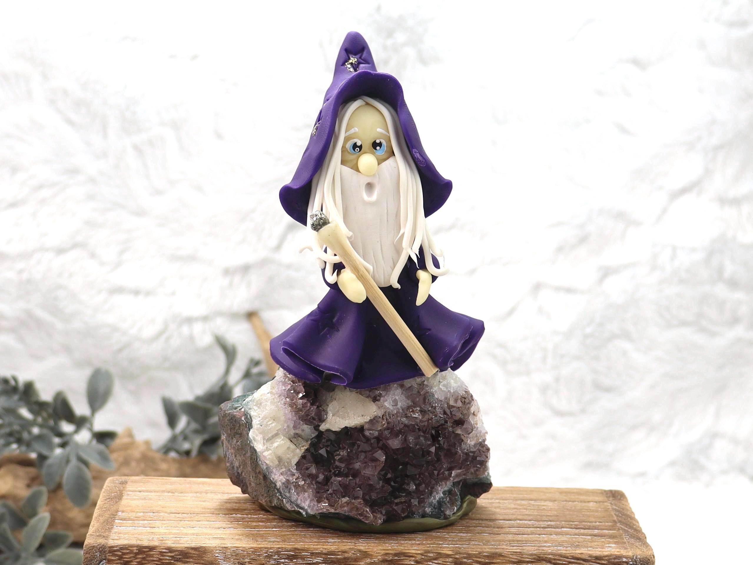 Super Cute Hand Made Clay Wizard Holding a Wand with a piece of Pyrite on the Tip Sitting on Top of an Amethyst Cluster. Origin: Brazil