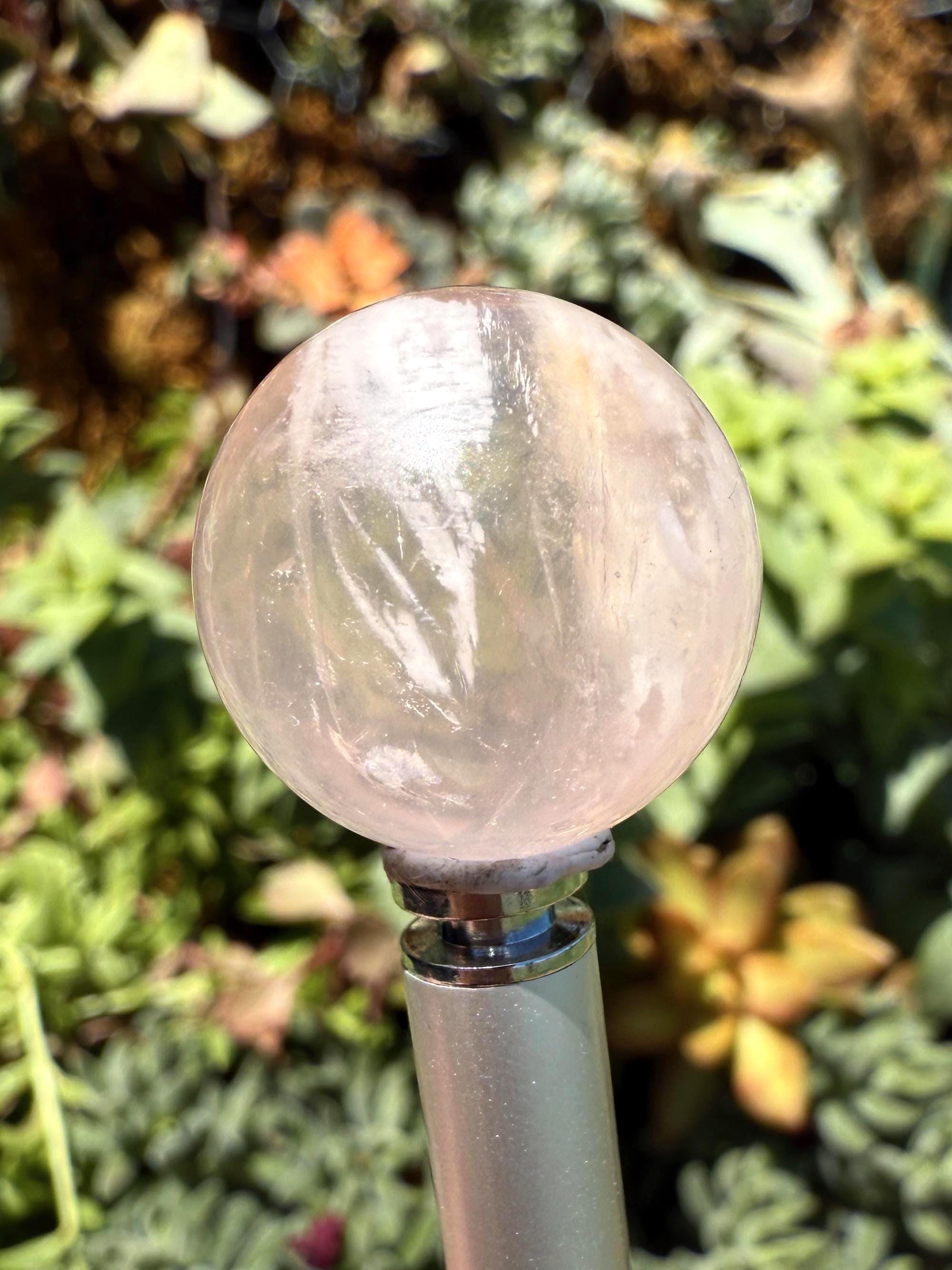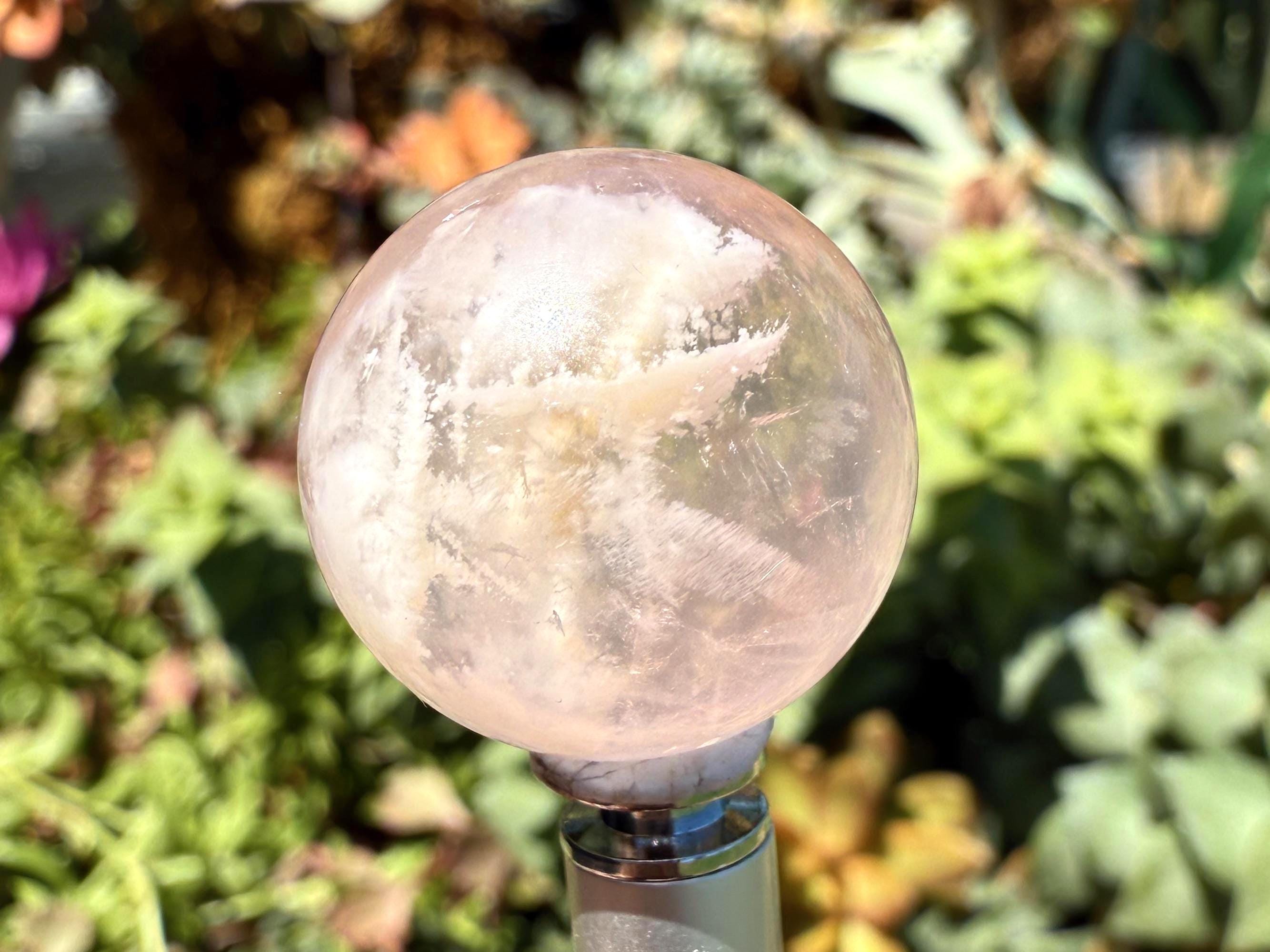 A rare Snowflake Garden Rose Quartz Sphere with delicate snowy inclusions and a glowing star-like asterism when light reflects. Known as the stone of love and emotional healing, this sphere blends beauty and gentle energy—perfect for display, meditation, or gifting.