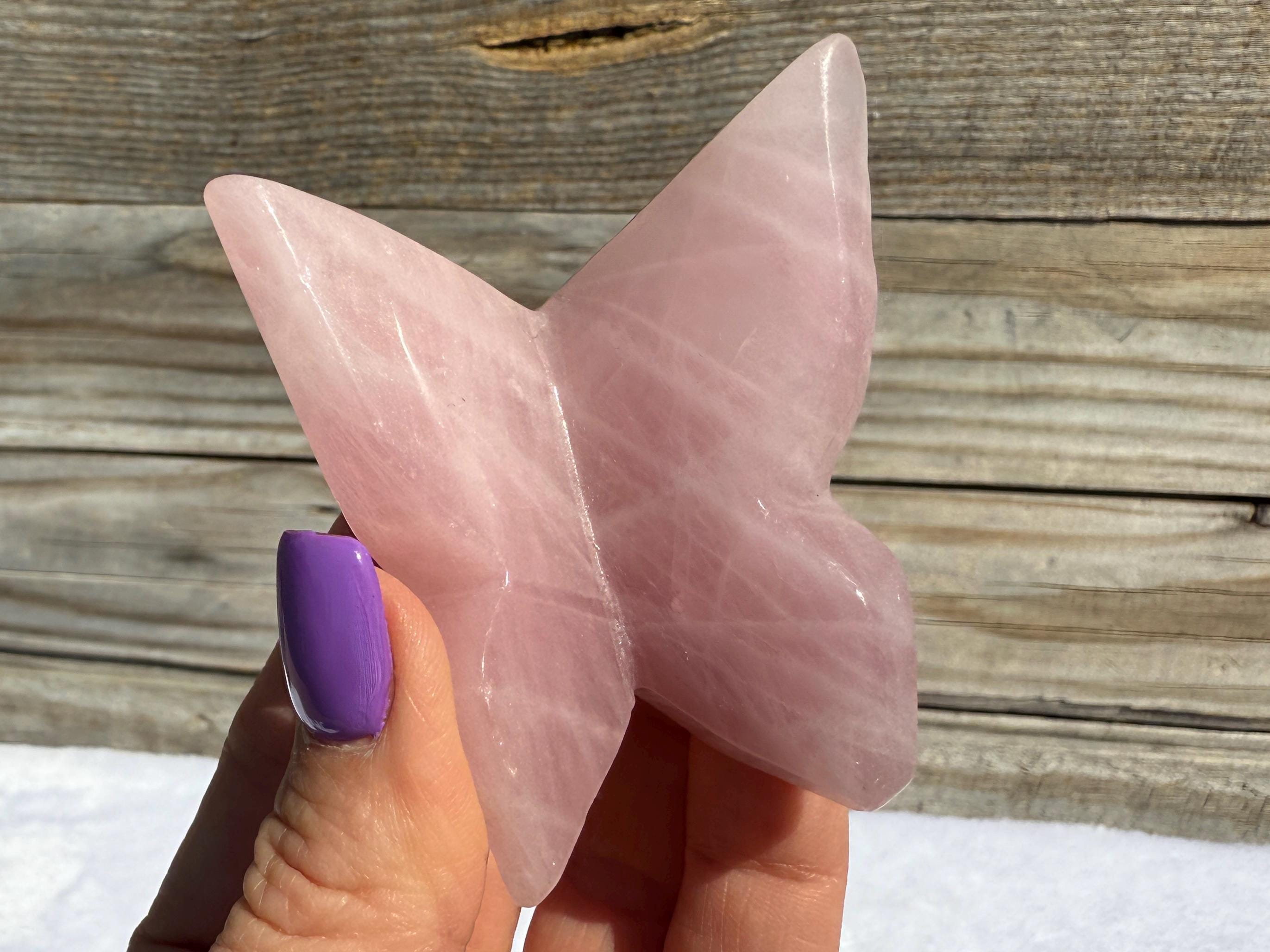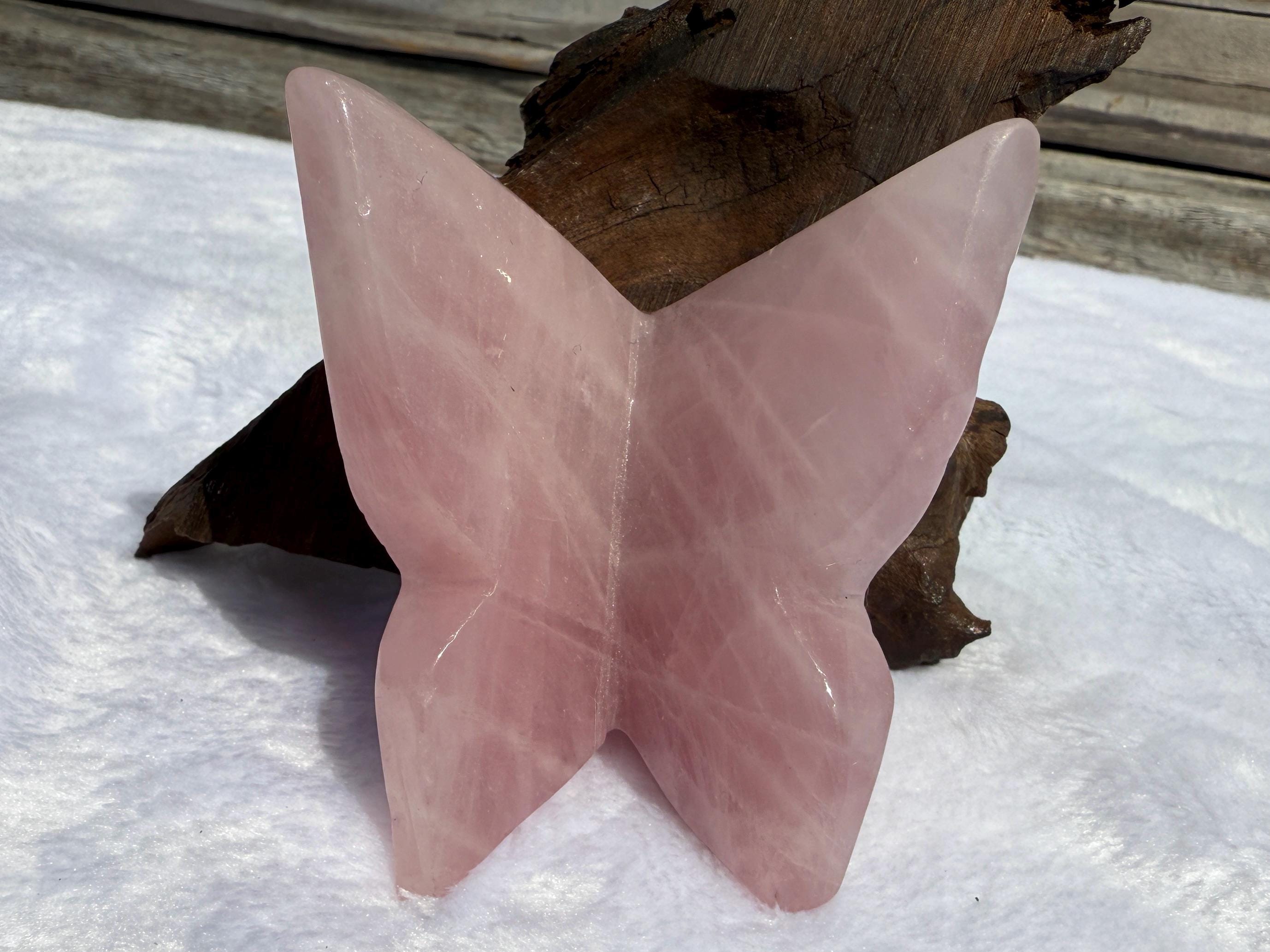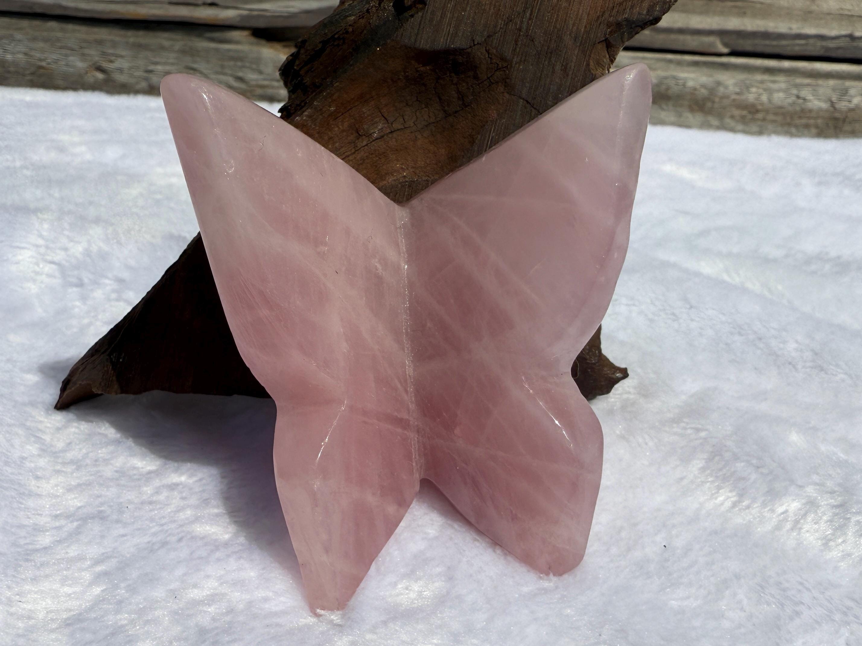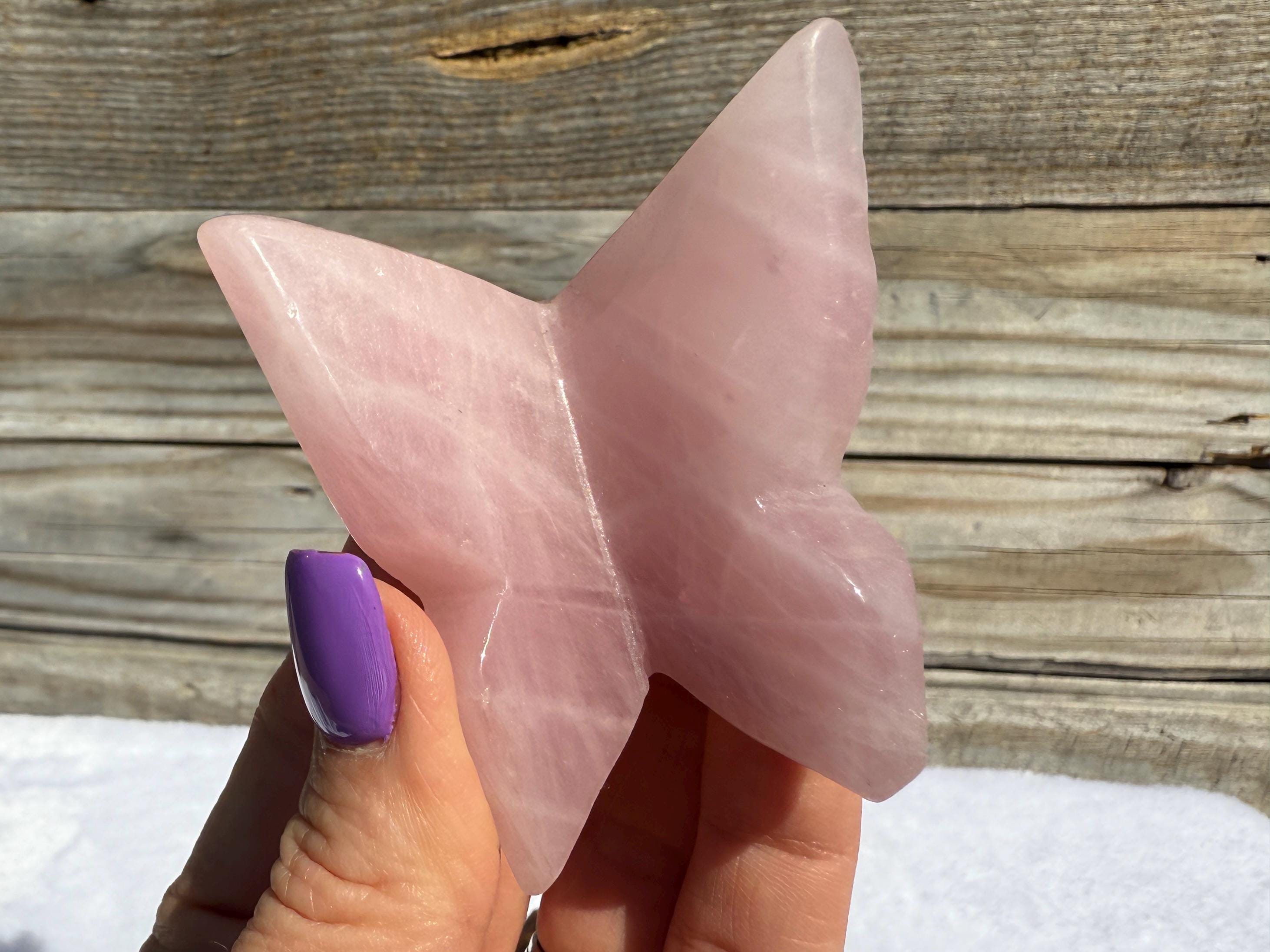 This hand-carved Rose Quartz Butterfly is a symbol of love, transformation, and beauty. Crafted from natural rose quartz with its soft pink tones, this carving makes a meaningful décor piece, meditation companion, or heartfelt gift