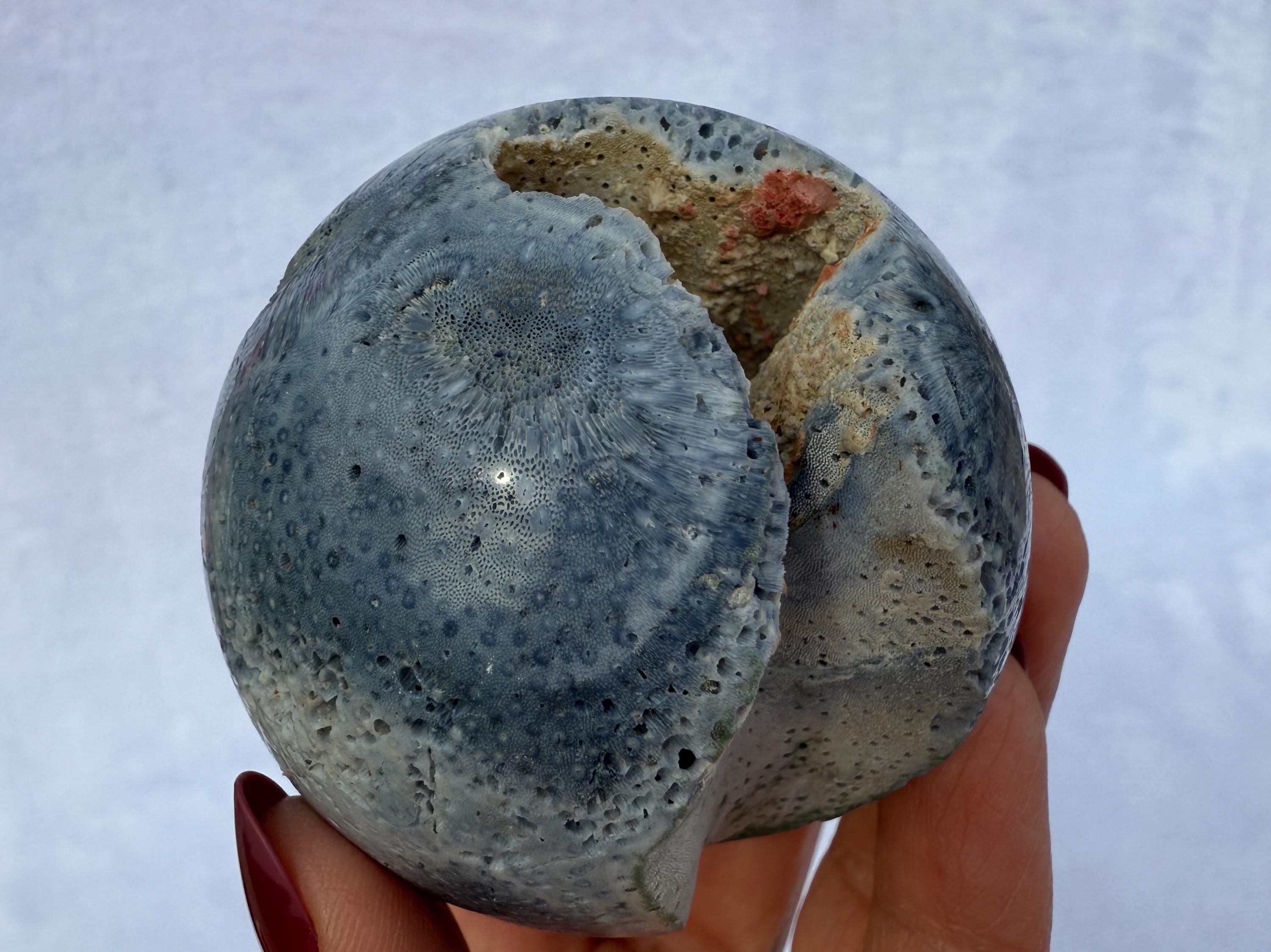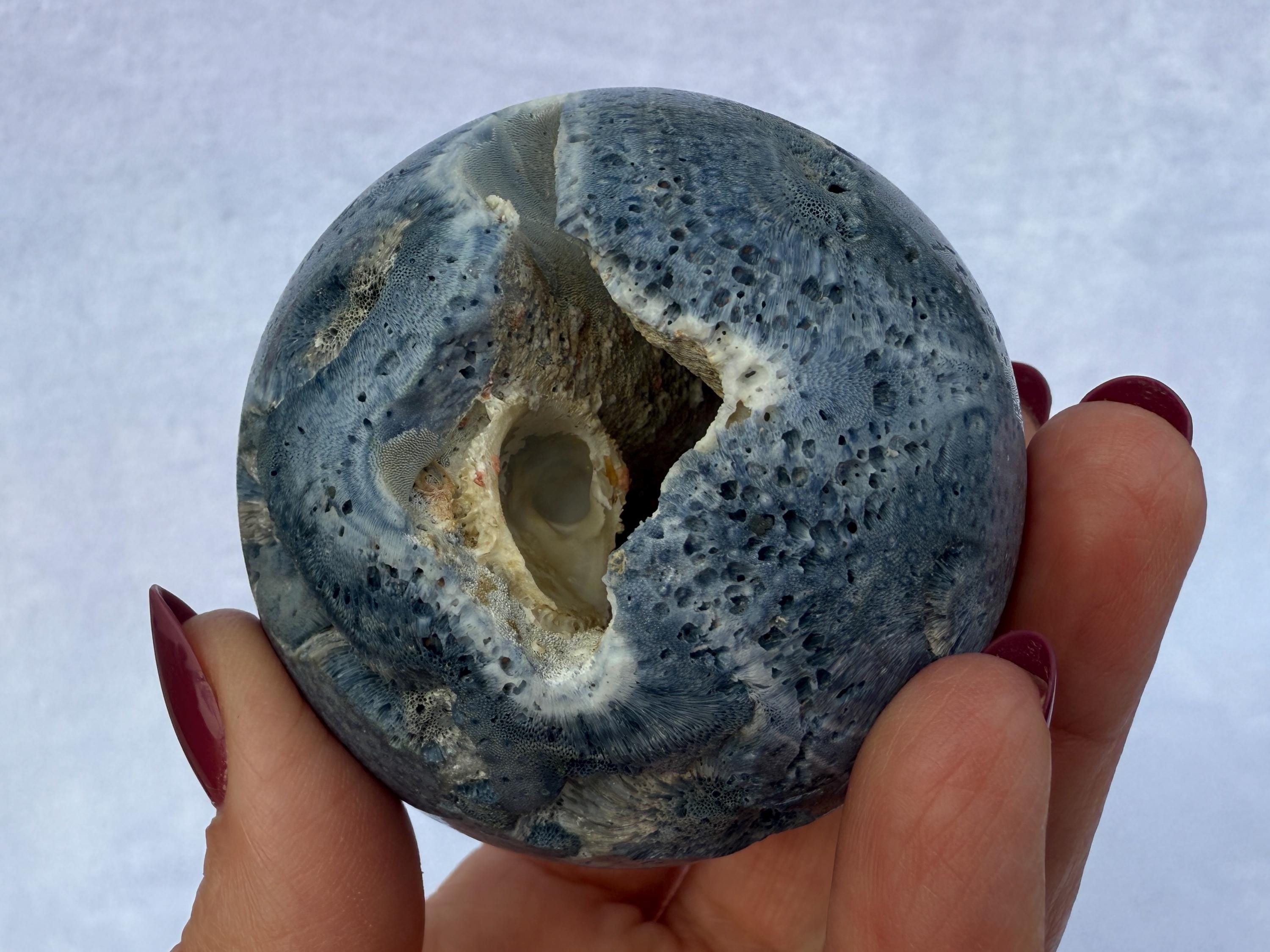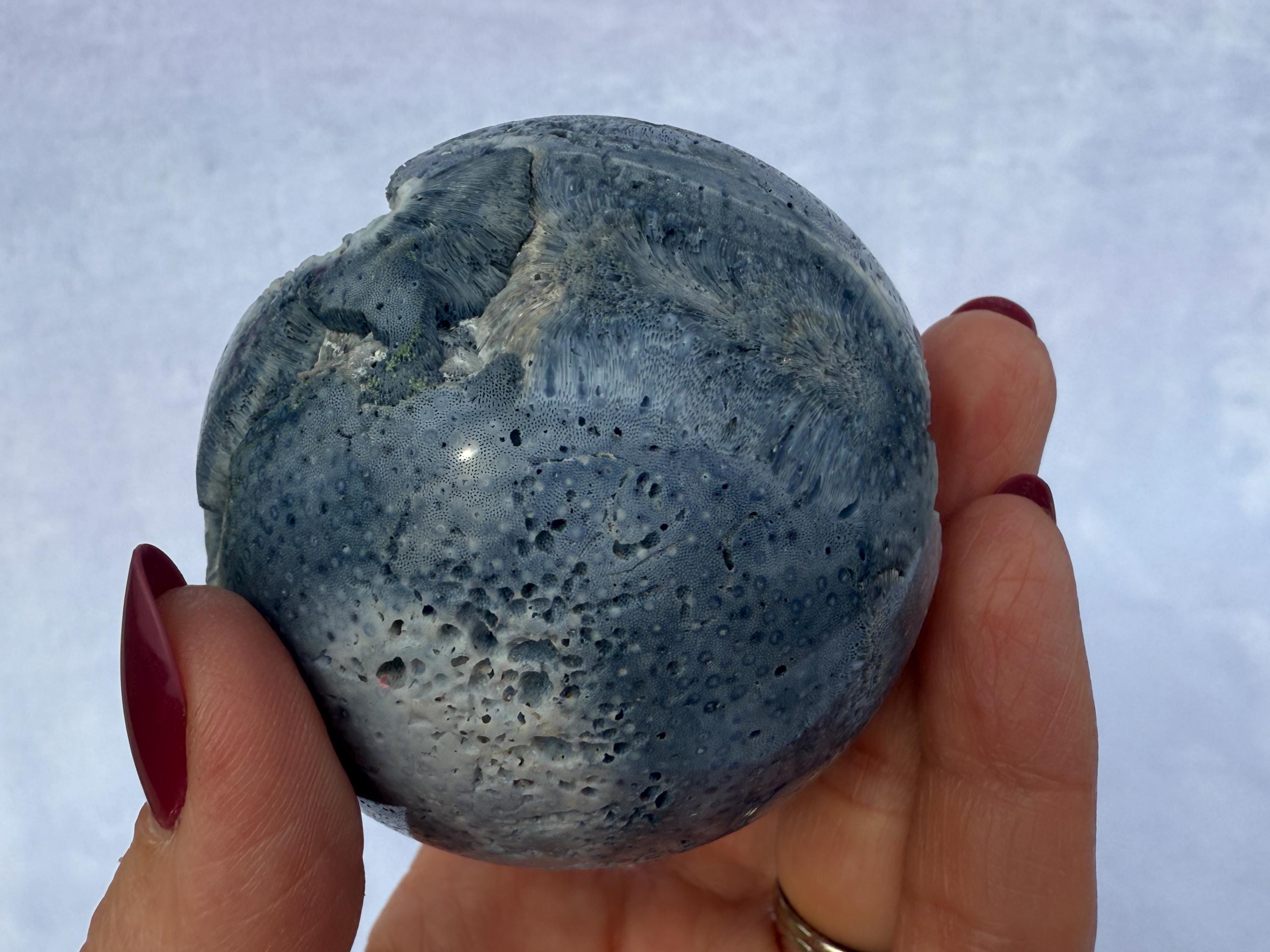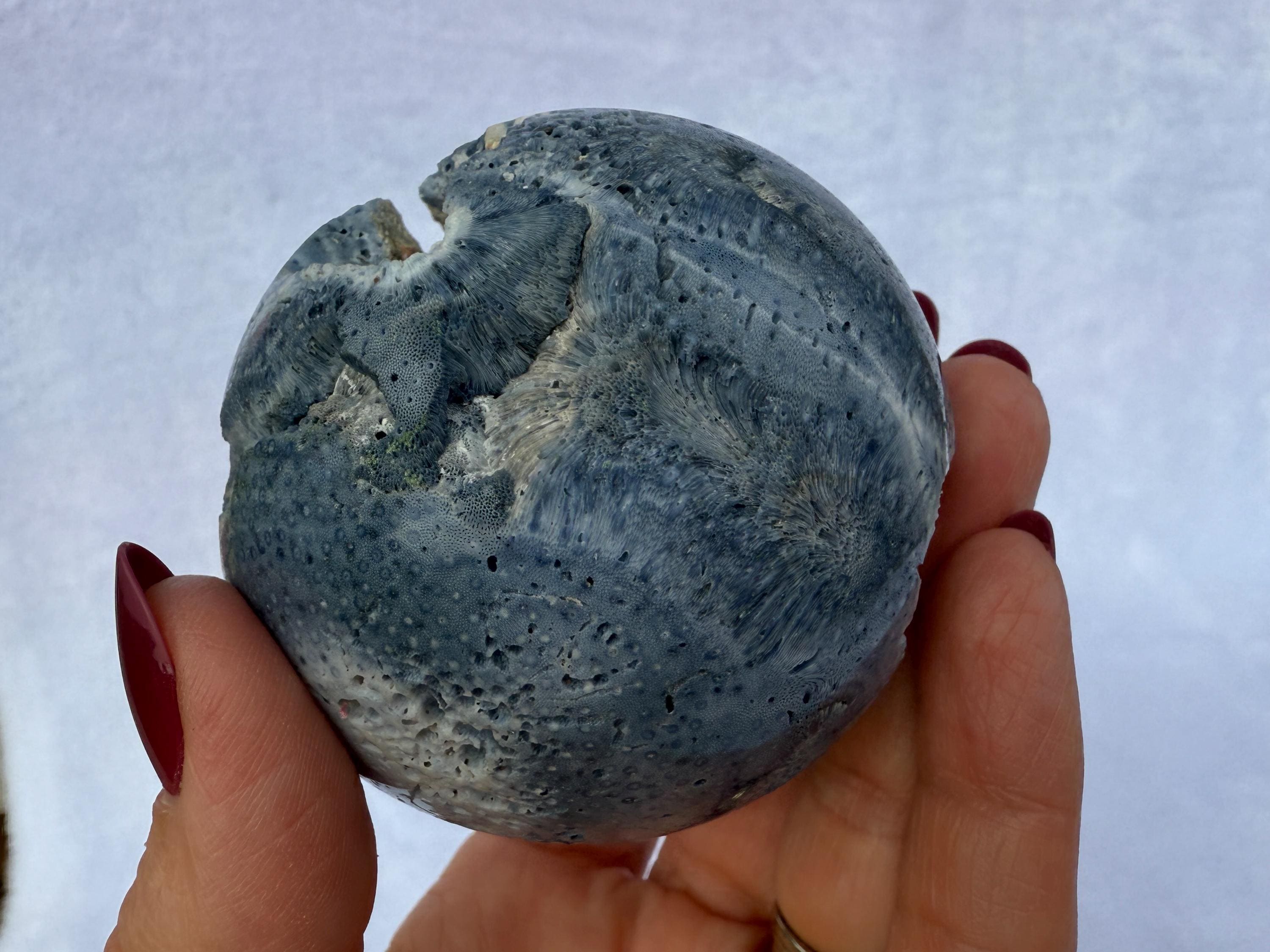 ✨ Features • Genuine Blue Fossil Coral Sphere • Beautiful ocean-like patterns and colors • Smooth polished finish with natural markings • Perfect for display, meditation, or gifting