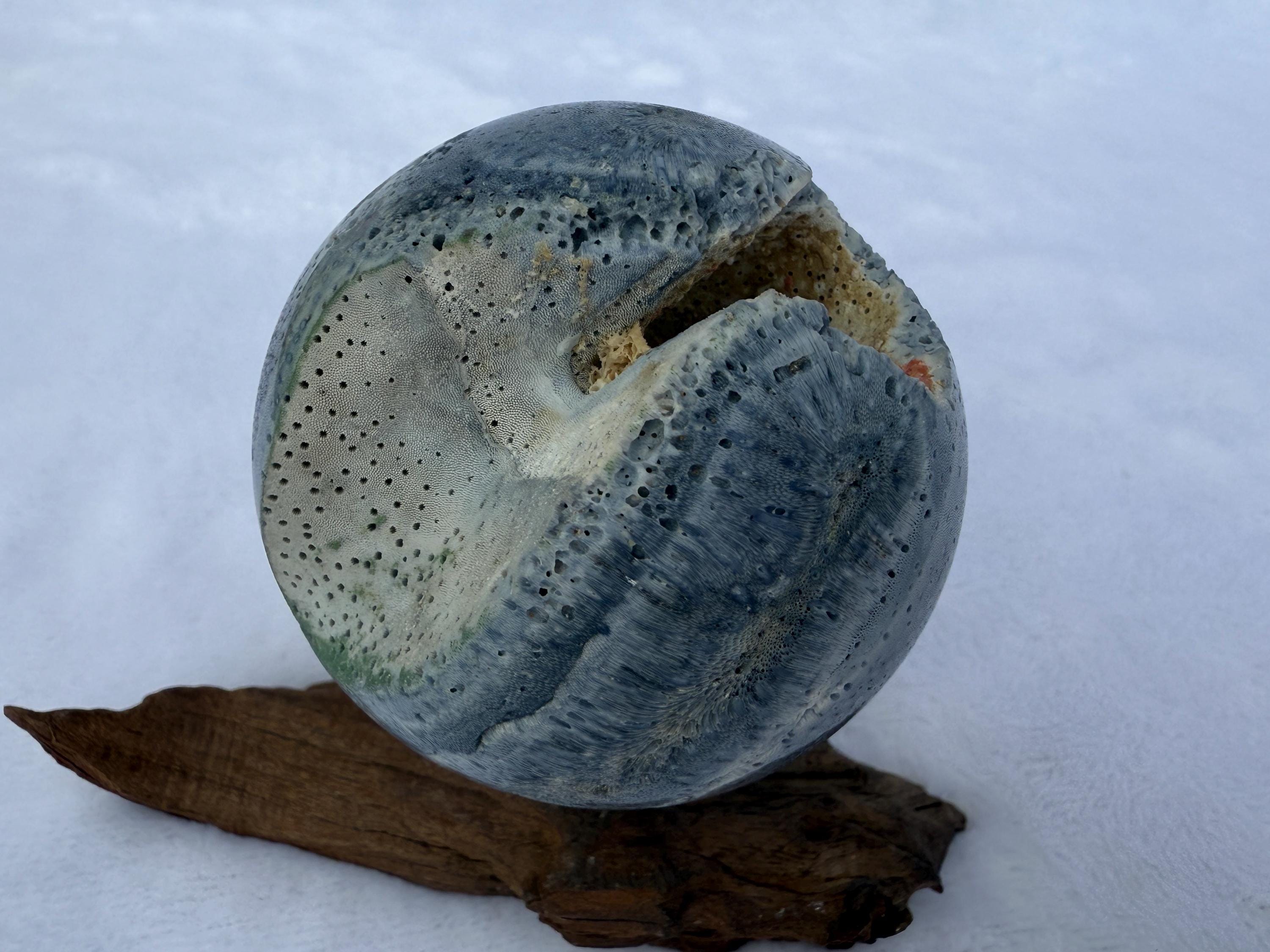 Bring the calming energy of the ocean into your home with this stunning Blue Coral Sphere. Crafted from fossilized coral that has naturally transformed over time, this piece showcases soothing blue tones with intricate coral patterns that resemble underwater reef formations. This sphere is one-of-a-kind, making it a meaningful addition to any crystal collection or coastal-inspired décor.