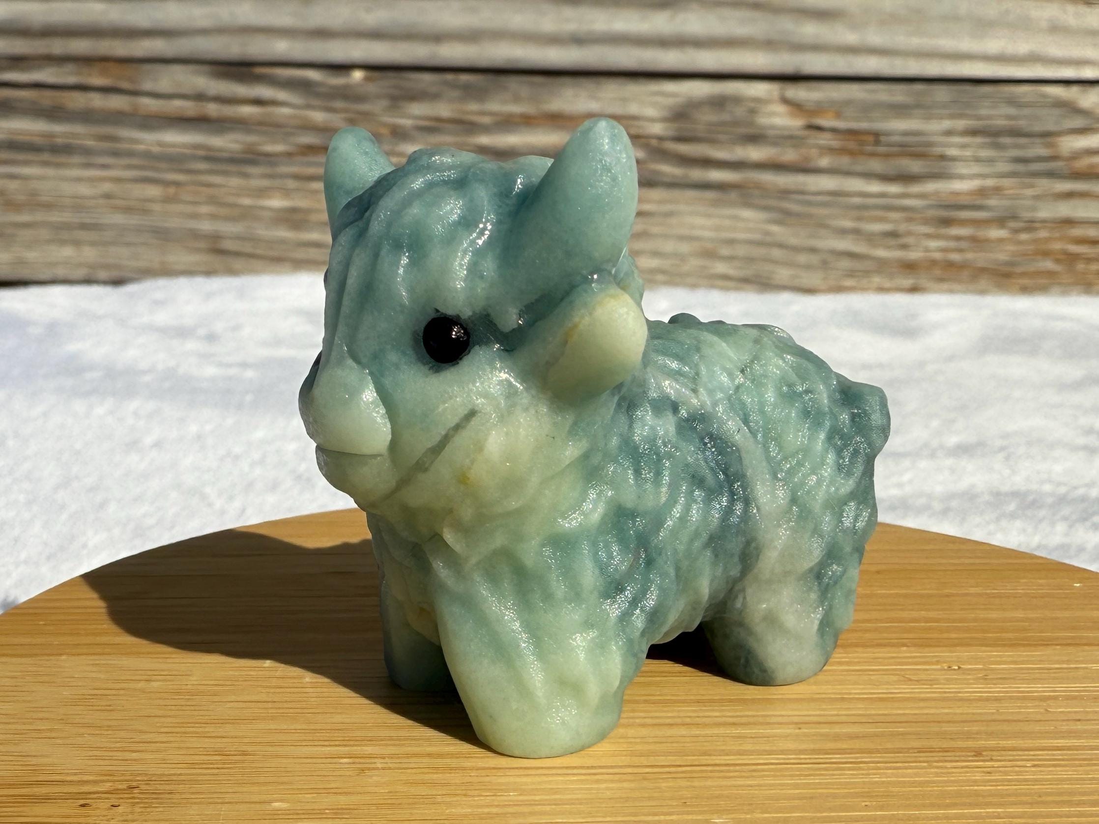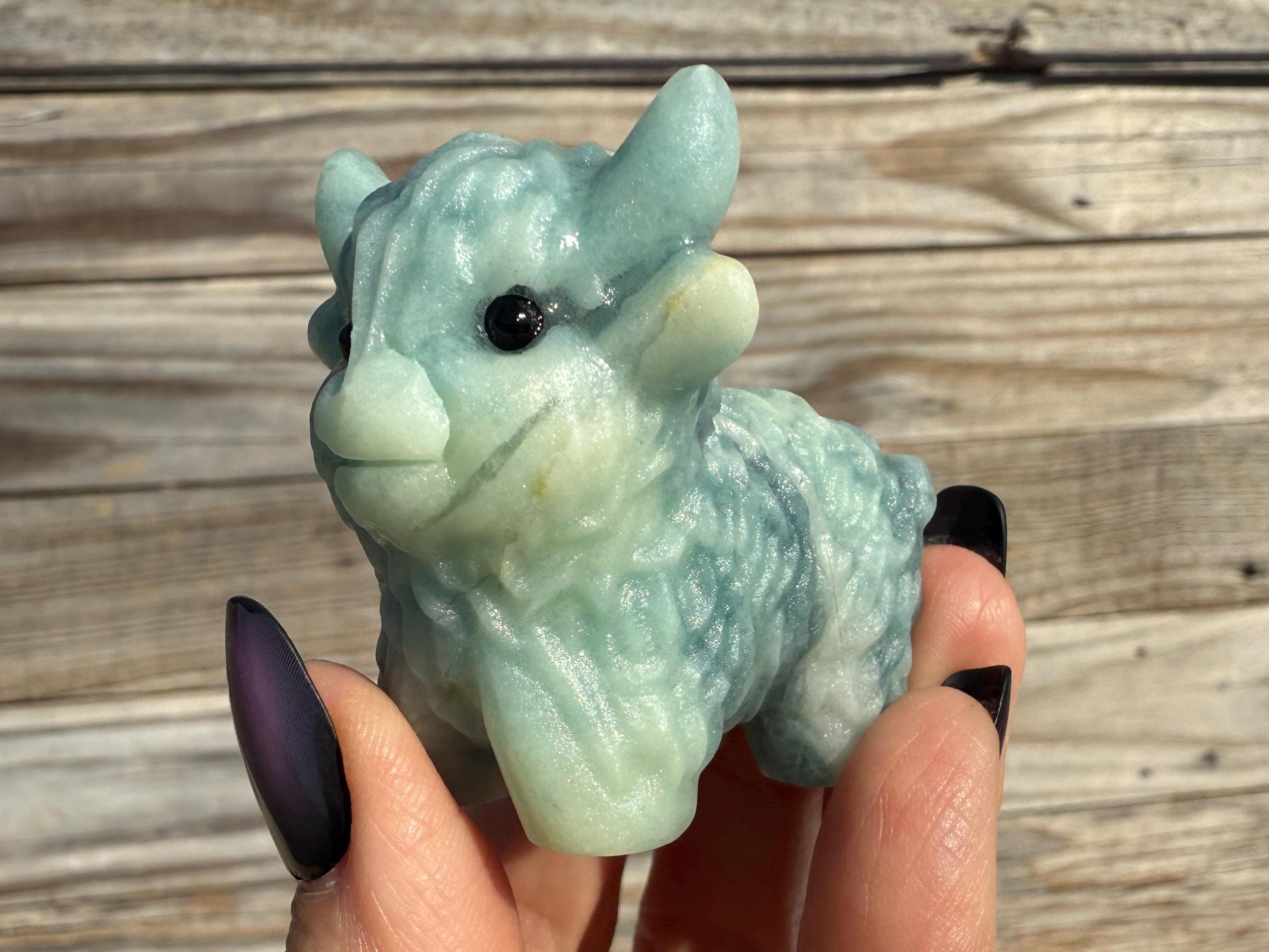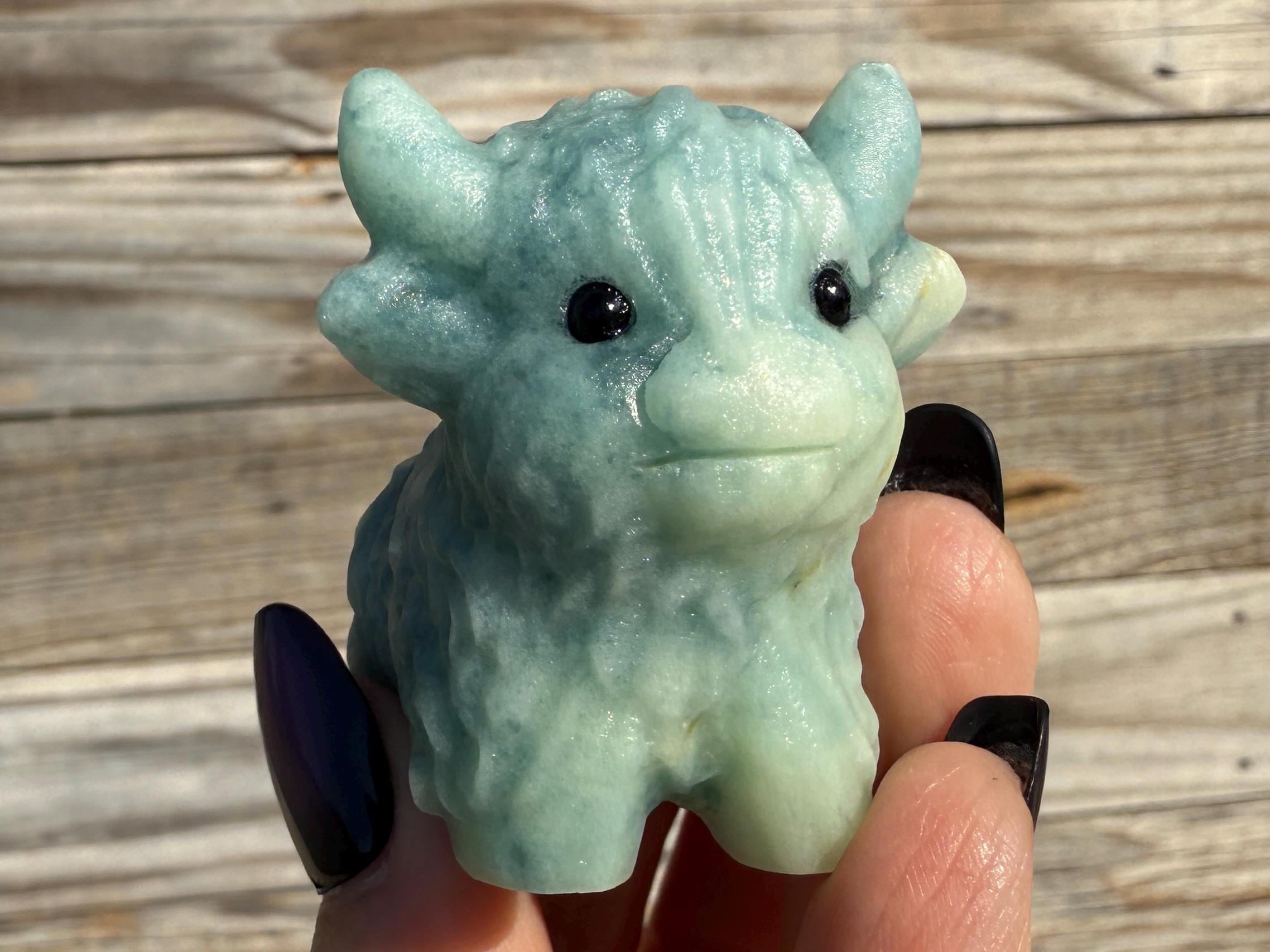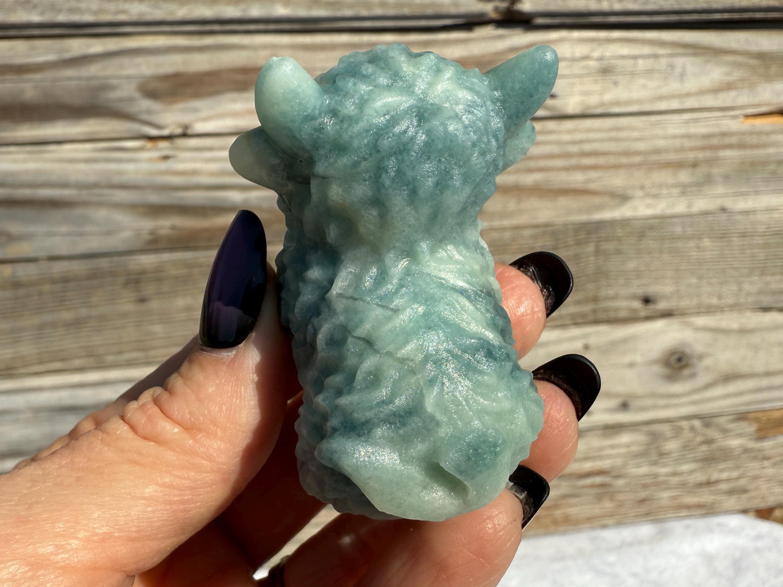 Add a touch of charm to your collection with this adorable Blue Sky Quartz Highland Cow Carving. Carved from genuine blue sky quartz, this piece features soft blue and white tones with beautiful natural variations. The detailed horns, textured fur, and polished finish make this highland cow a unique and eye-catching addition to any home décor or crystal display.