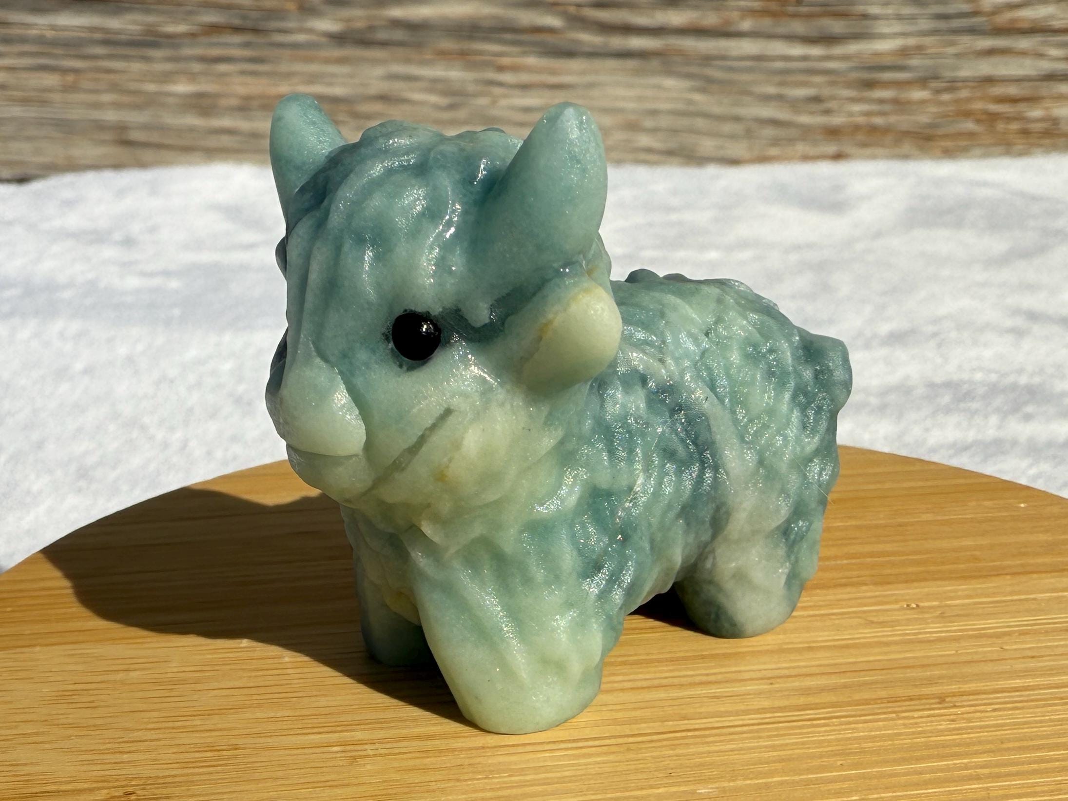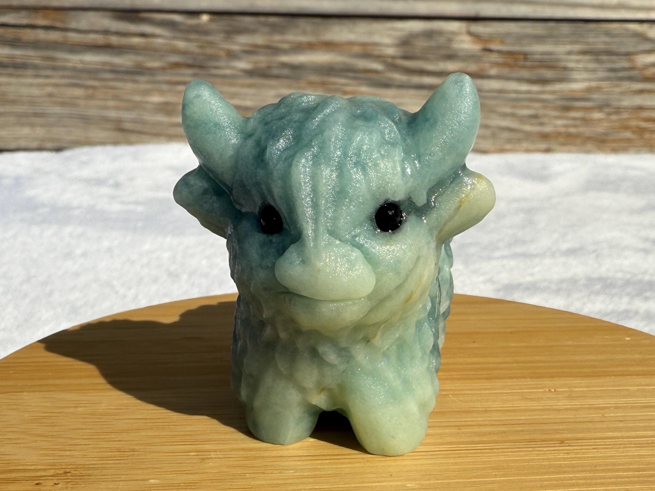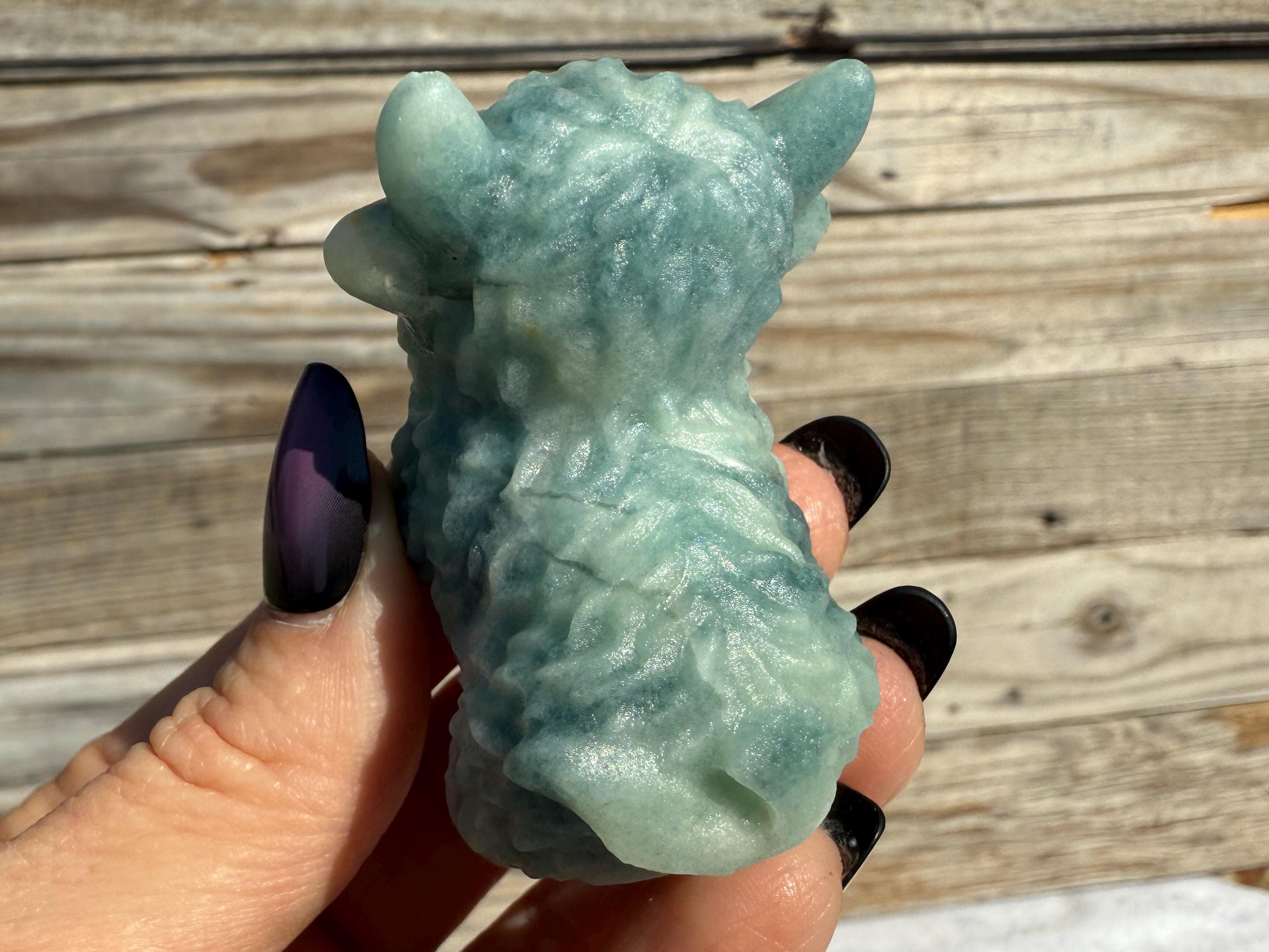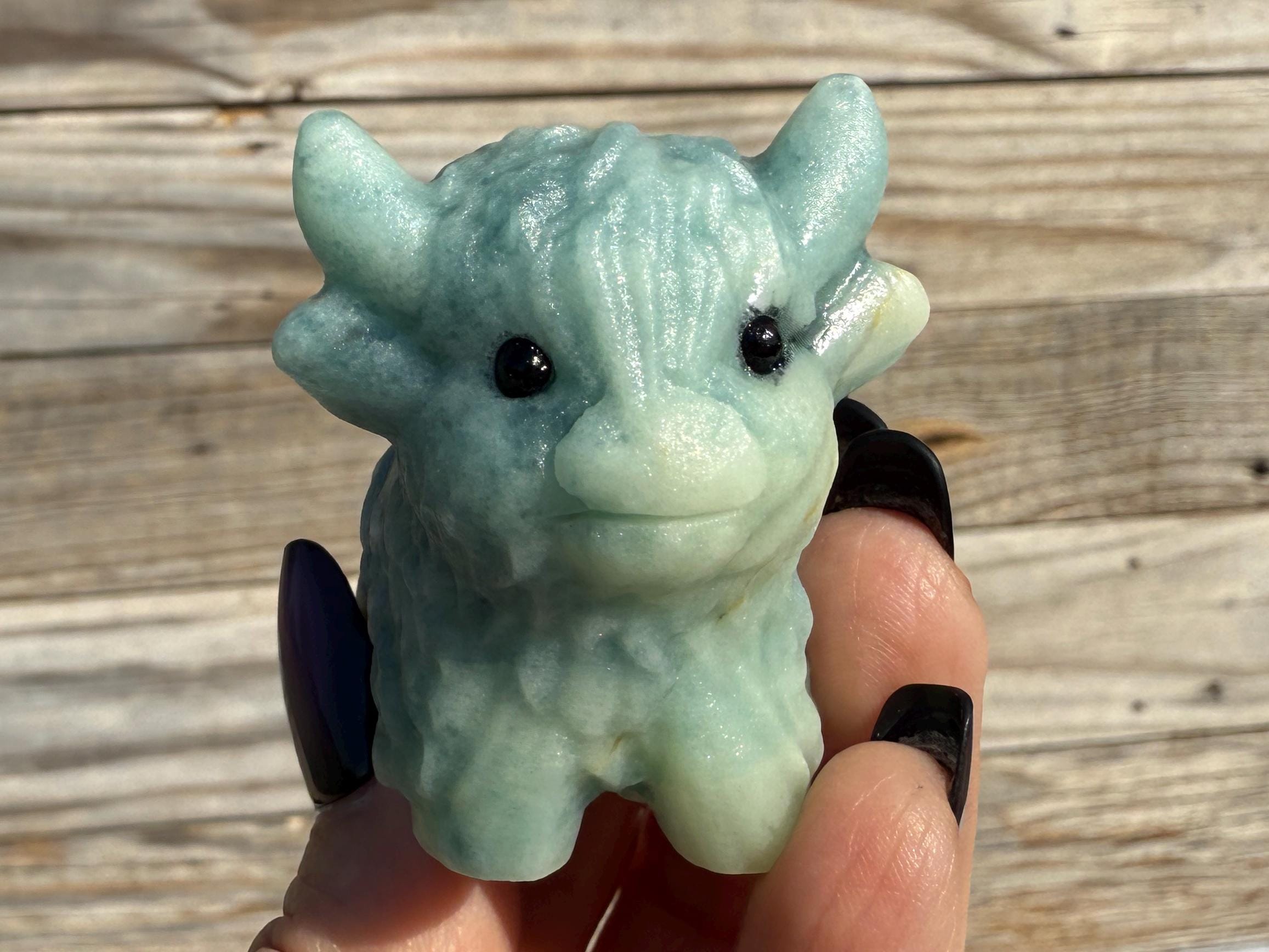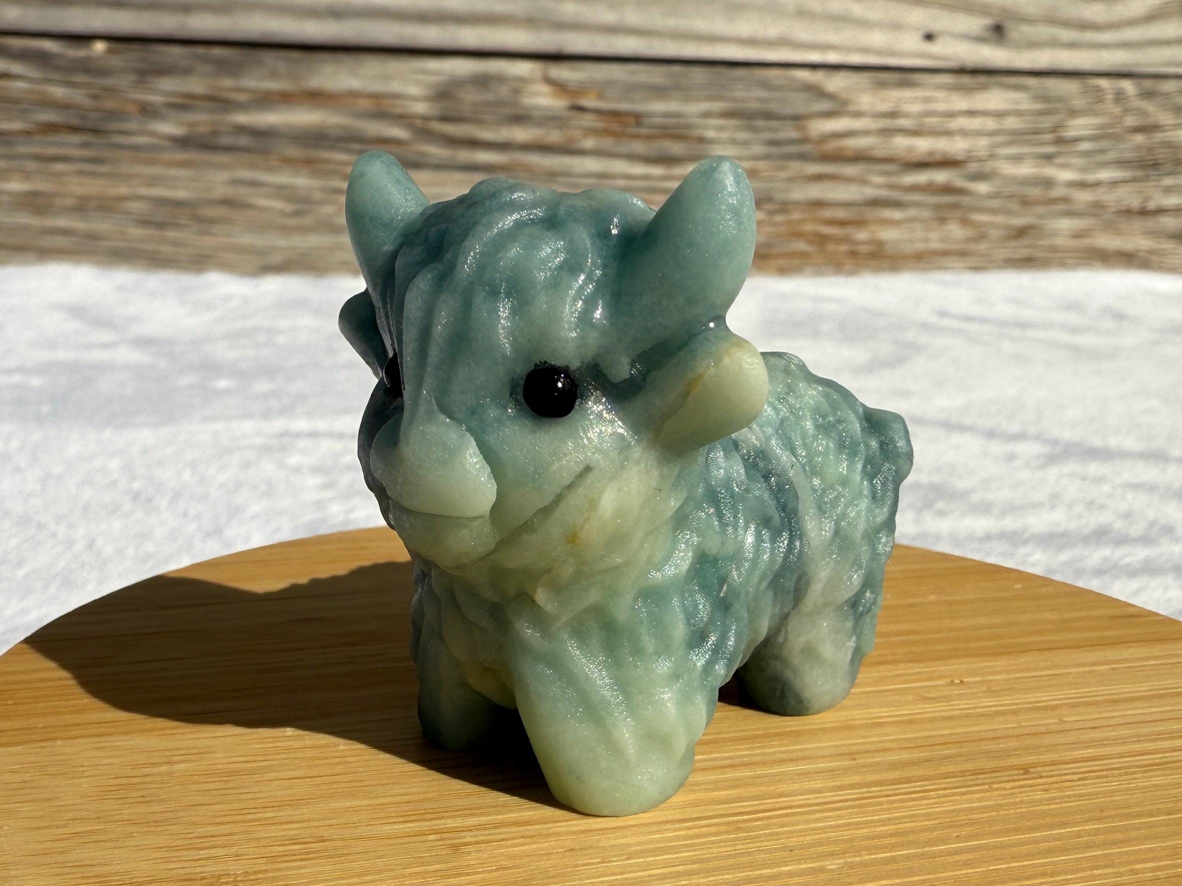 Add a touch of charm to your collection with this adorable Blue Sky Quartz Highland Cow Carving. Carved from genuine blue sky quartz, this piece features soft blue and white tones with beautiful natural variations. The detailed horns, textured fur, and polished finish make this highland cow a unique and eye-catching addition to any home décor or crystal display.
