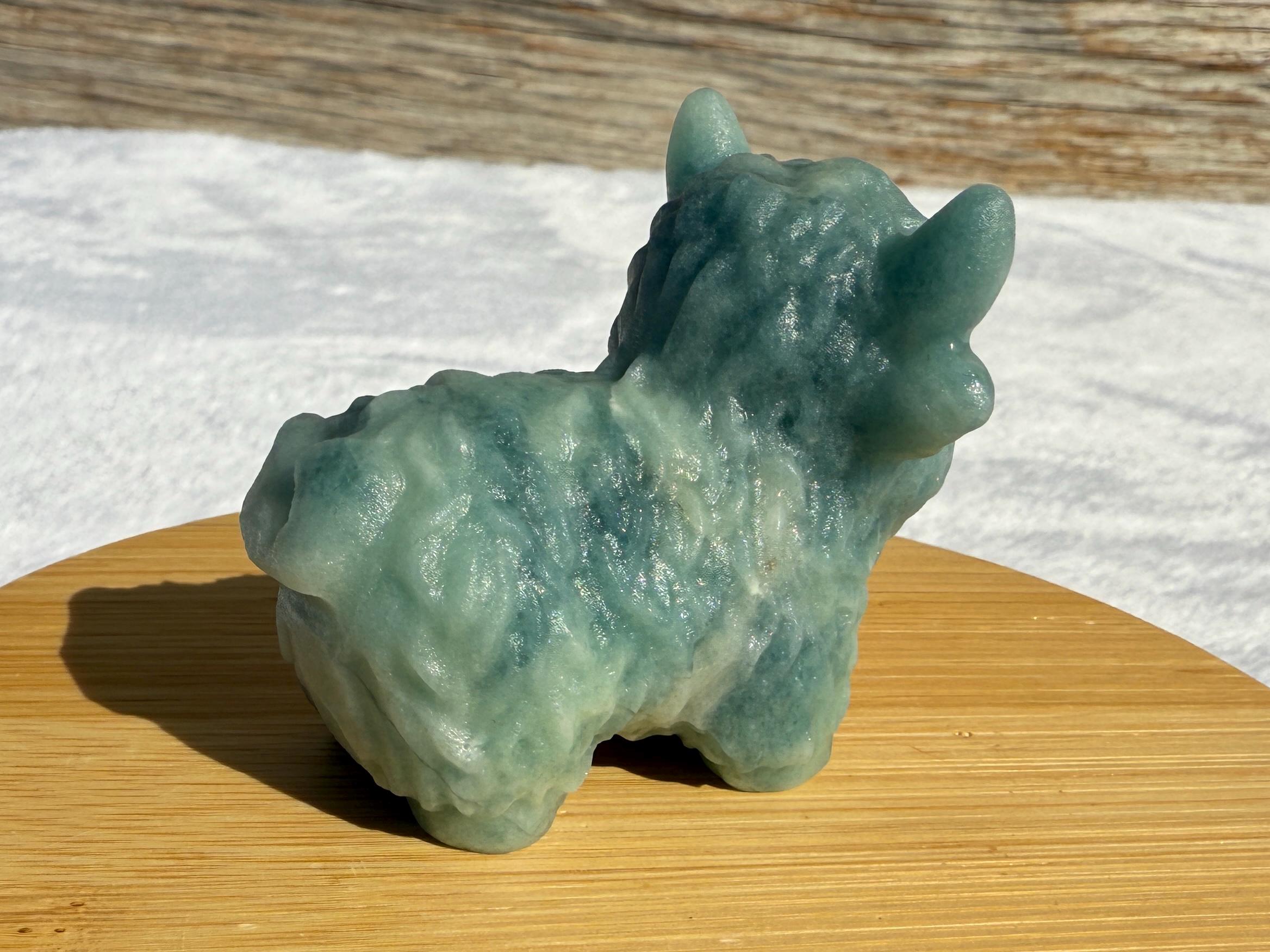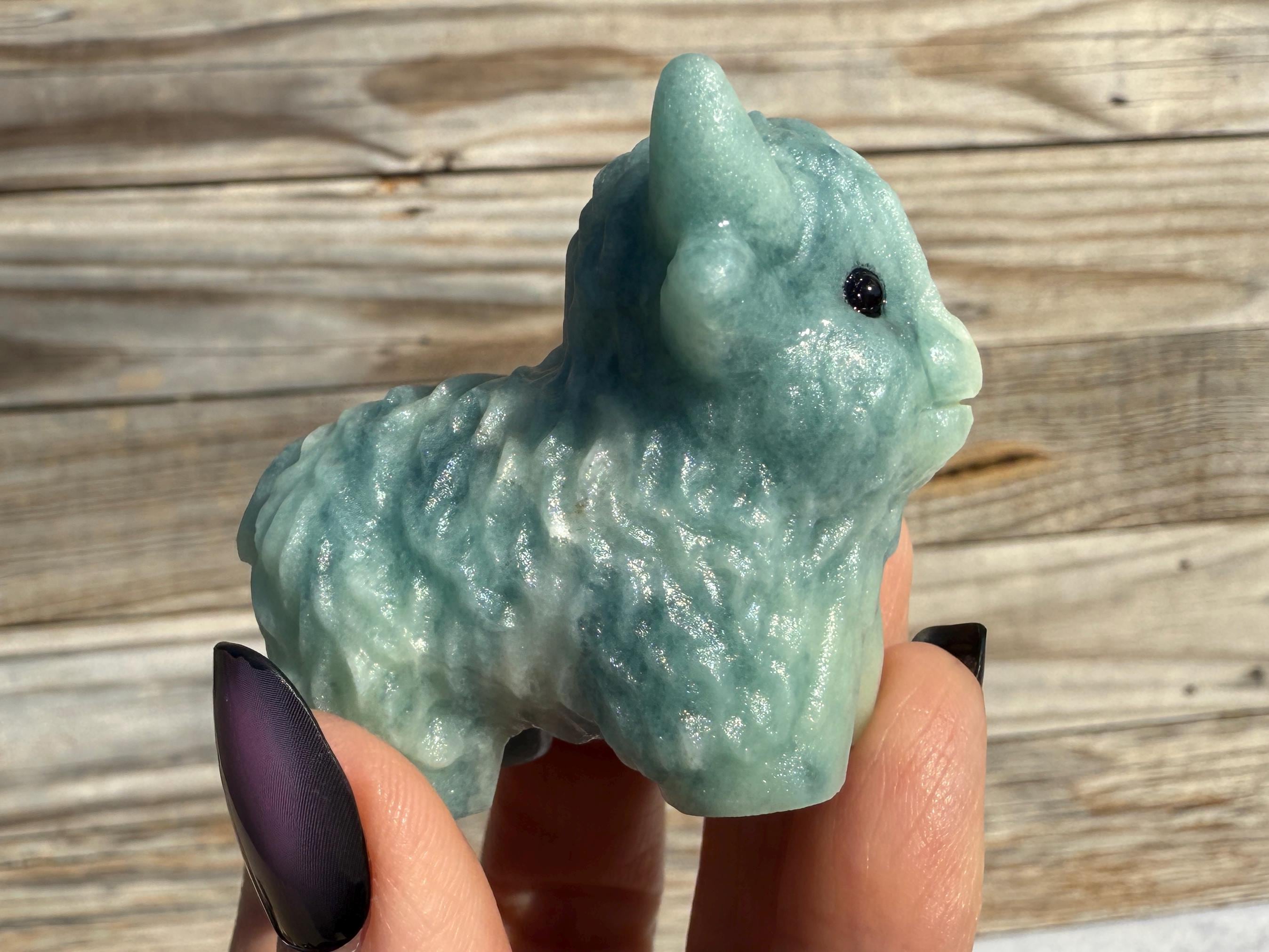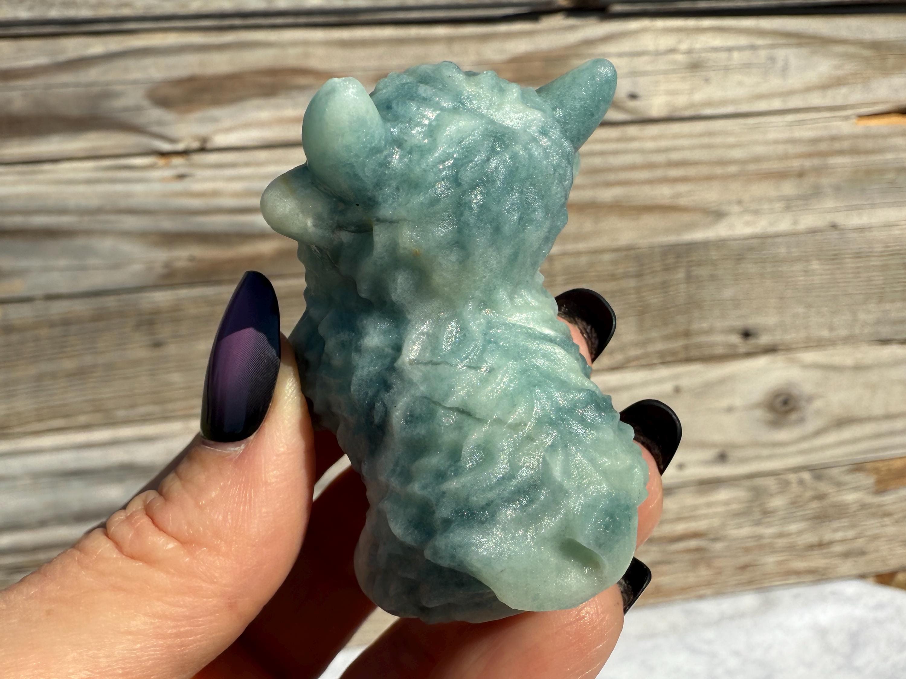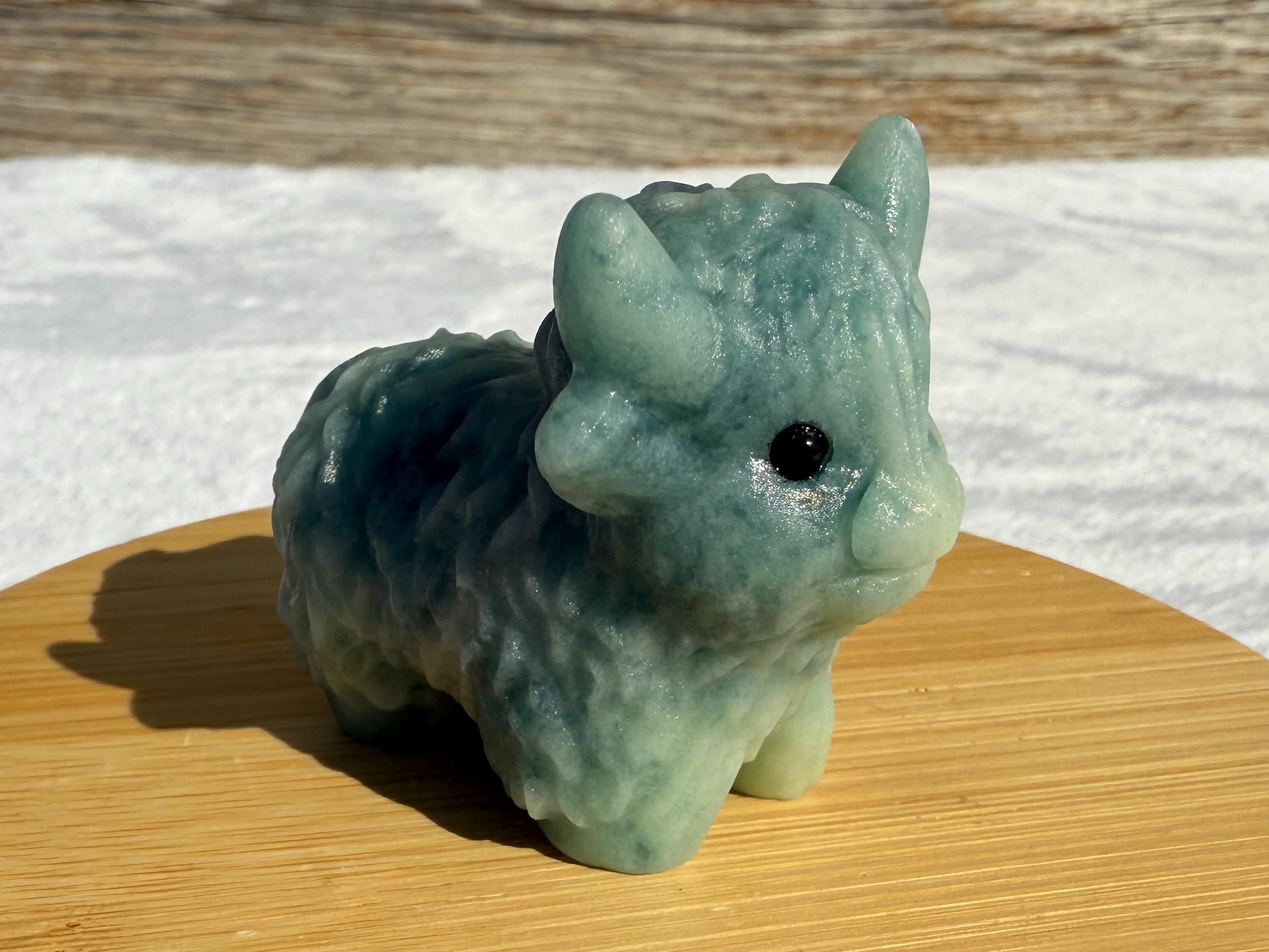 Add a touch of charm to your collection with this adorable Blue Sky Quartz Highland Cow Carving. Carved from genuine blue sky quartz, this piece features soft blue and white tones with beautiful natural variations. The detailed horns, textured fur, and polished finish make this highland cow a unique and eye-catching addition to any home décor or crystal display.