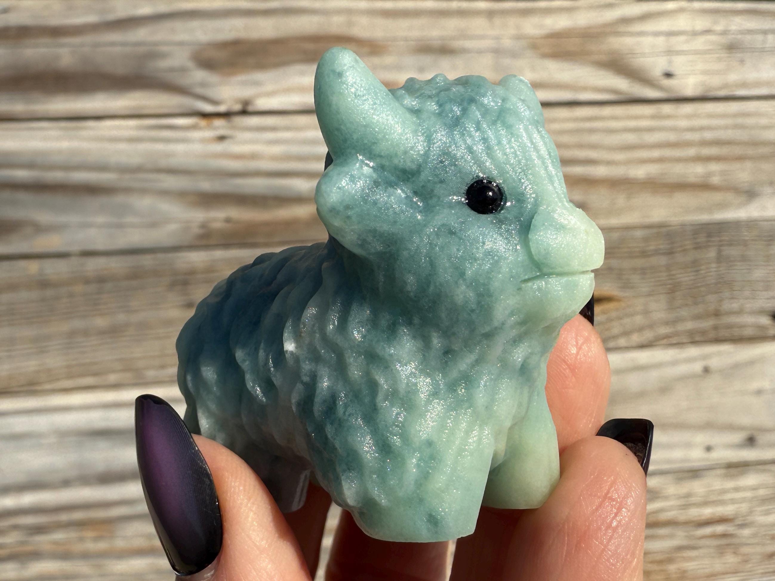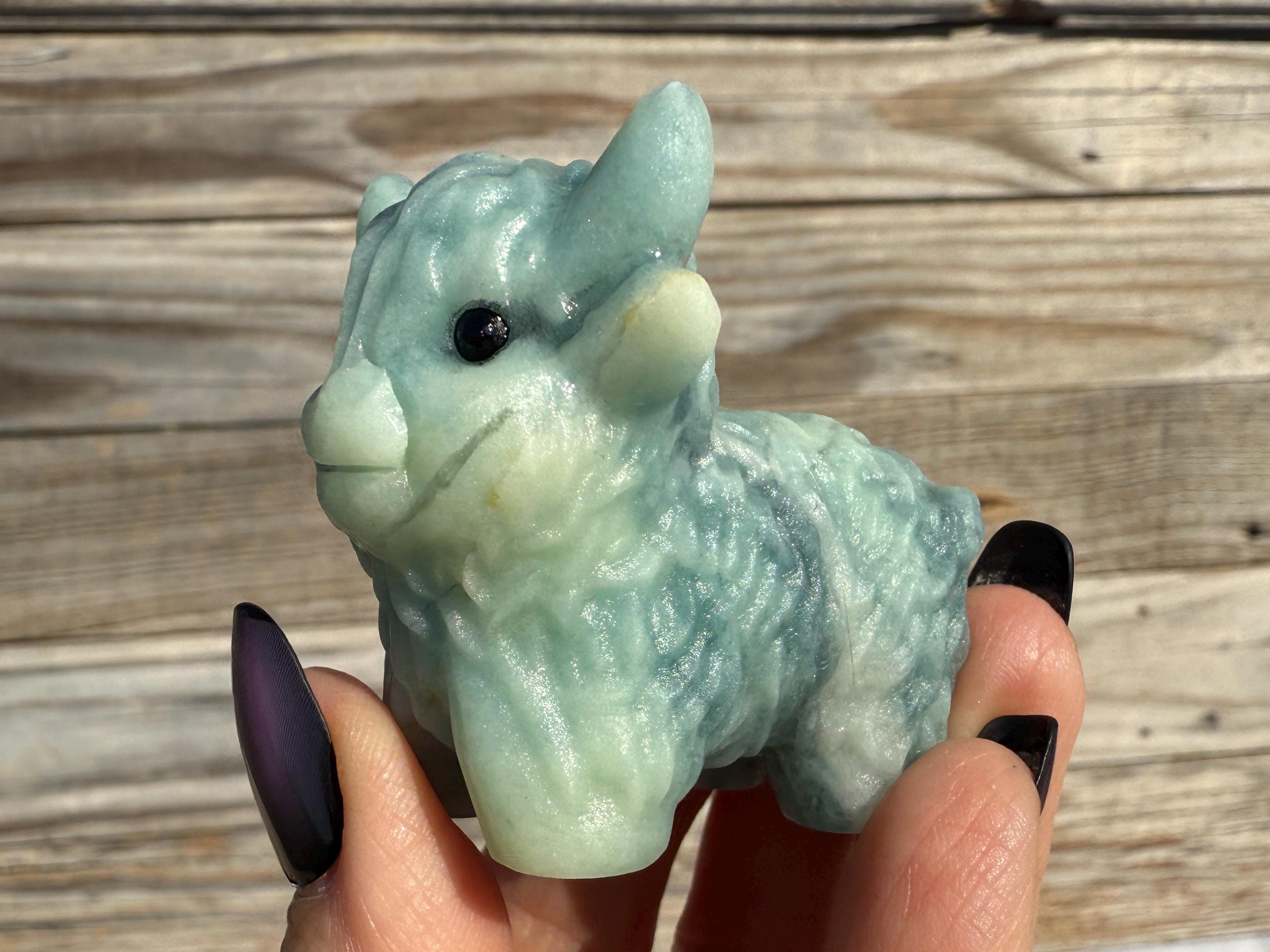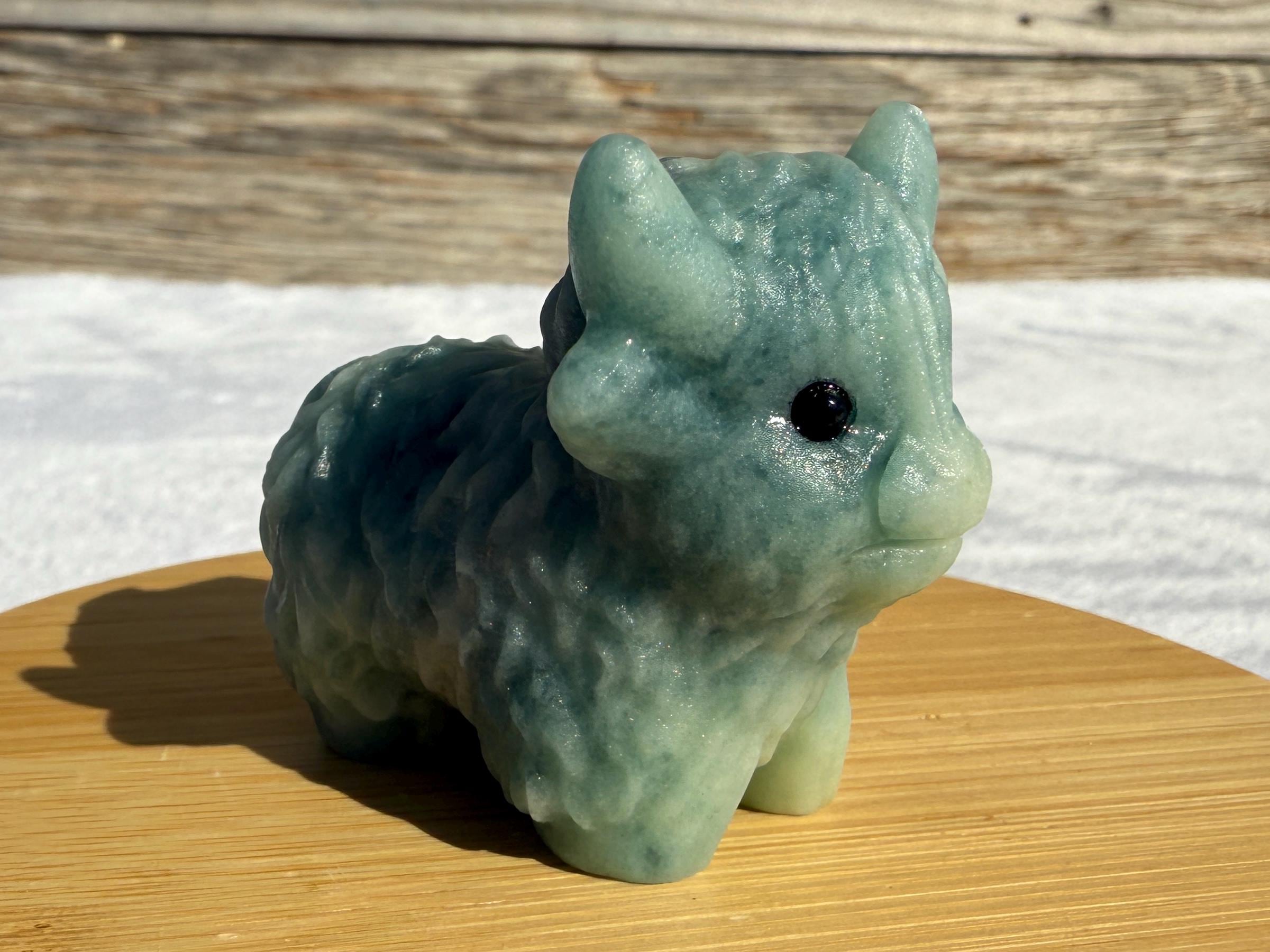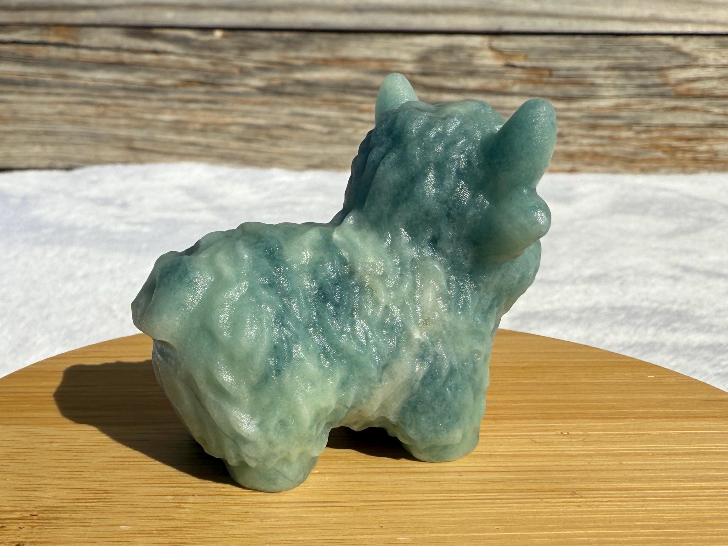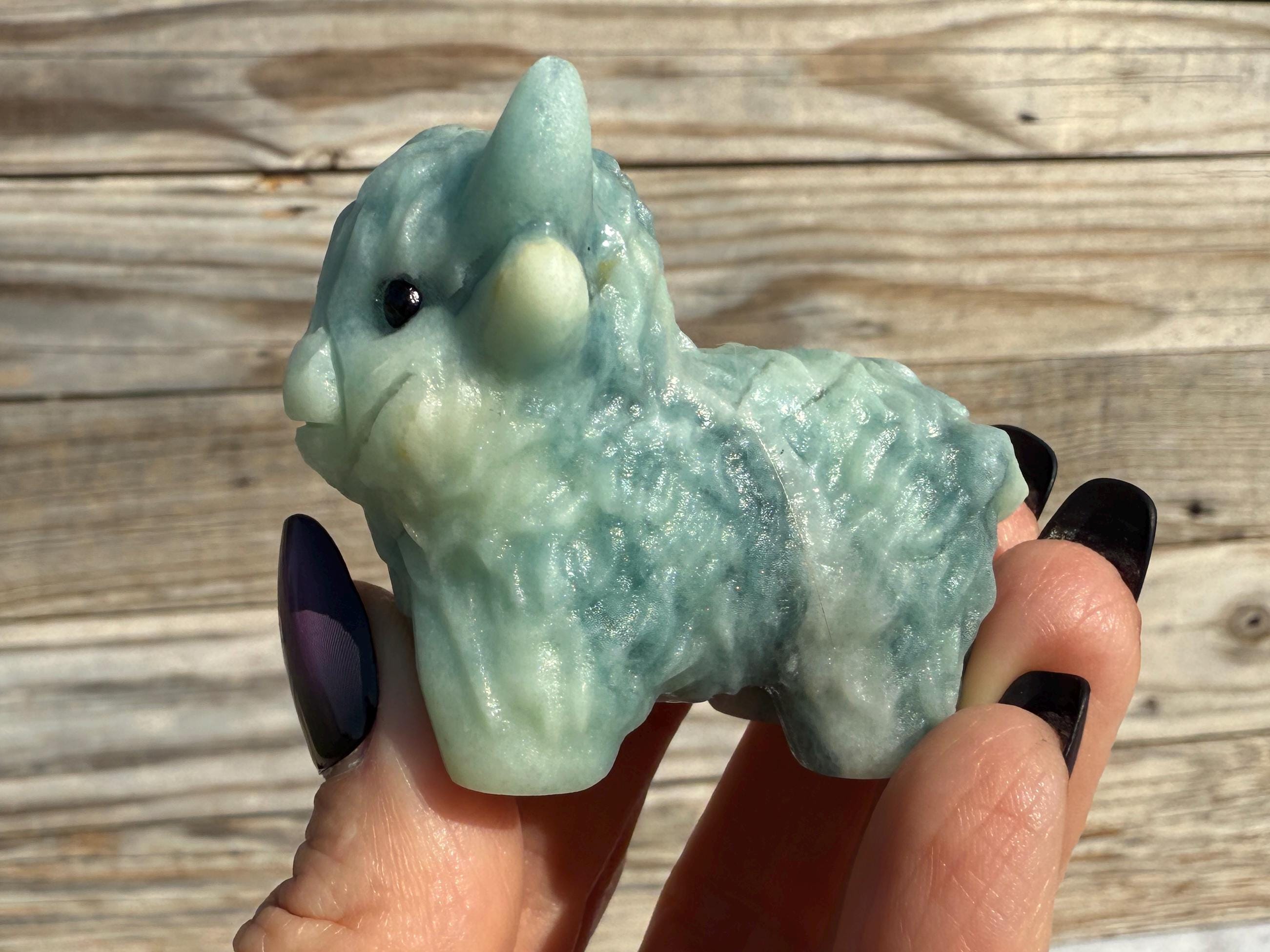 Add a touch of charm to your collection with this adorable Blue Sky Quartz Highland Cow Carving. Carved from genuine blue sky quartz, this piece features soft blue and white tones with beautiful natural variations. The detailed horns, textured fur, and polished finish make this highland cow a unique and eye-catching addition to any home décor or crystal display.