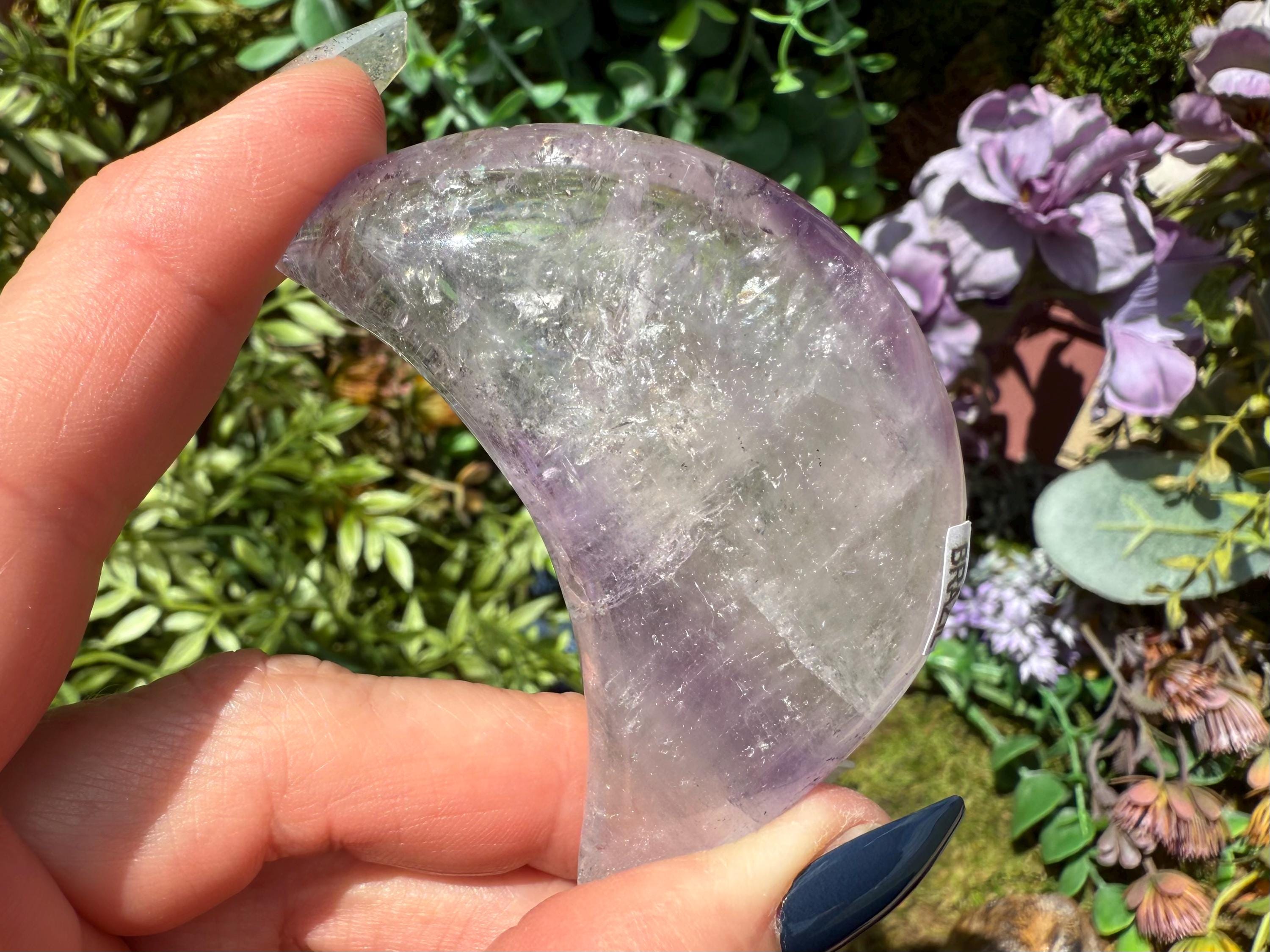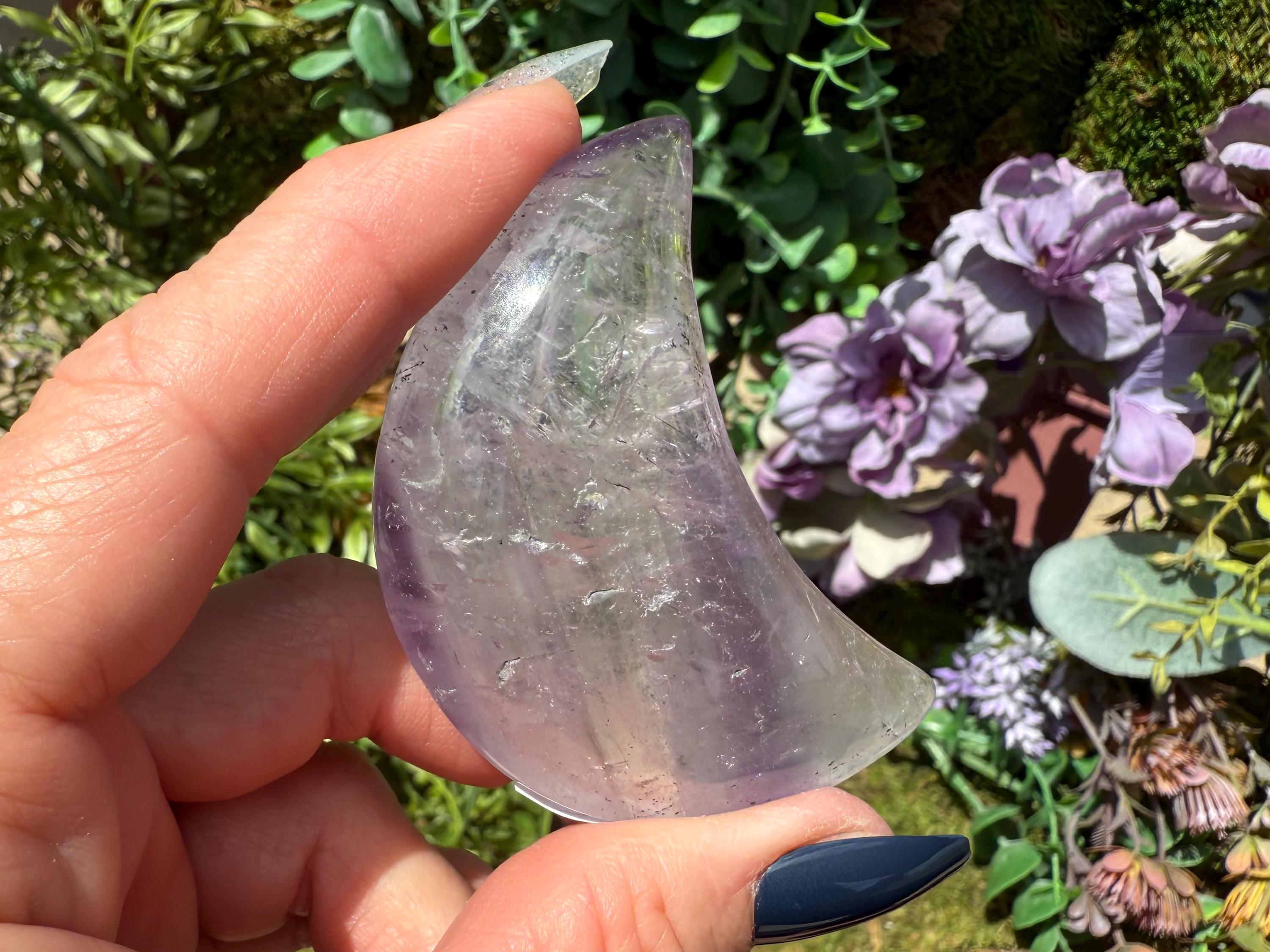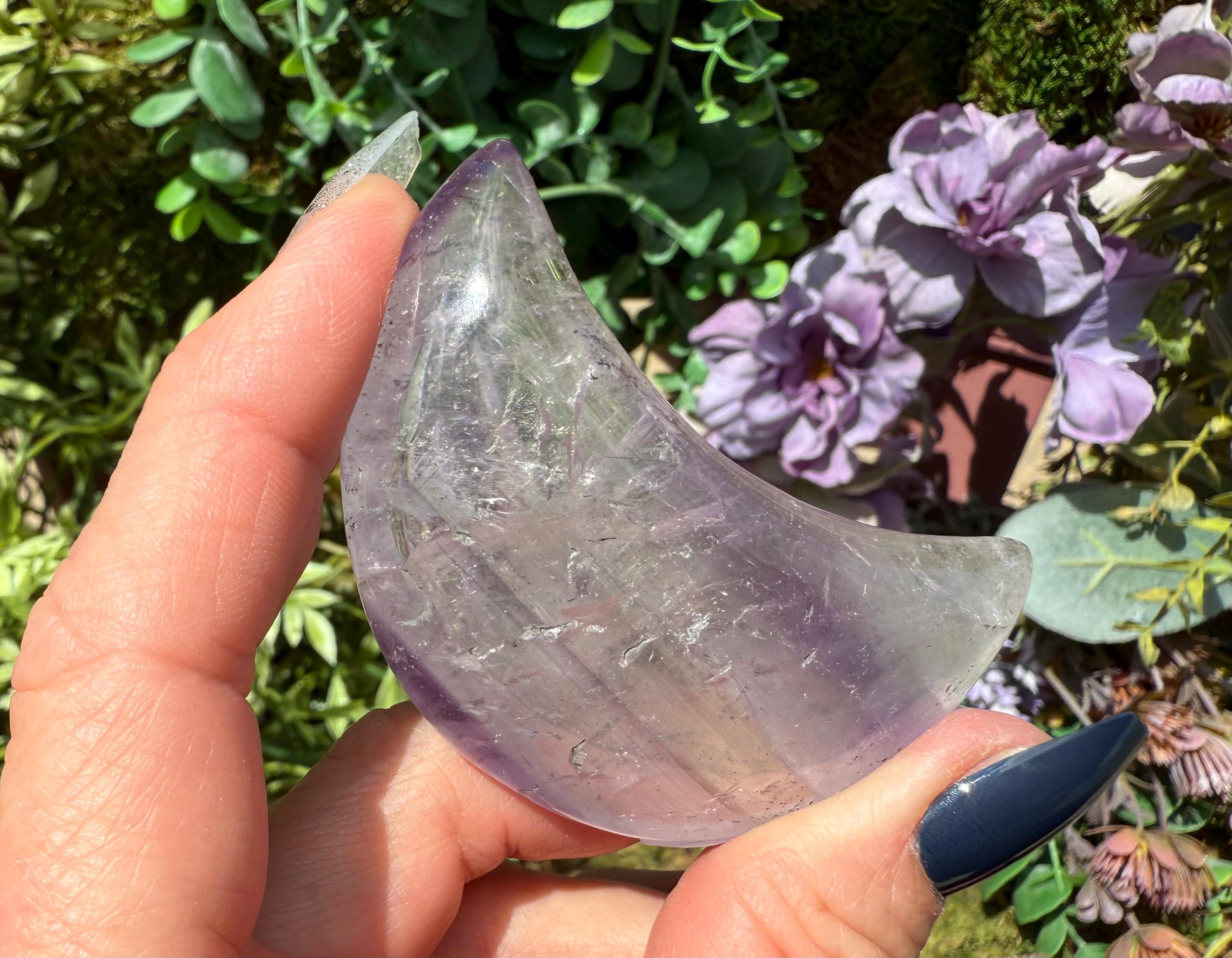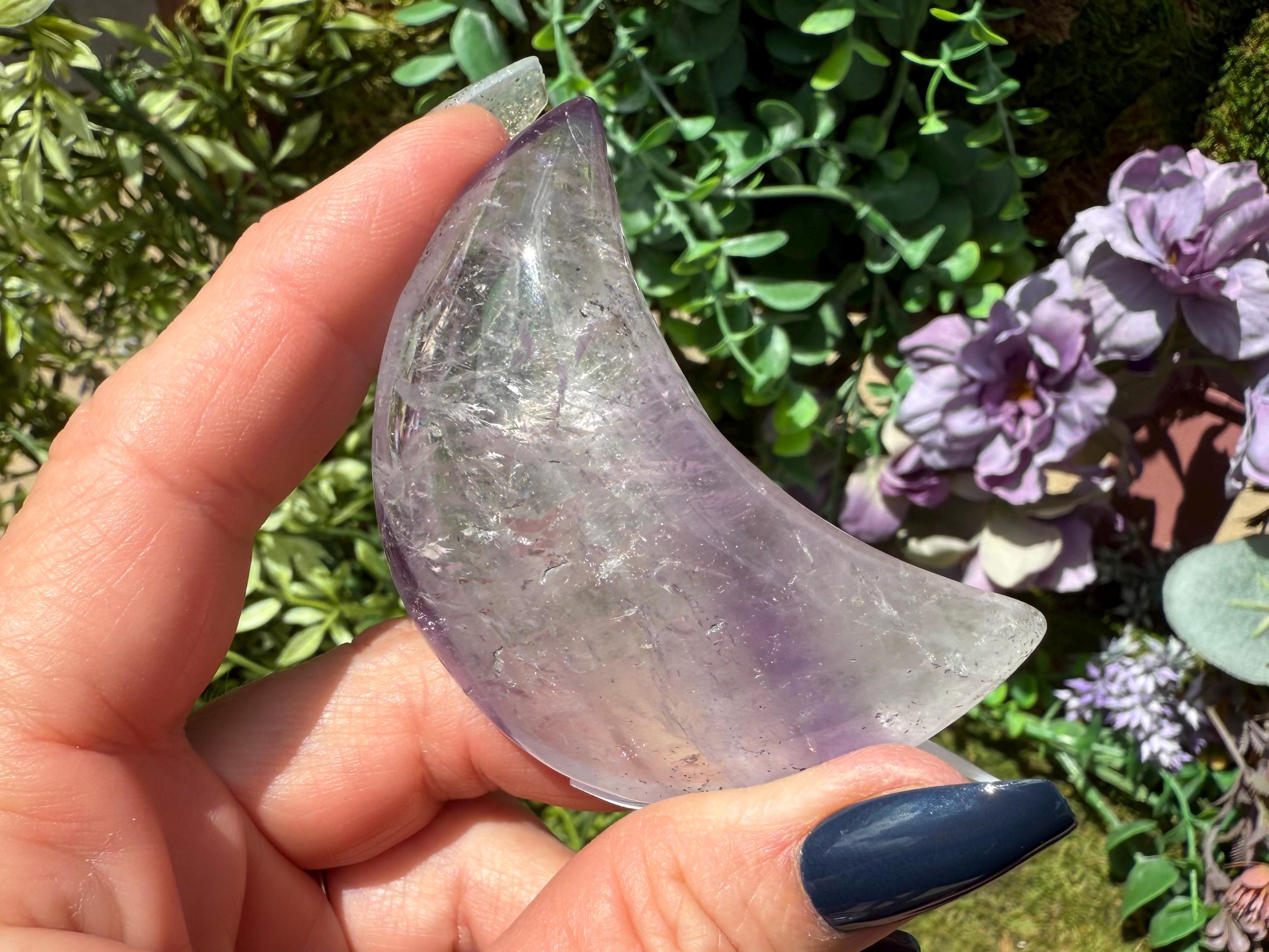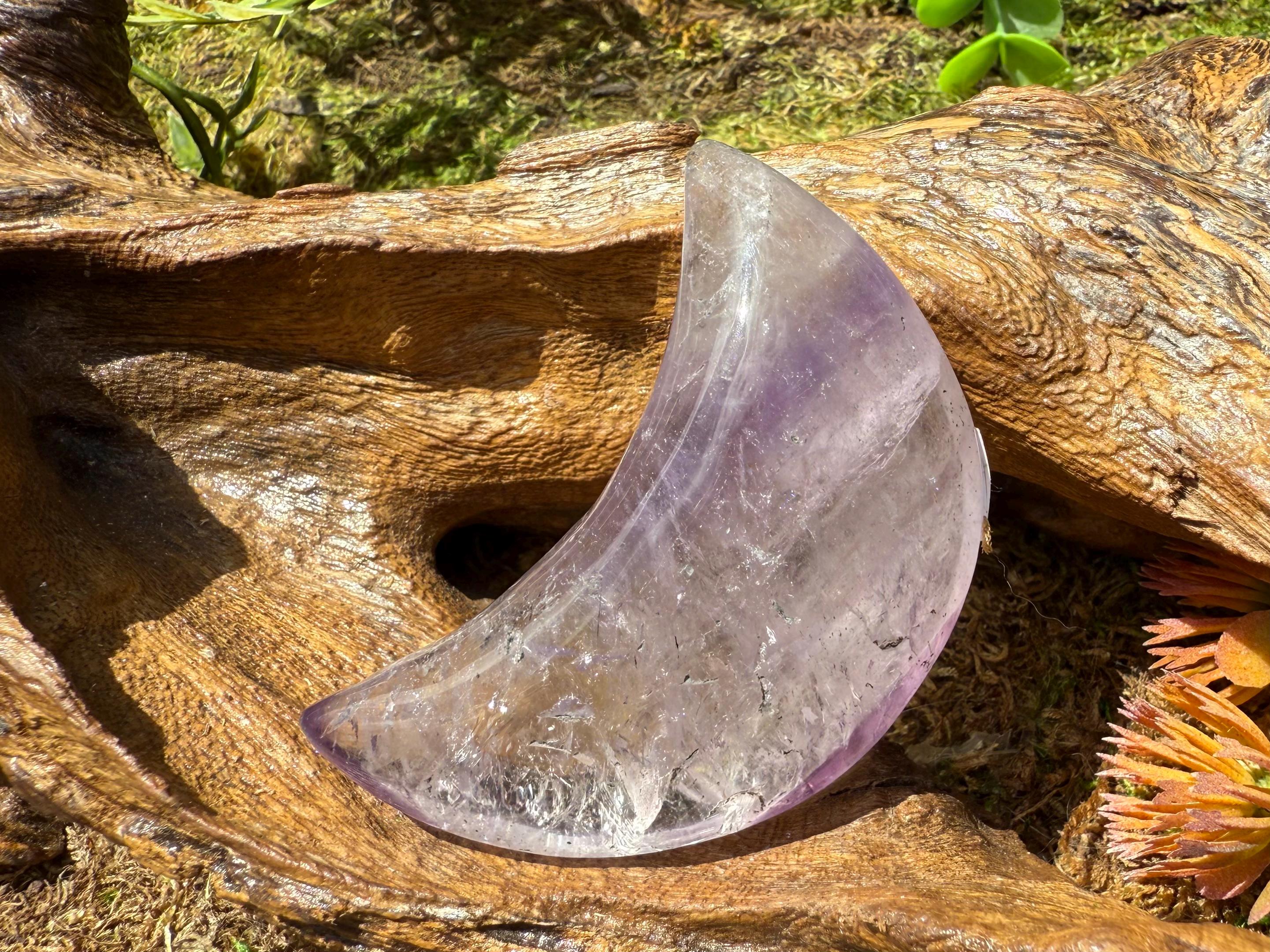Bring mystical beauty and transformative energy into your space with this Phantom Amethyst Crescent Moon, sourced from Brazil. Polished to a smooth finish, this piece reveals delicate “phantom” formations inside the stone — ghost-like layers that reflect stages of the crystal’s growth over time.