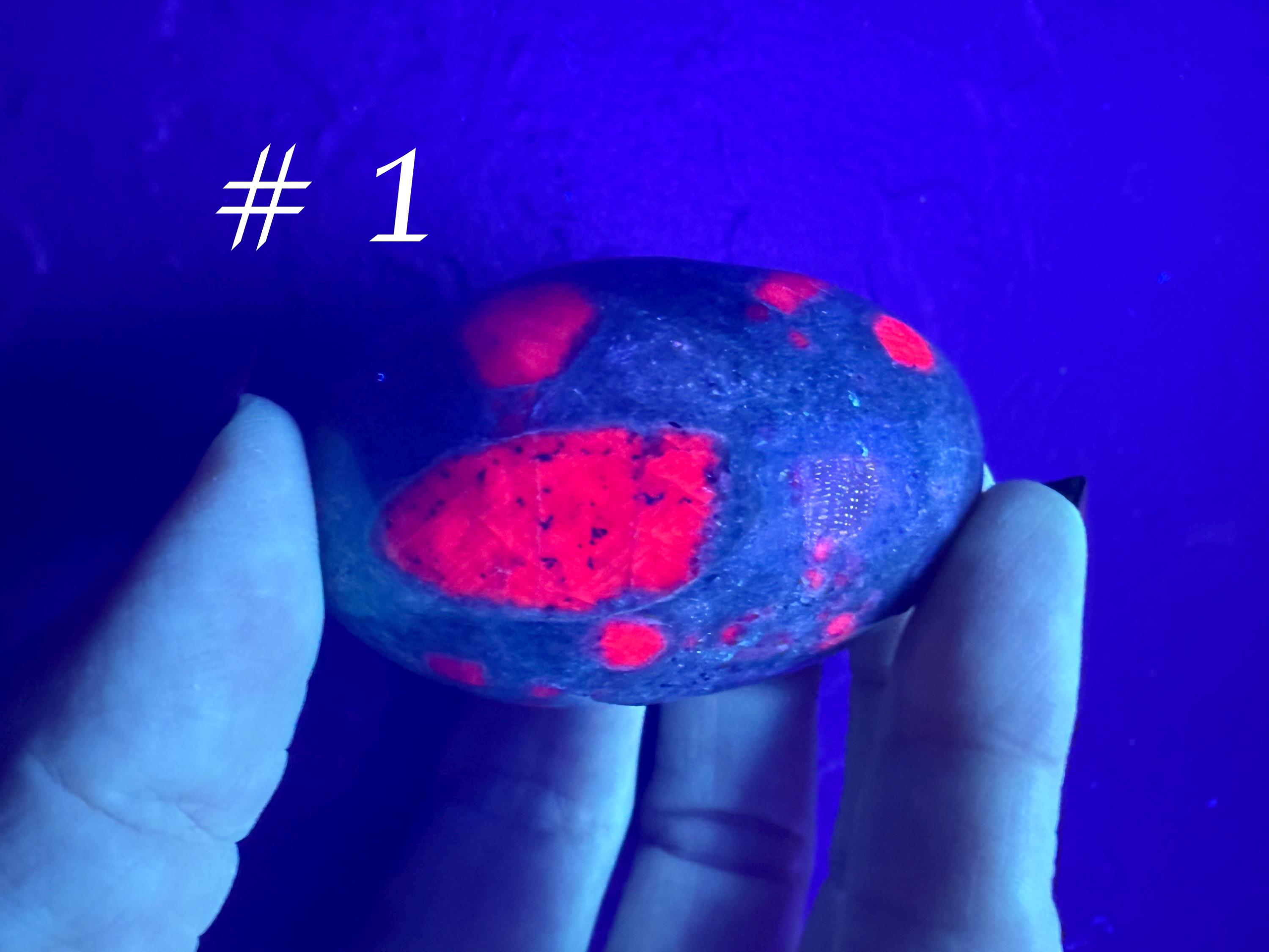 Experience the captivating beauty of these Ruby in Fuchsite Shiva Stones, polished to a smooth oval finish. Each piece showcases a vibrant blend of deep red ruby crystals naturally embedded in lush green fuchsite. Under UV light, the ruby inclusions glow with a stunning fluorescent pink-red hue, revealing an extra layer of their natural charm.