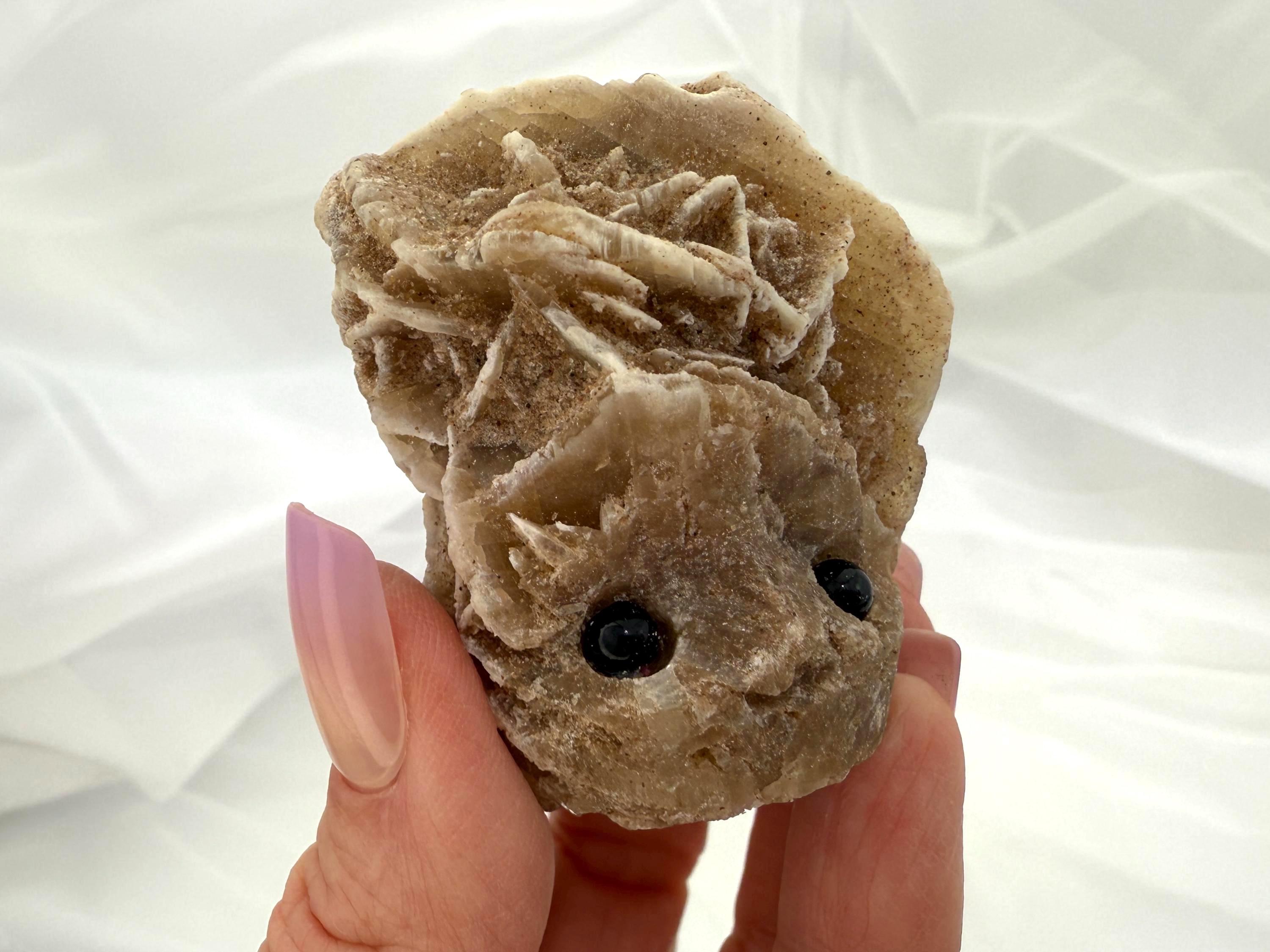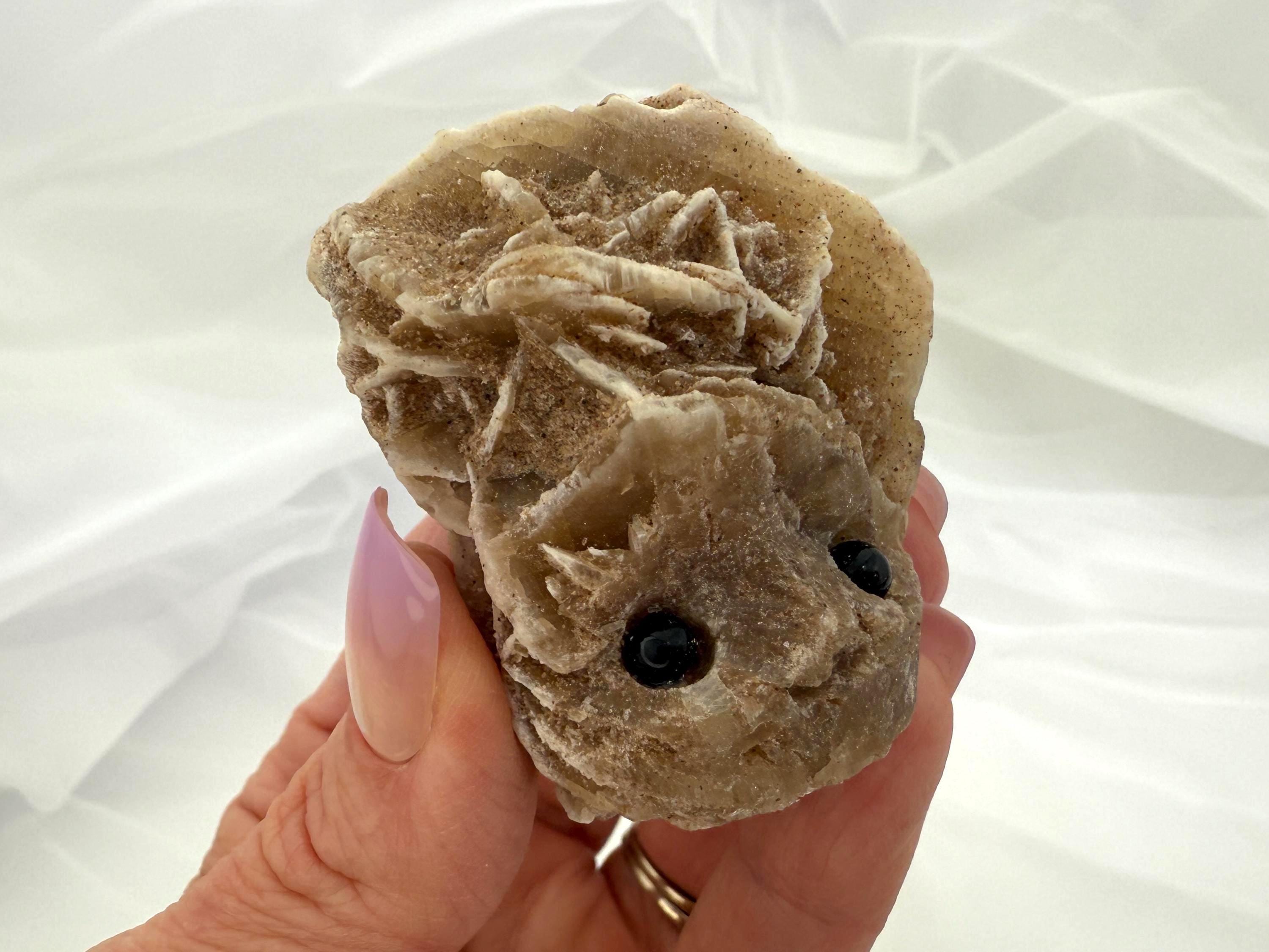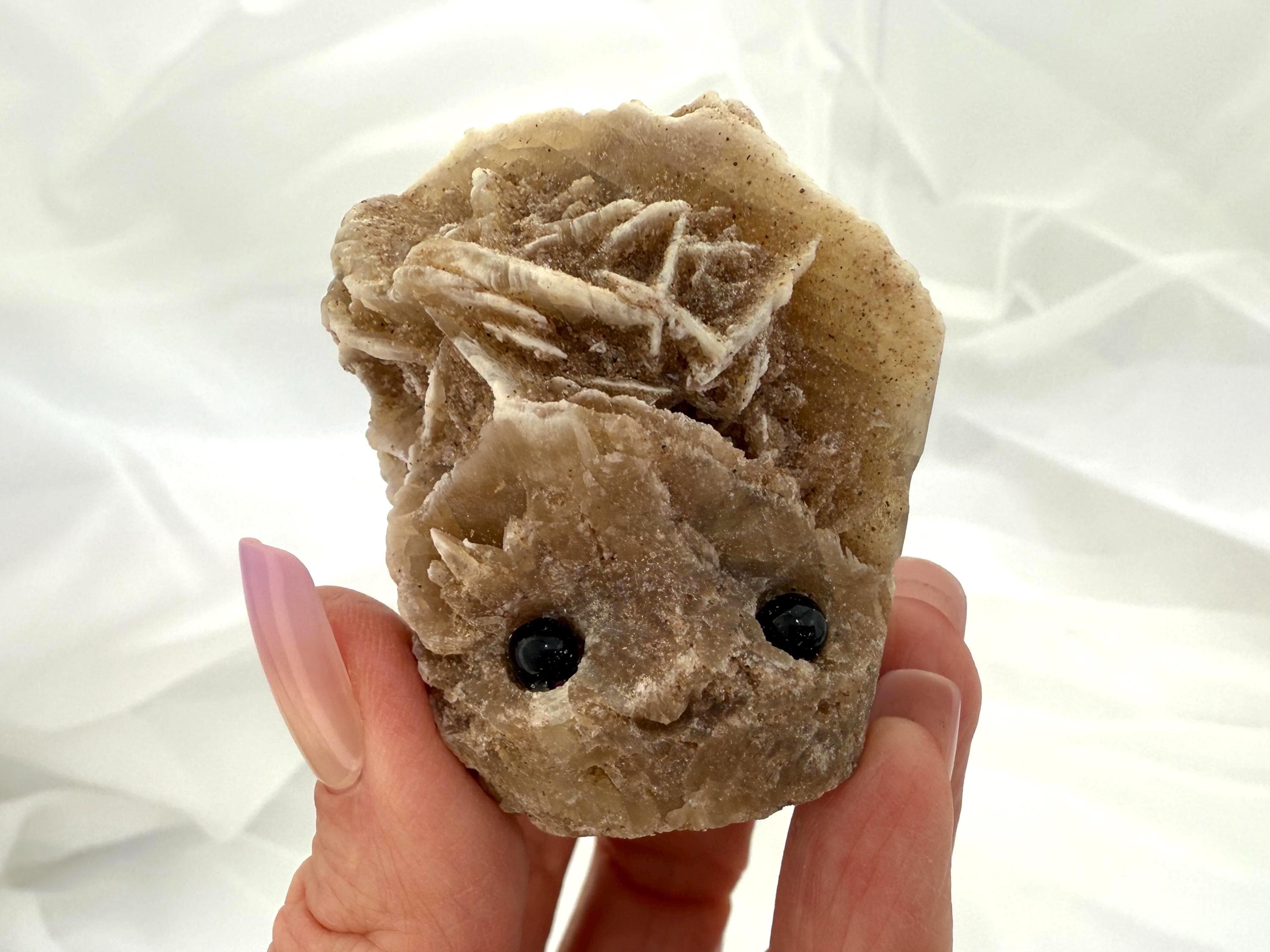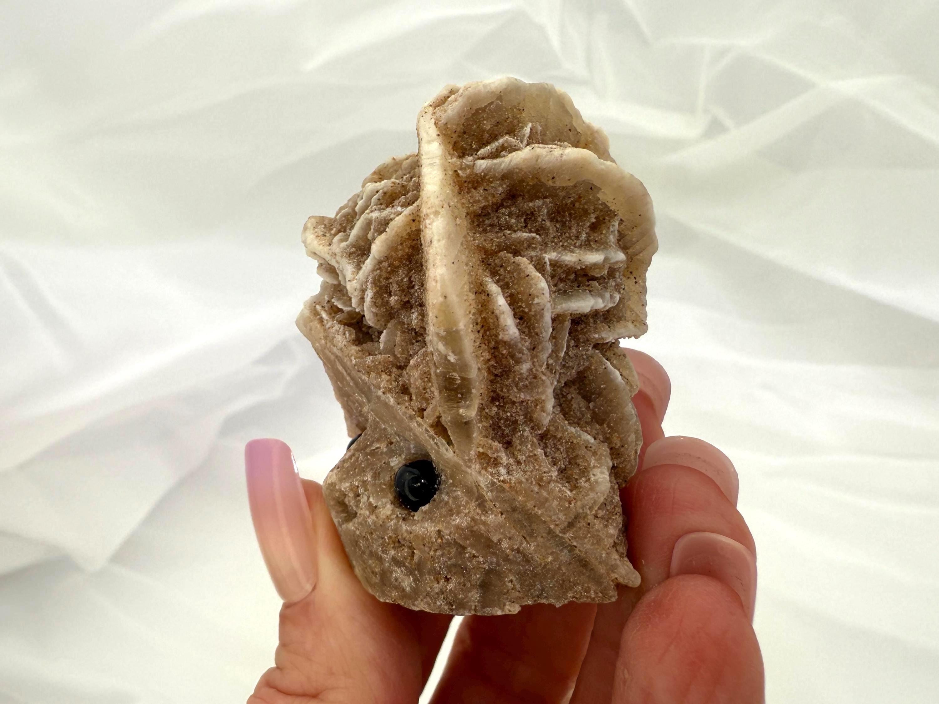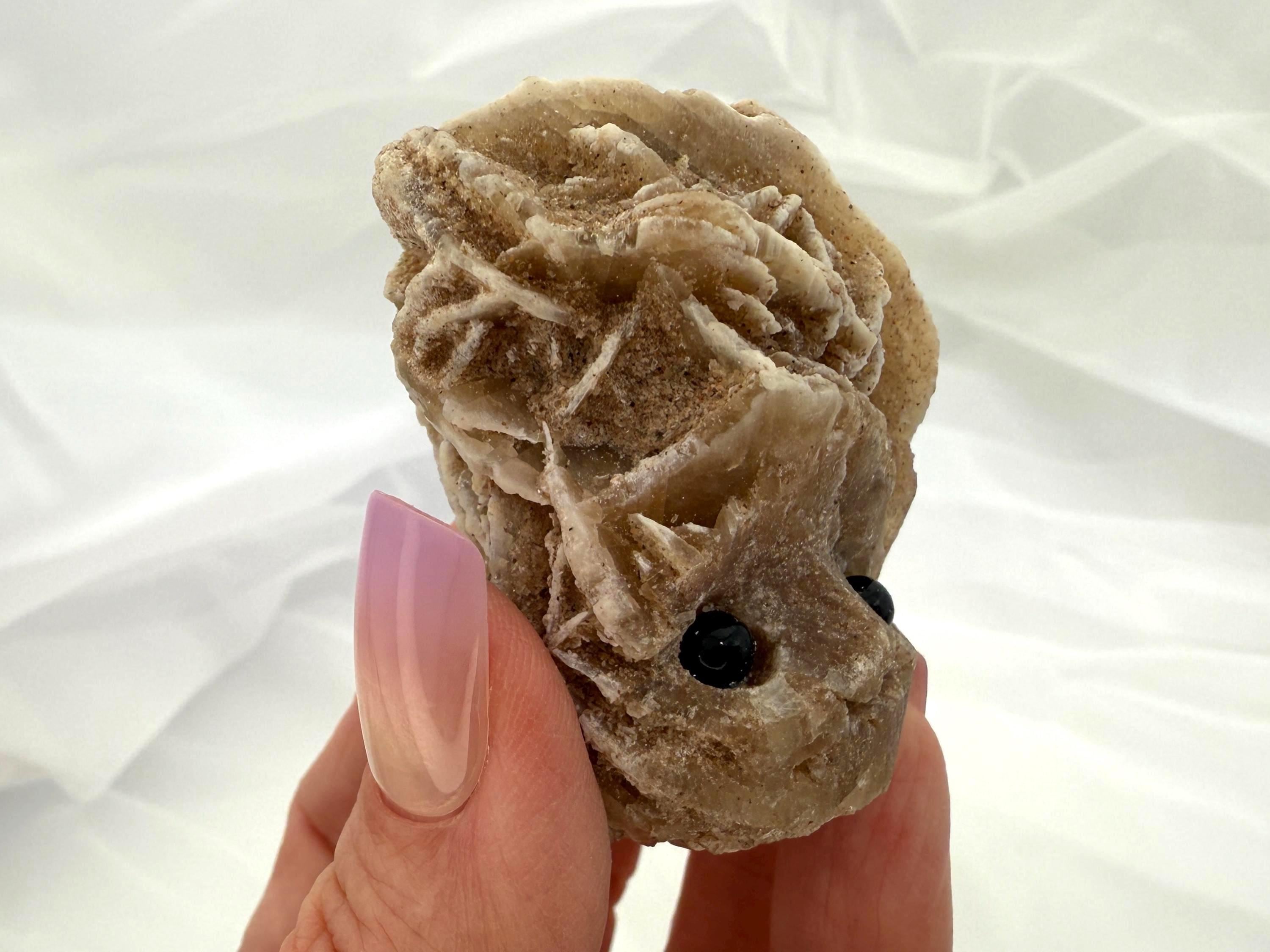 Meet your new Desert Rose Selenite Crystal Buddy — a naturally formed rosette-shaped mineral with soft beige tones and beautiful layered crystal petals. Desert Rose Selenite is formed by wind and sand over time. This desert rose crystal buddy makes an adorable display accent, or a thoughtful gift for a crystal lover.