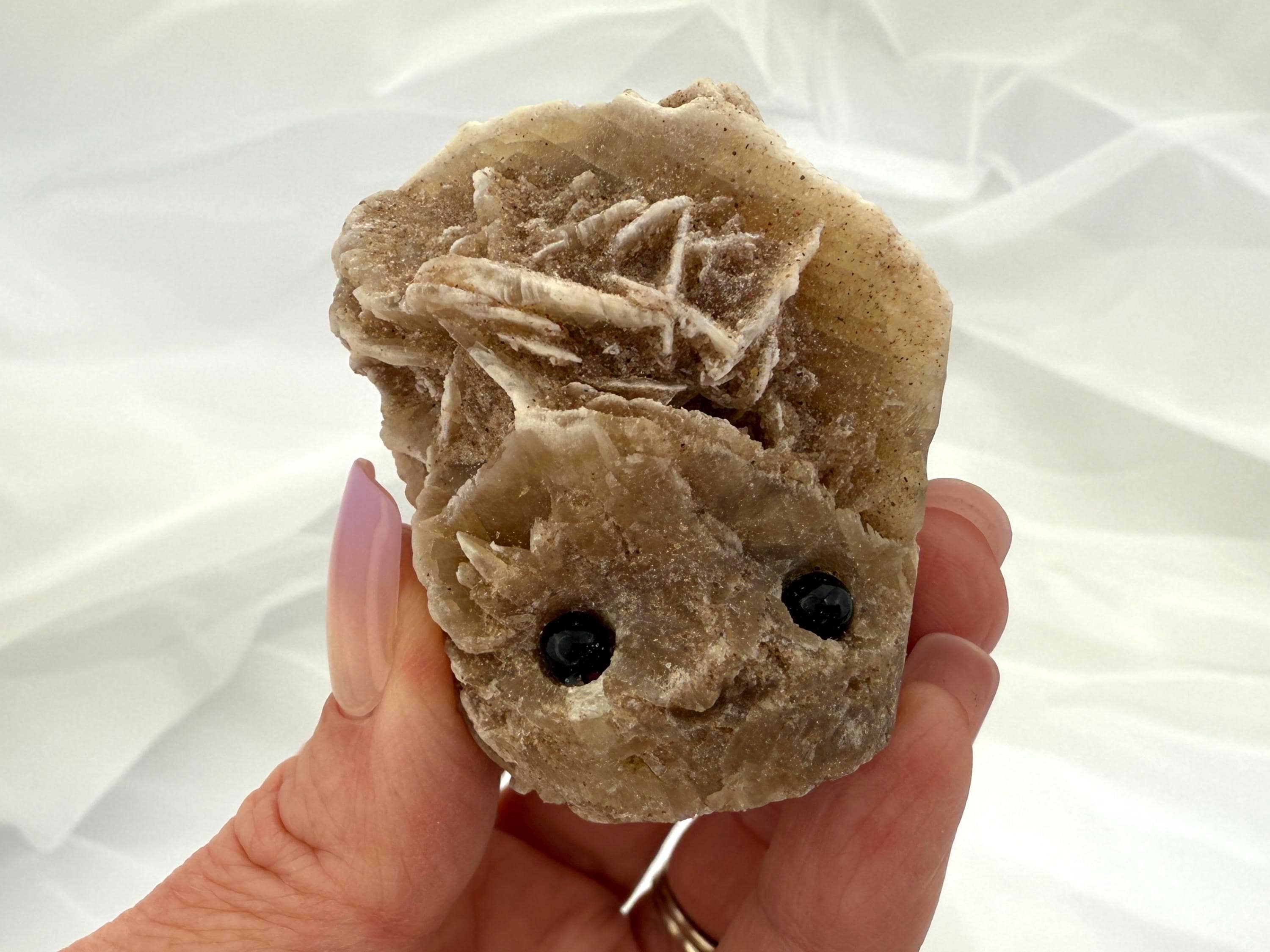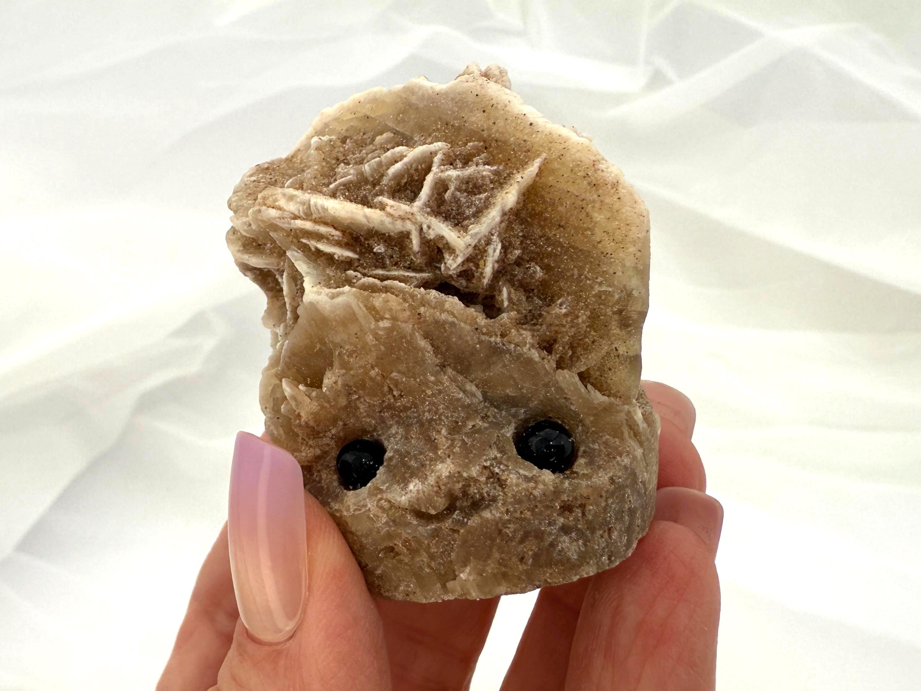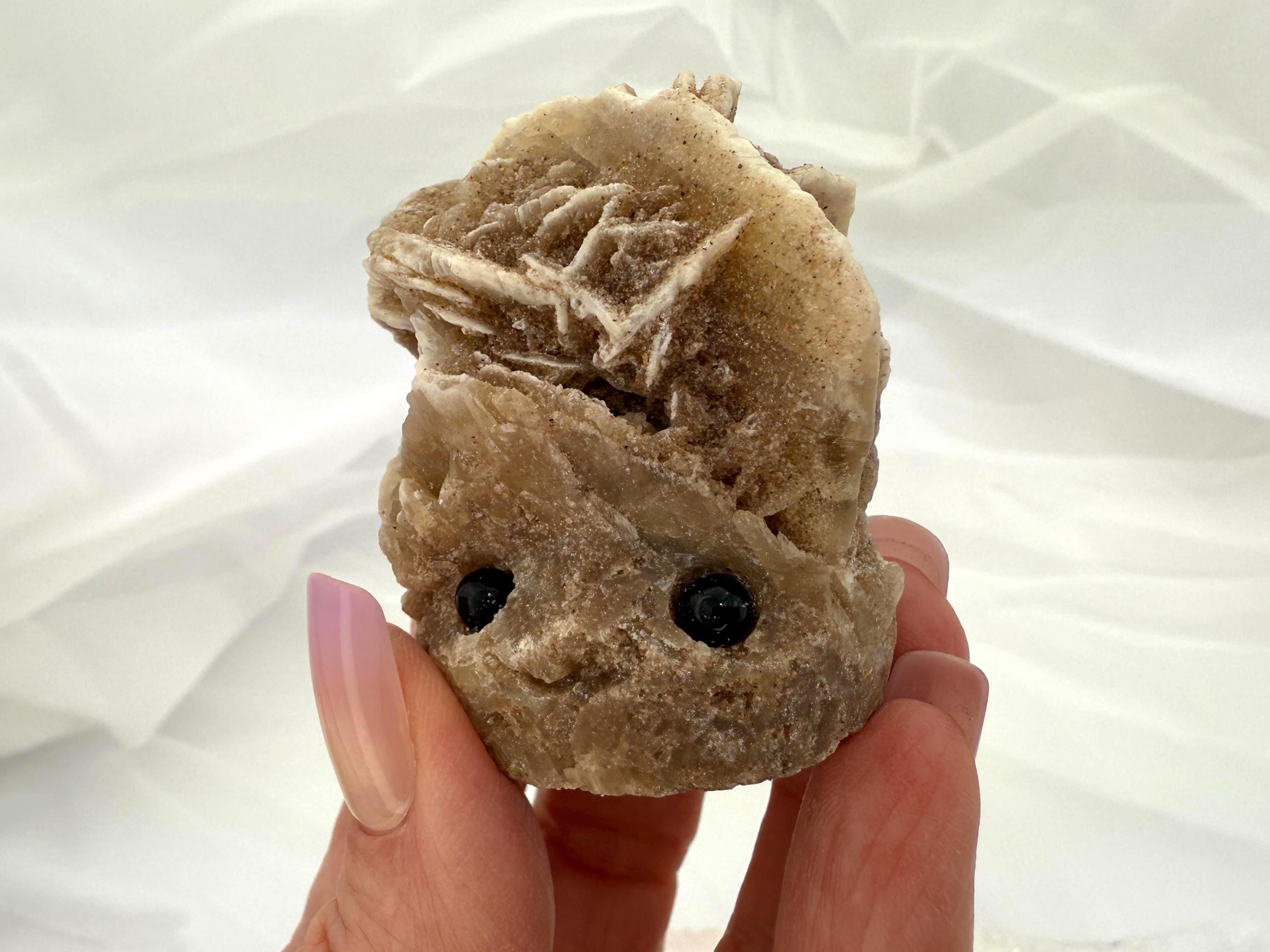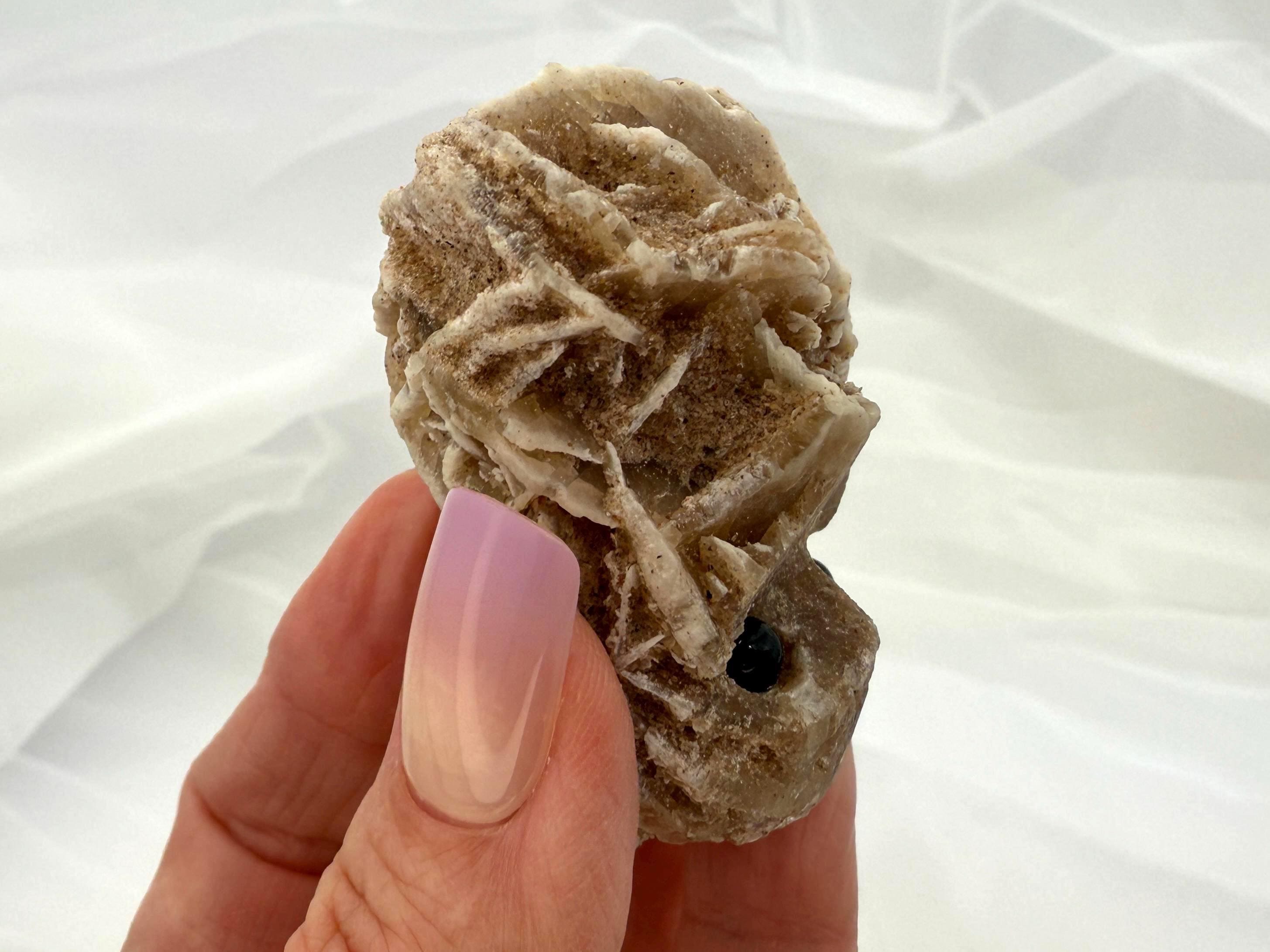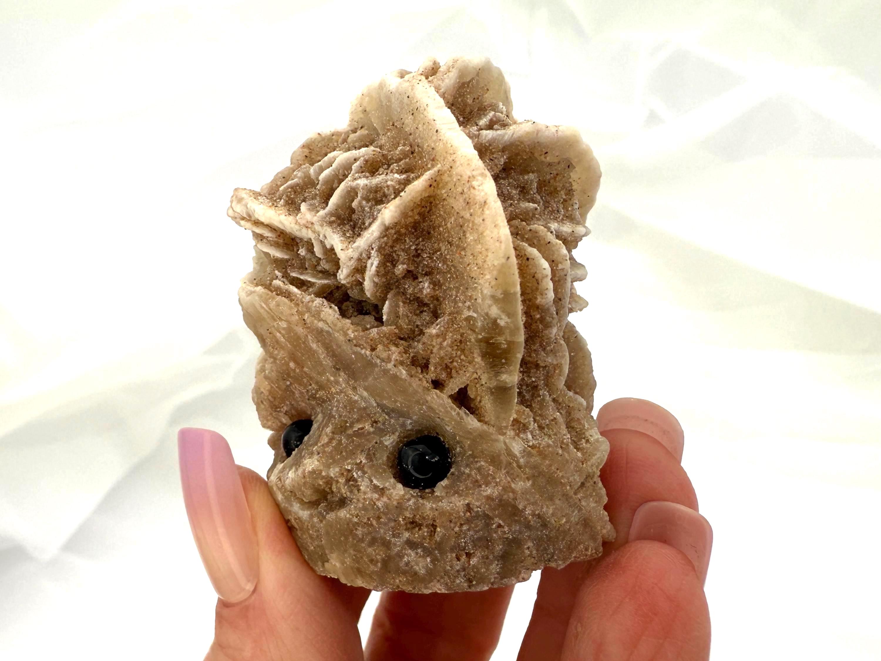 Meet your new Desert Rose Selenite Crystal Buddy — a naturally formed rosette-shaped mineral with soft beige tones and beautiful layered crystal petals. Desert Rose Selenite is formed by wind and sand over time. This desert rose crystal buddy makes an adorable display accent, or a thoughtful gift for a crystal lover.