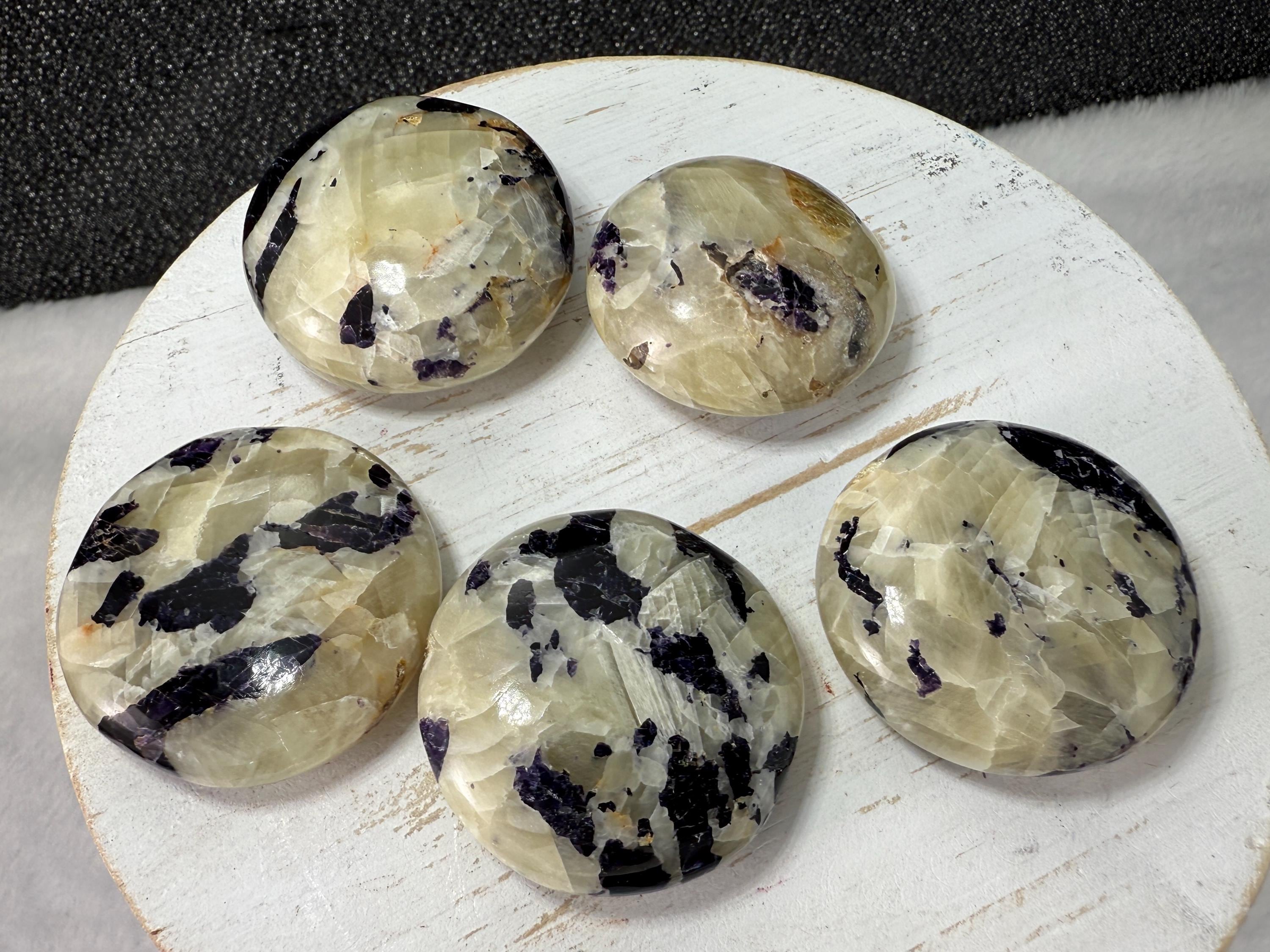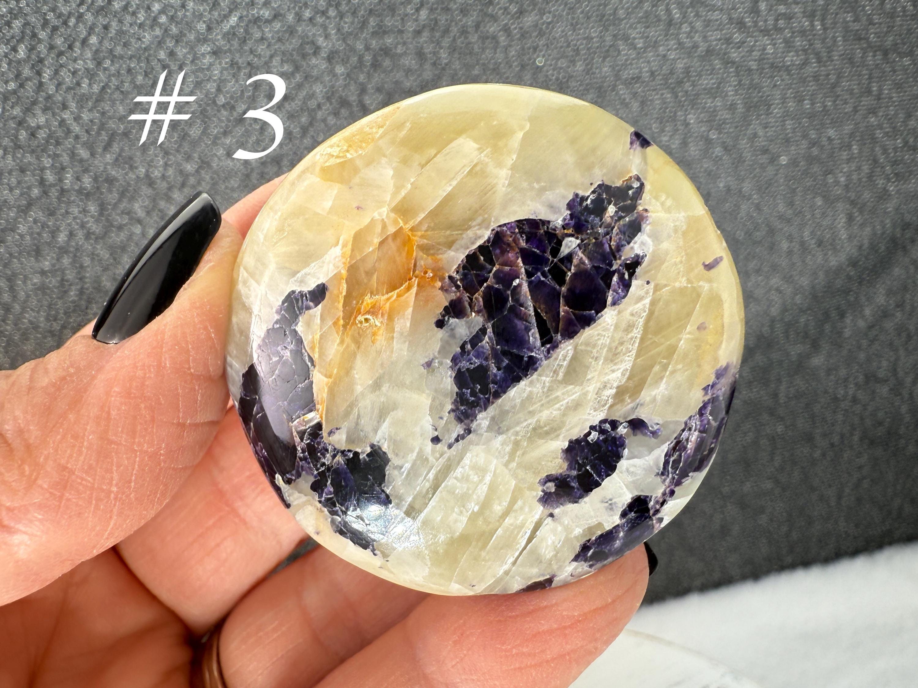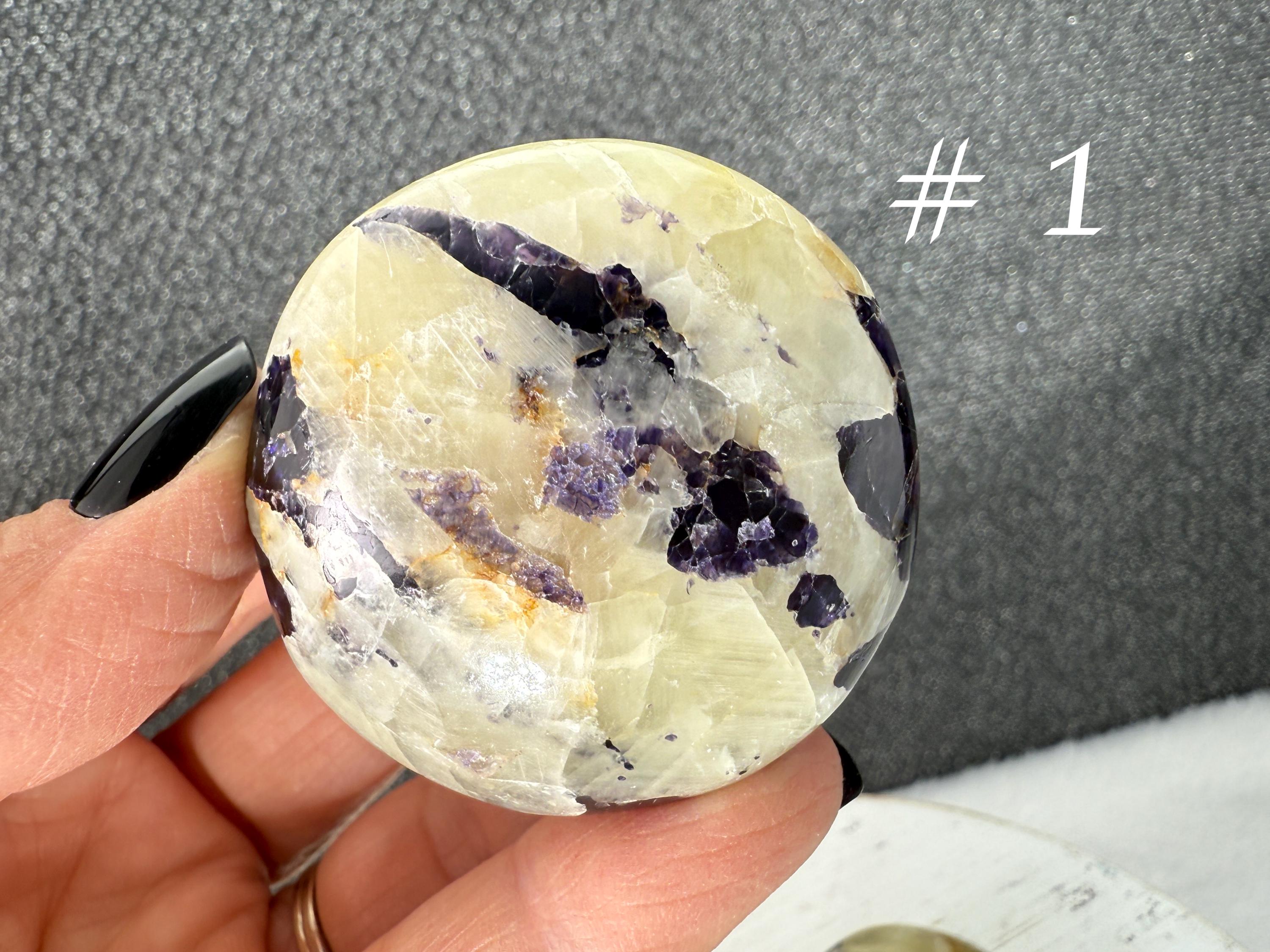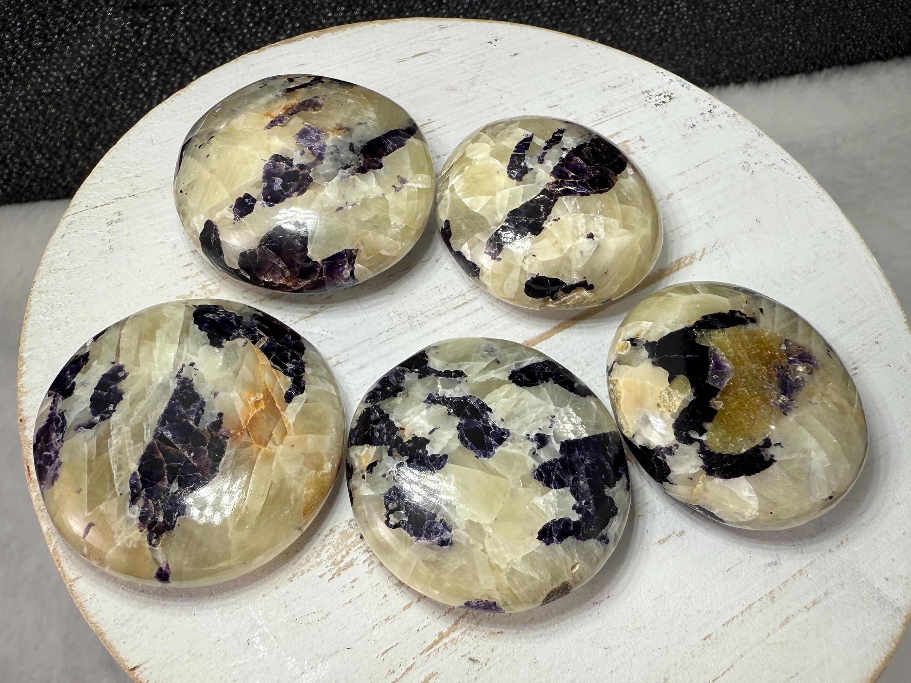 Add rich color and smooth texture to your collection with these beautiful Purple Haze Round Cookie Palm Stones. Each hand-polished piece features deep purple hues in yellow calcite, creating stunning natural contrast. The round “cookie” shape fits comfortably in your hand, making these stones perfect for display, pocket carrying, or gifting.