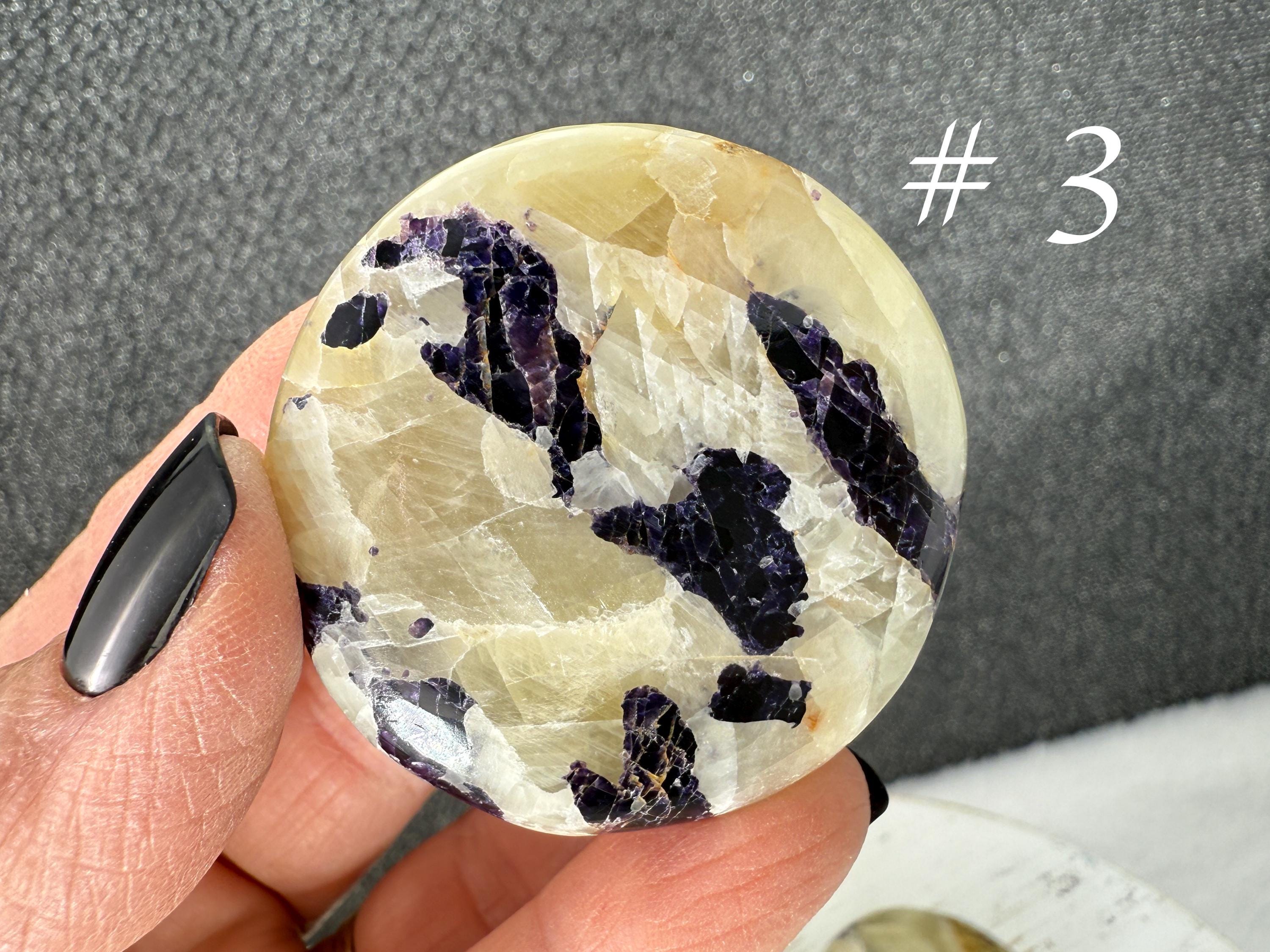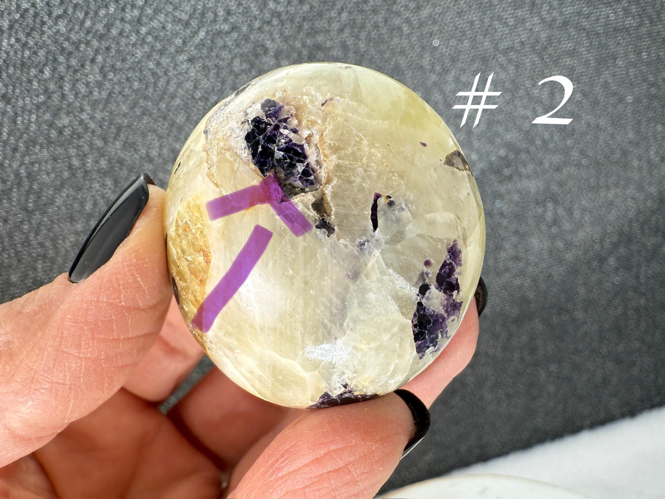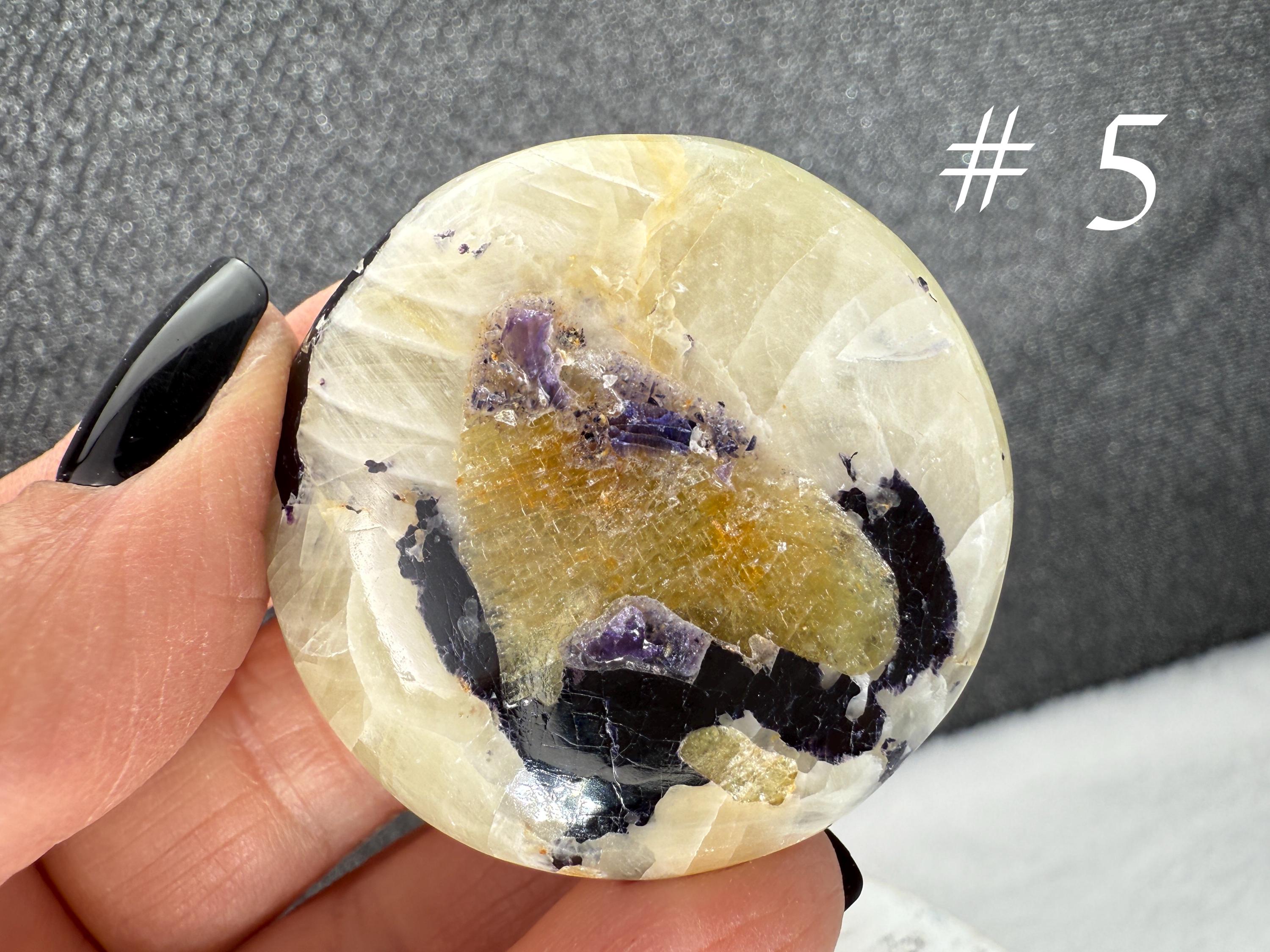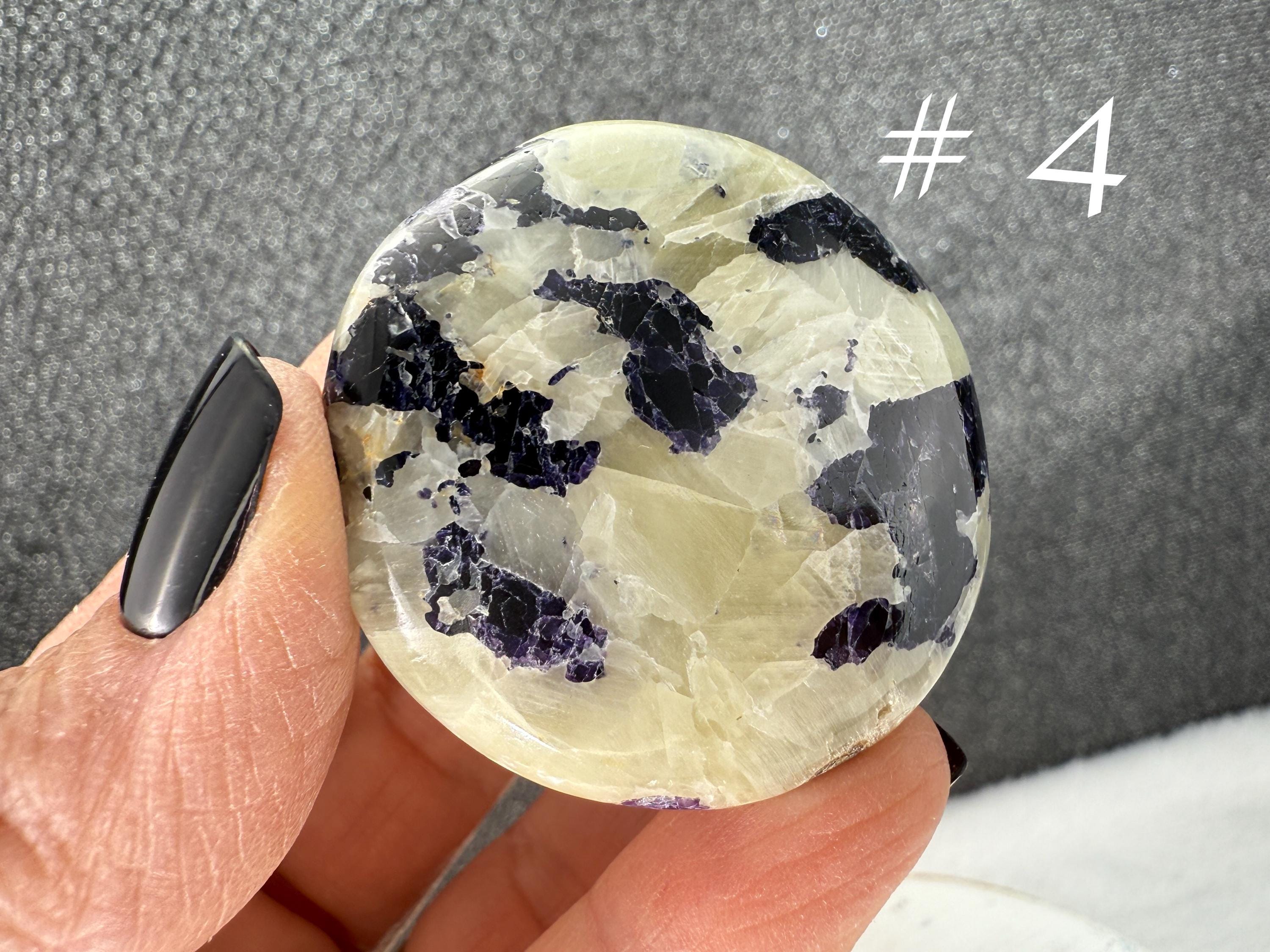 Add rich color and smooth texture to your collection with these beautiful Purple Haze Round Cookie Palm Stones. Each hand-polished piece features deep purple hues in yellow calcite, creating stunning natural contrast. The round “cookie” shape fits comfortably in your hand, making these stones perfect for display, pocket carrying, or gifting.