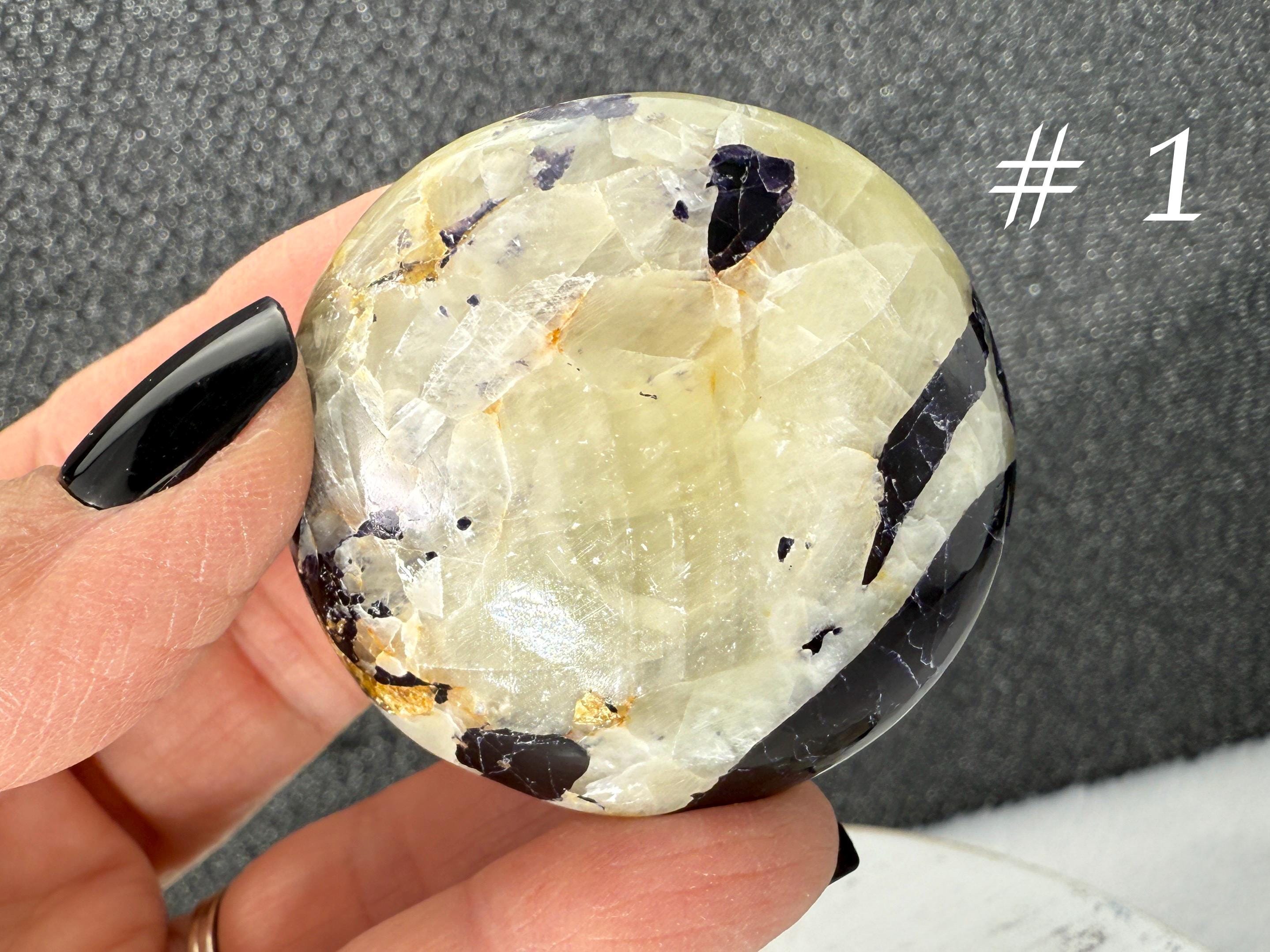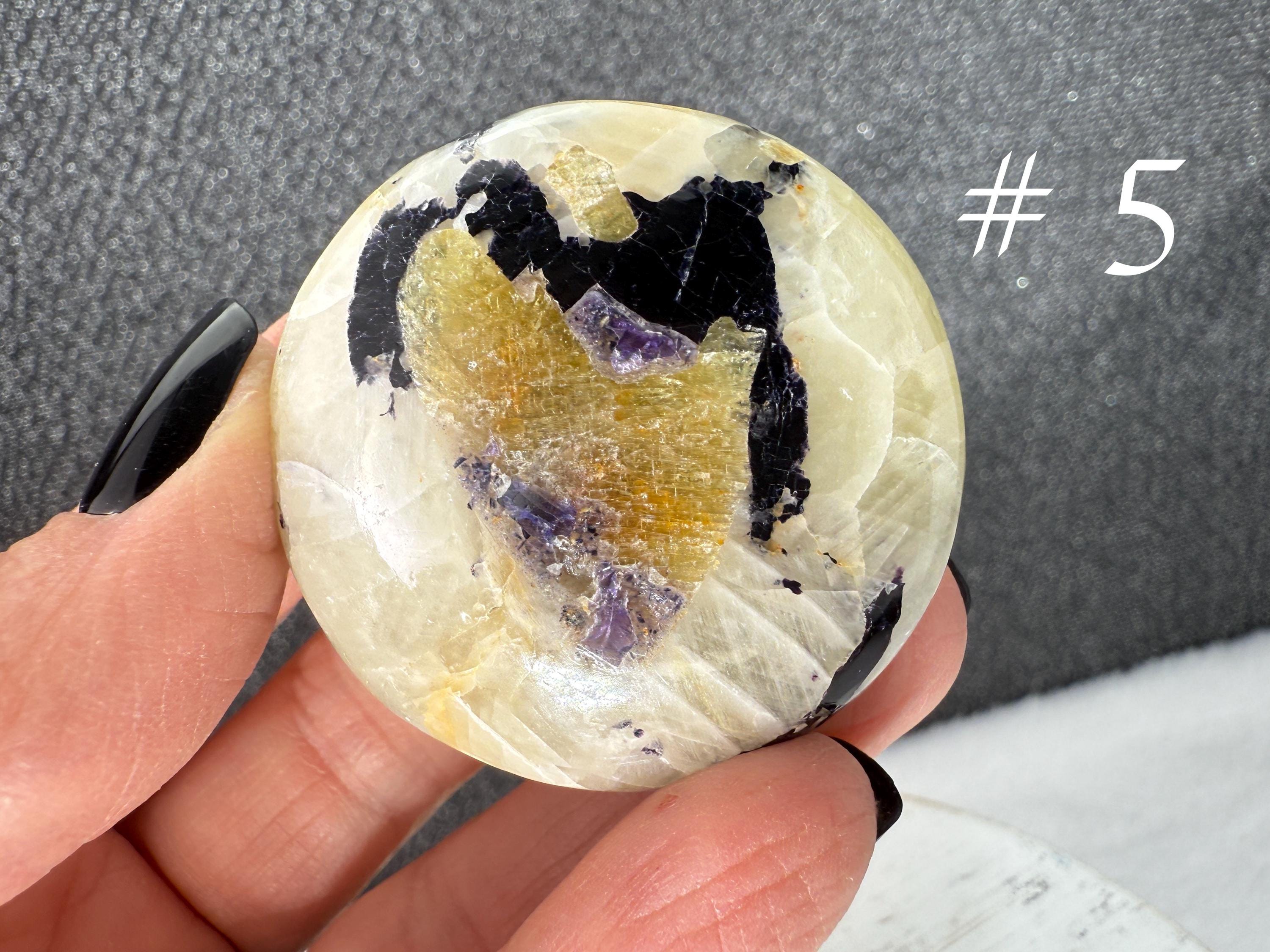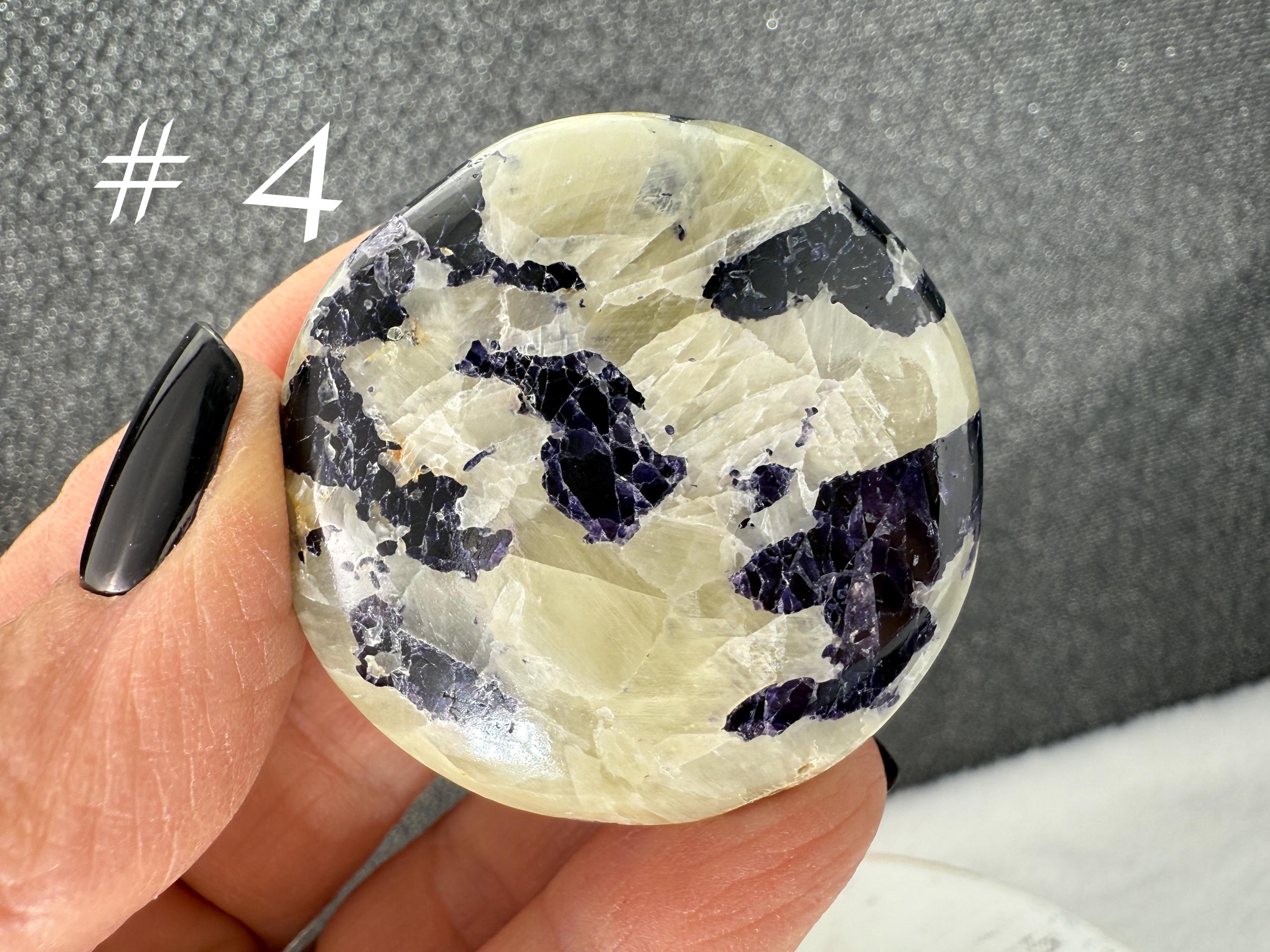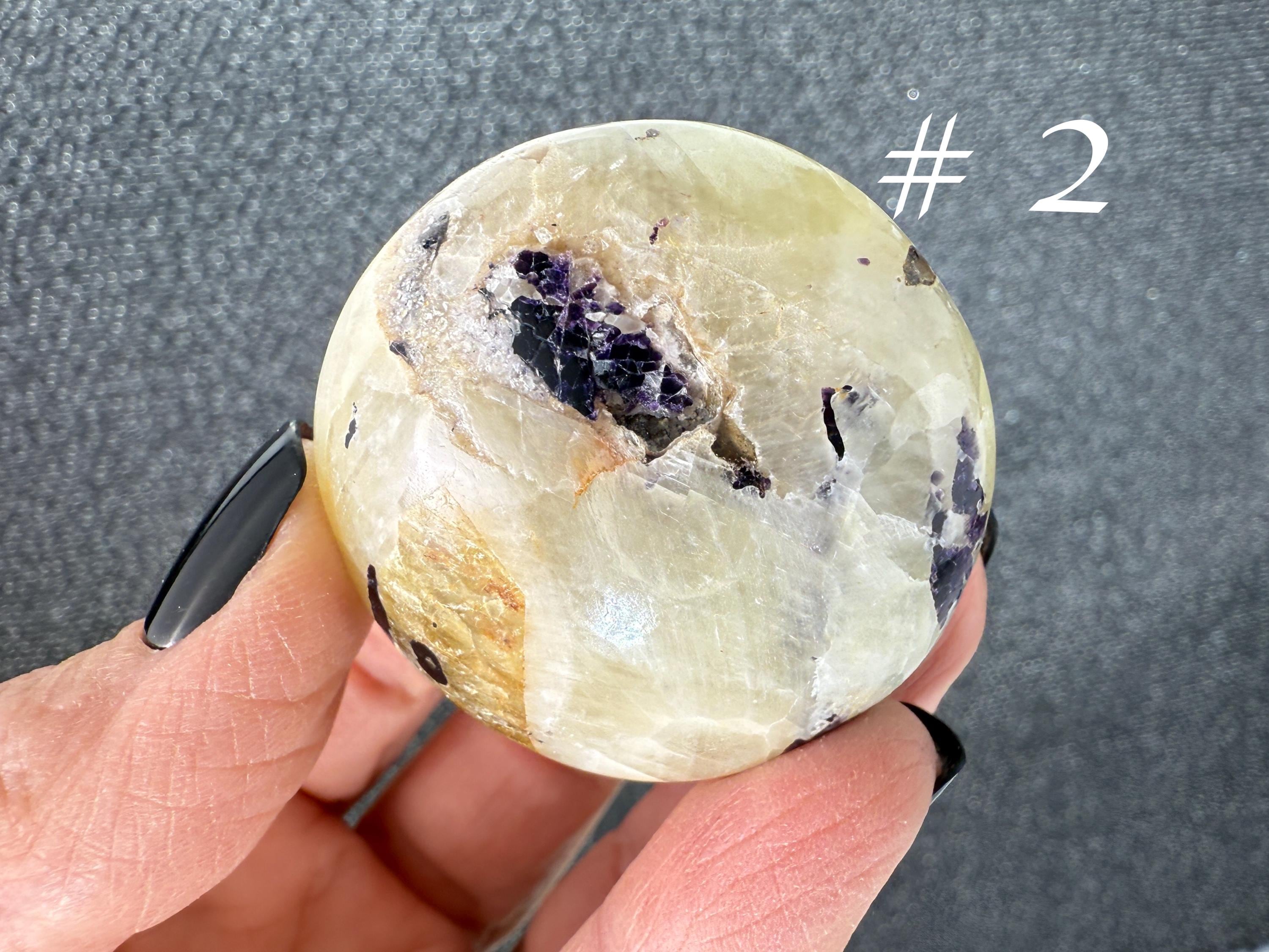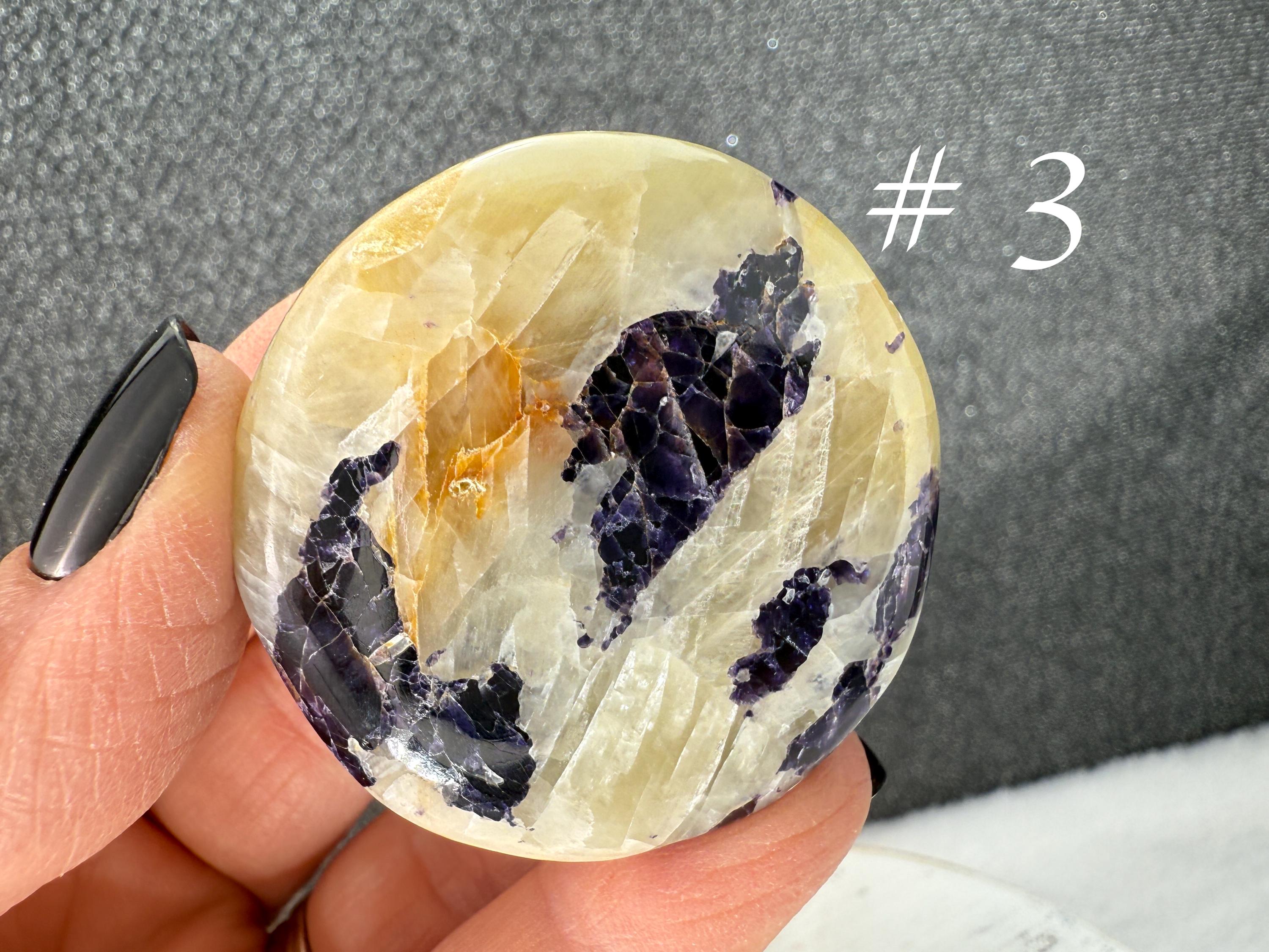 Add rich color and smooth texture to your collection with these beautiful Purple Haze Round Cookie Palm Stones. Each hand-polished piece features deep purple hues in yellow calcite, creating stunning natural contrast. The round “cookie” shape fits comfortably in your hand, making these stones perfect for display, pocket carrying, or gifting.